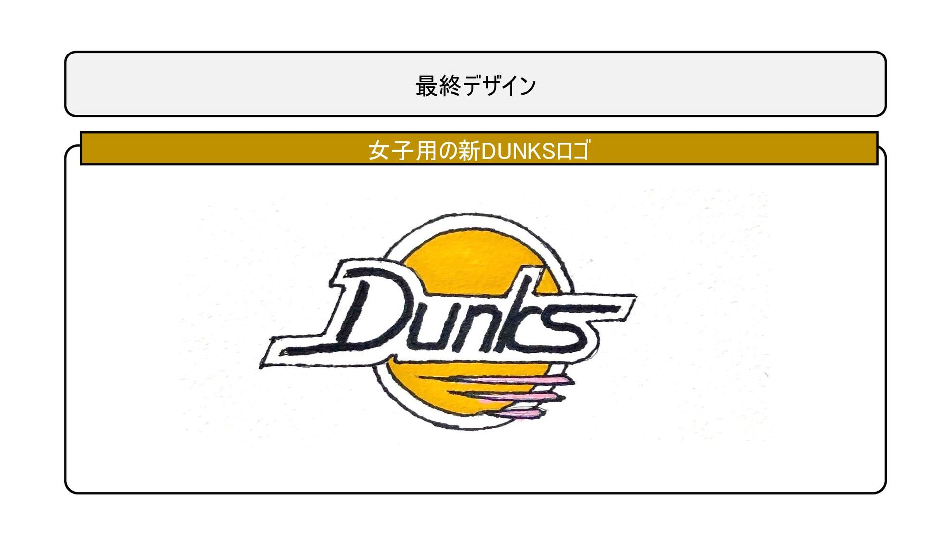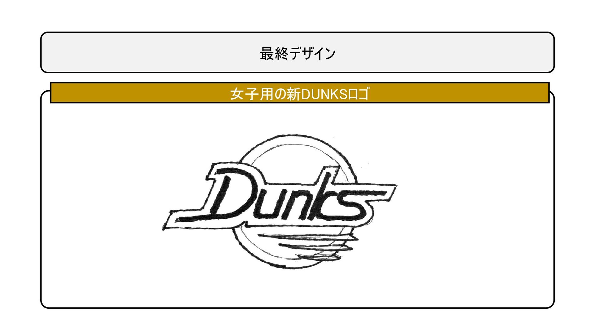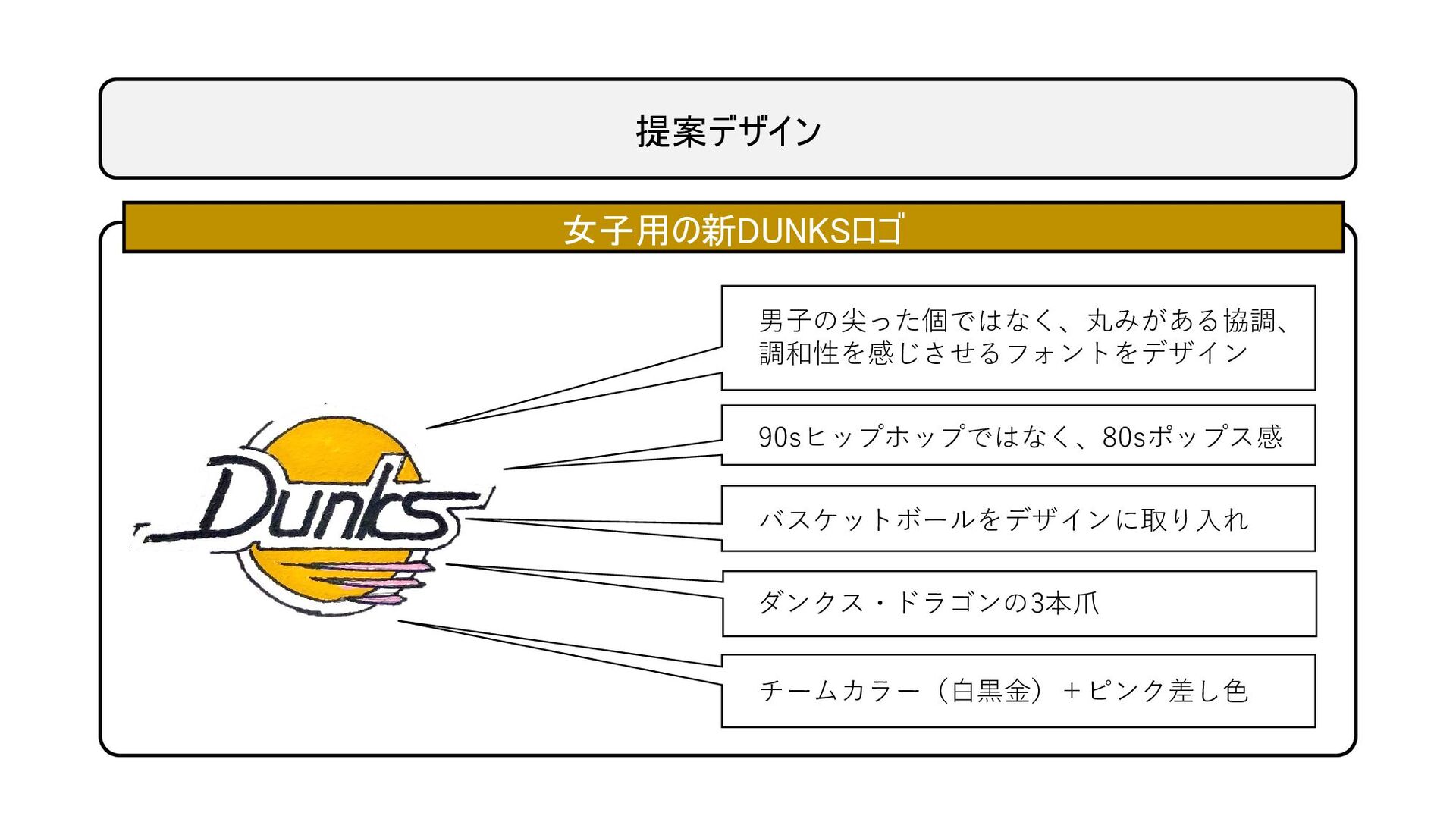 提案デザイン 女子用の新DUNKSロゴ バスケットボールをデザインに取り入れ 90sヒップホップではなく、80sポップス感 男子の尖った個ではなく、丸みがある協調、 調和性を感じさせるフォントをデザイン ダンクス・ドラゴンの3本爪 チームカラー(白黒金)+ピンク差し色