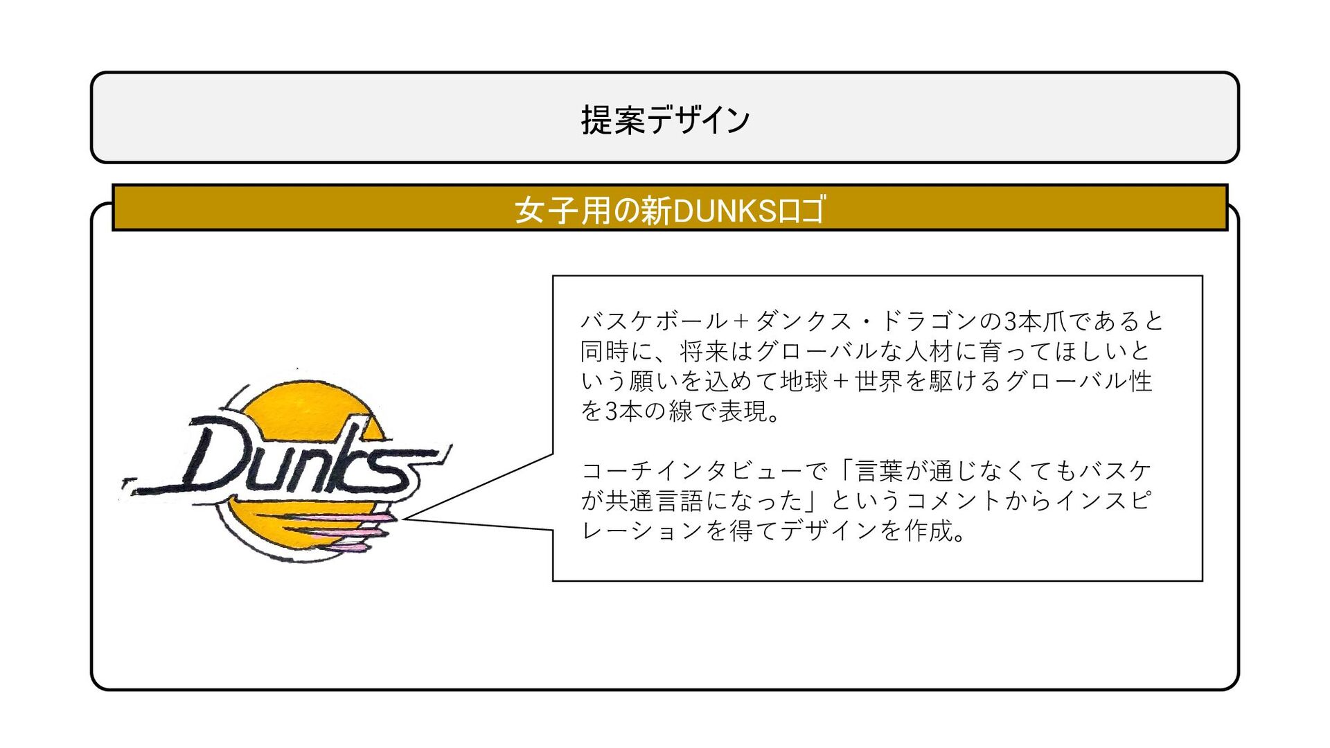 提案デザイン 女子用の新DUNKSロゴ バスケボール+ダンクス・ドラゴンの3本爪であると 同時に、将来はグローバルな人材に育ってほしいと いう願いを込めて地球+世界を駆けるグローバル性 を3本の線で表現。 コーチインタビューで「言葉が通じなくてもバスケ が共通言語になった」というコメントからインスピ レーションを得てデザインを作成。