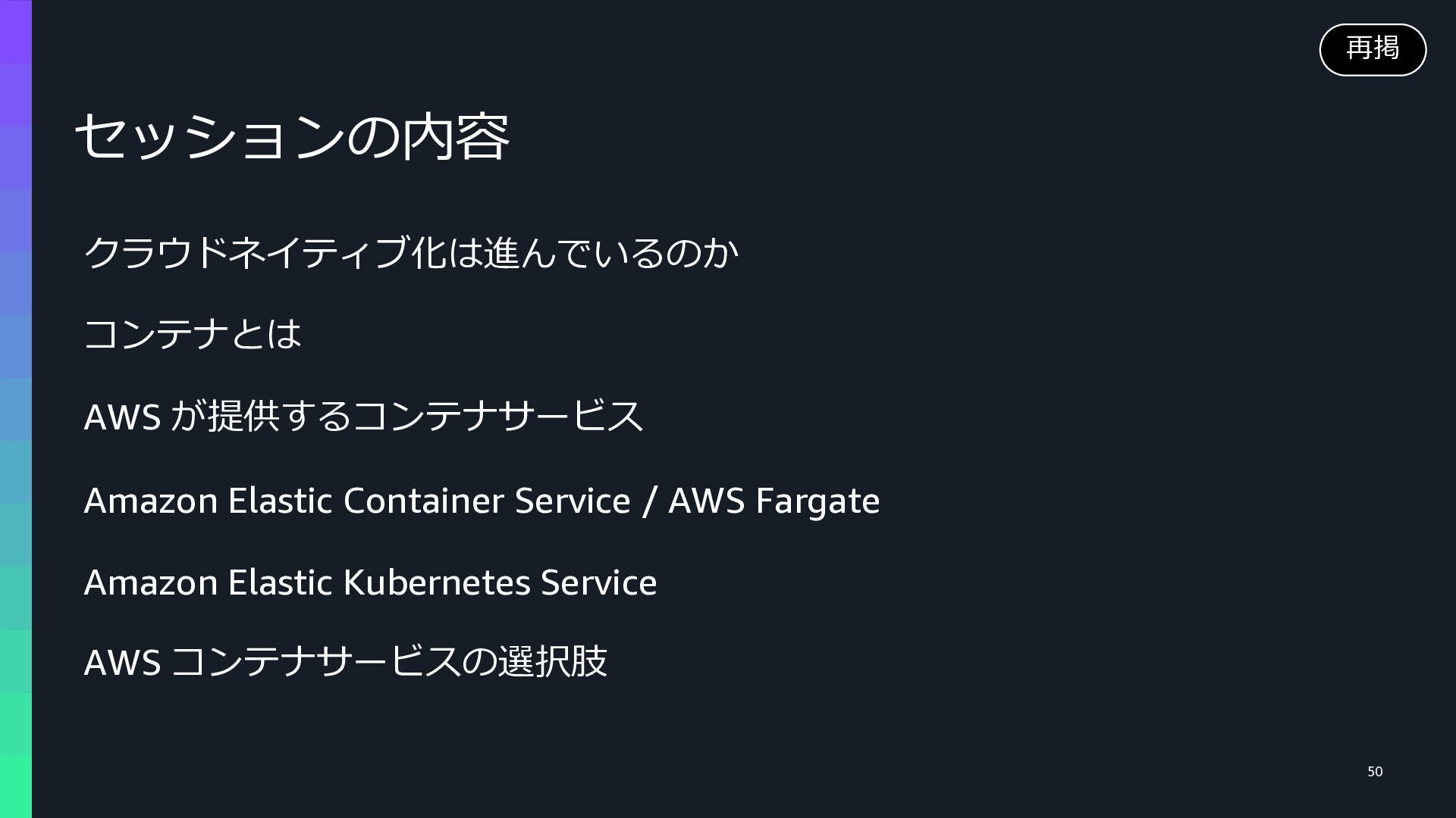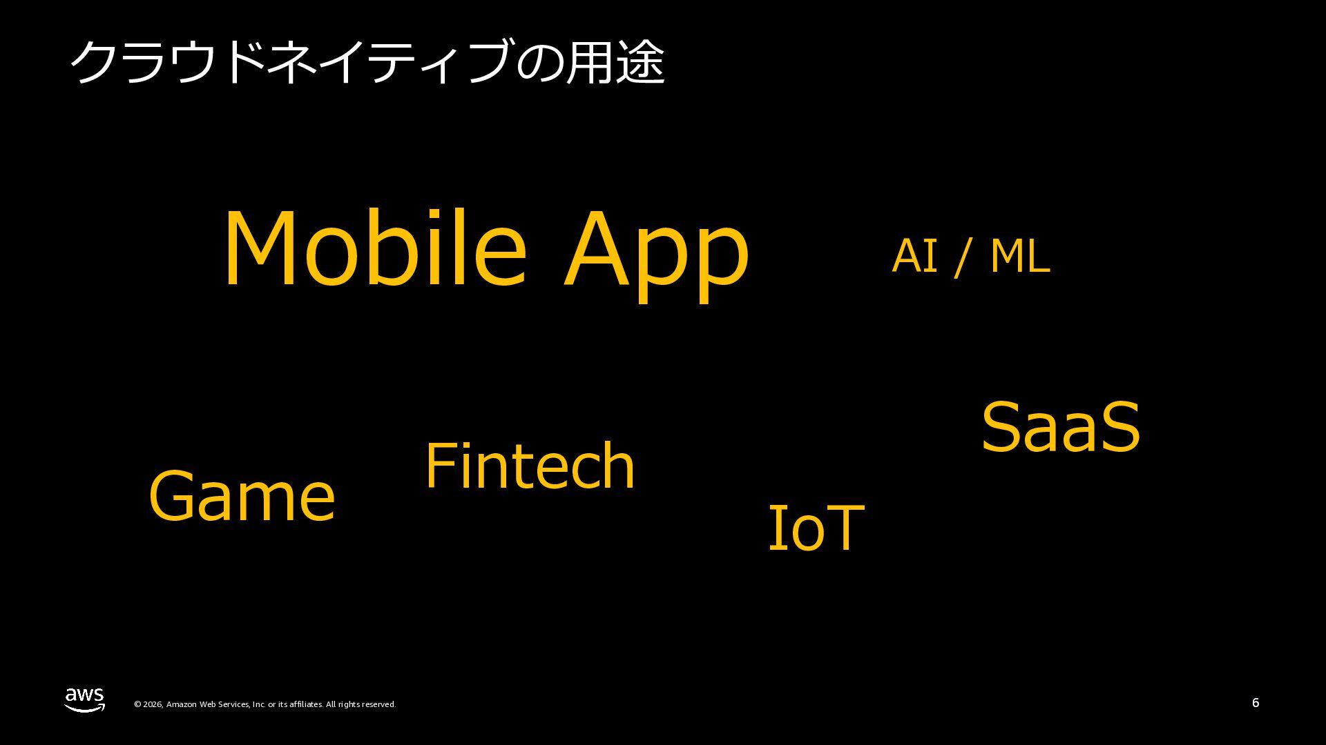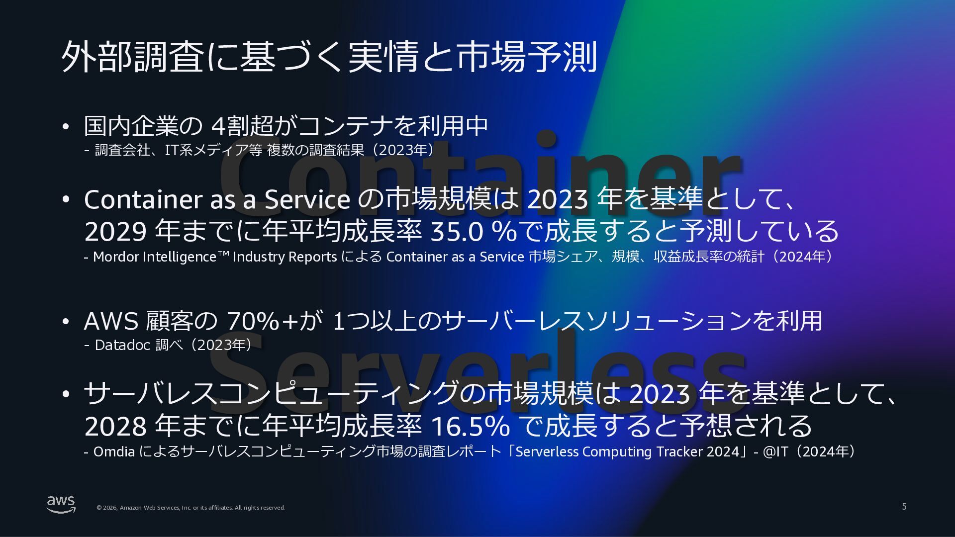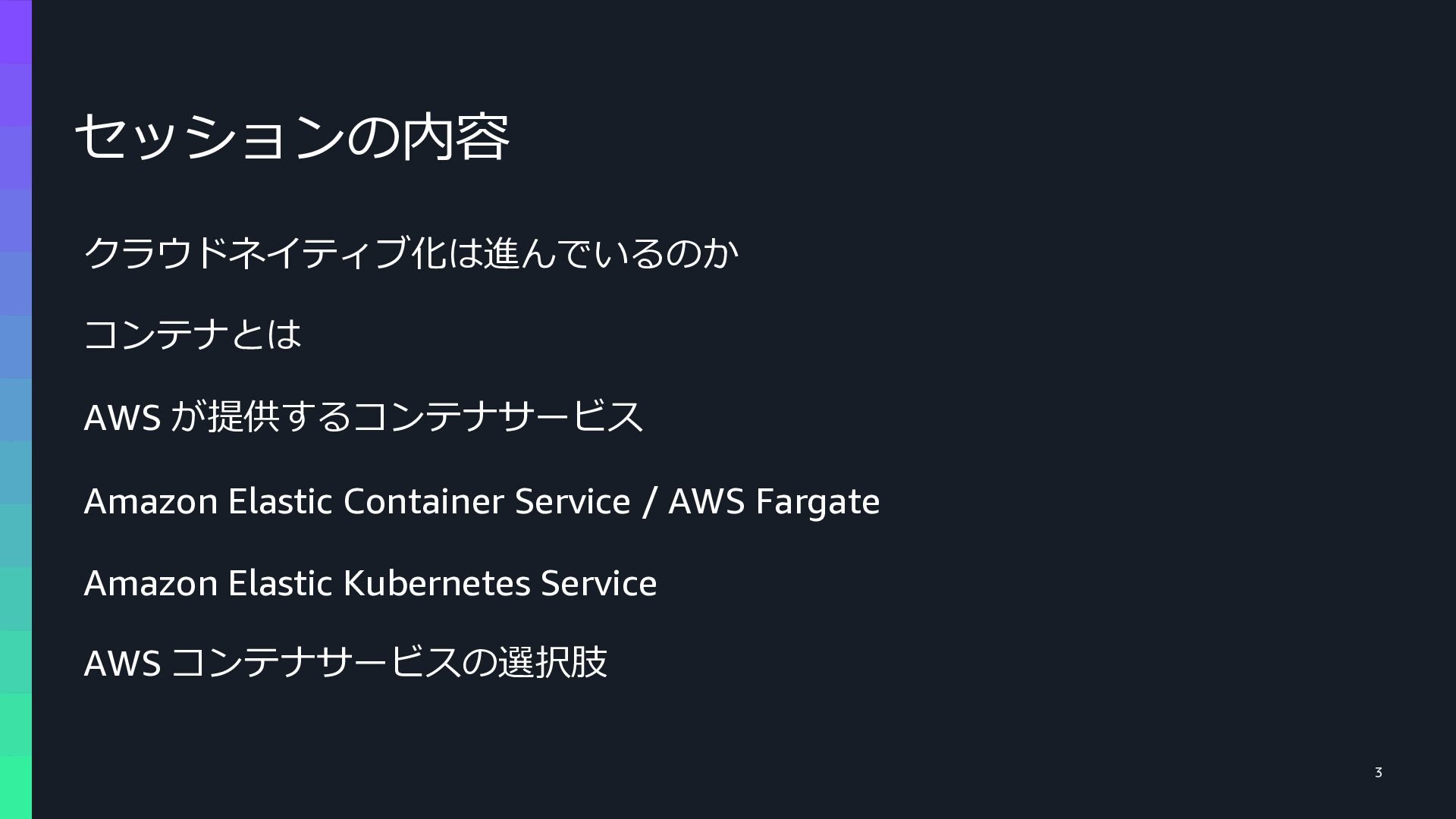 クラウドネイティブ市場の現状分析やコンテナ技術の基本概念を踏まえ、Amazon ECS / AWS Fargate / Amazon EKS、それぞれのサービスの特徴を含め、AWS がどのようなラインナップのコンテナサービスを提供しているのかを網羅的にご紹介します。更に、お客様のビジネス要件に応じた最適なサービス選択を支援するために、仮想サーバ / サーバレス / コンテナの各プラットフォームの違いや、AWS が提供する各コンテナサービス間の使い分けについて実践的な視点から説明します。