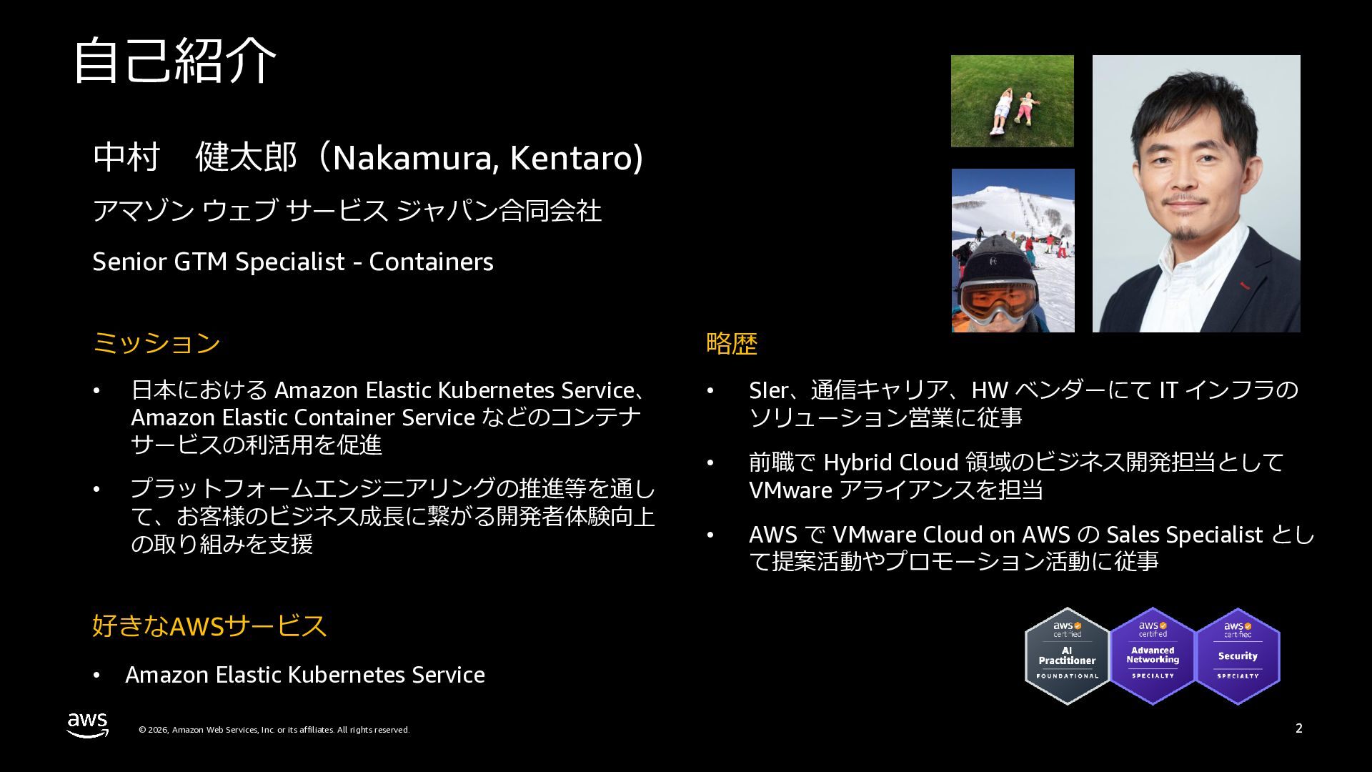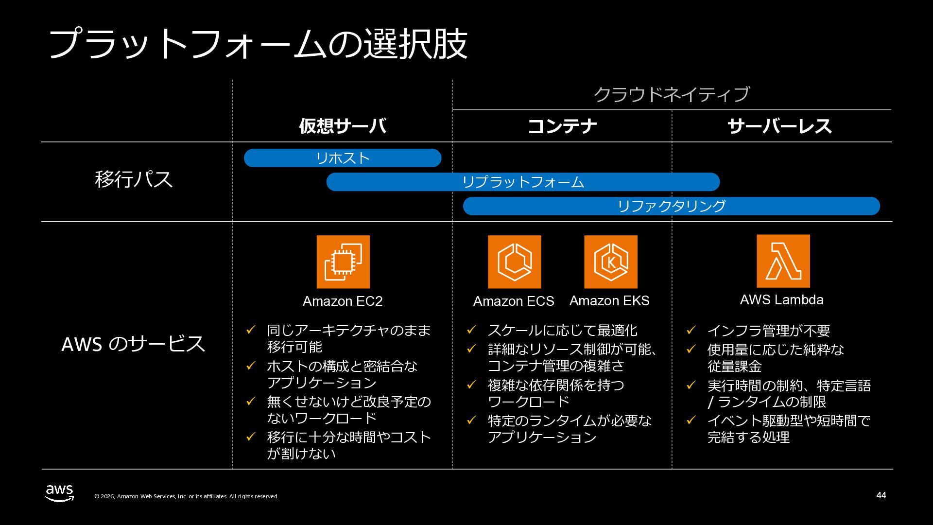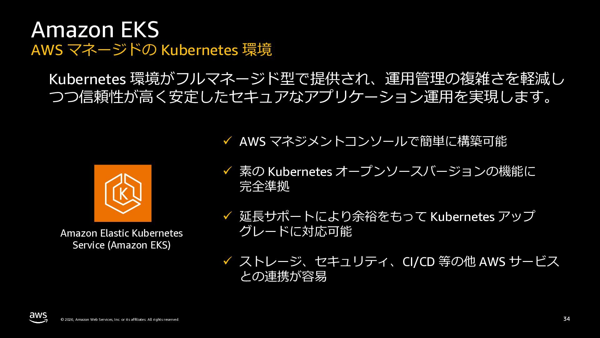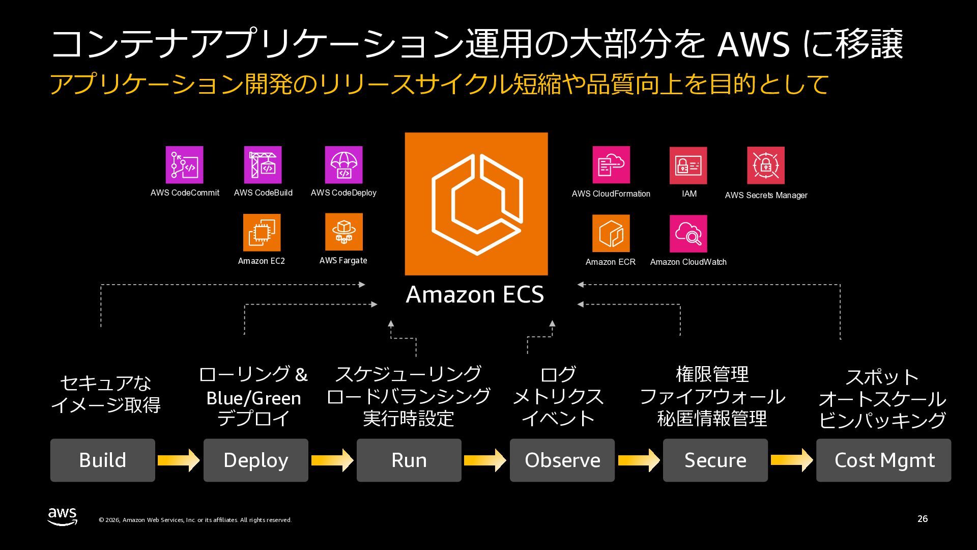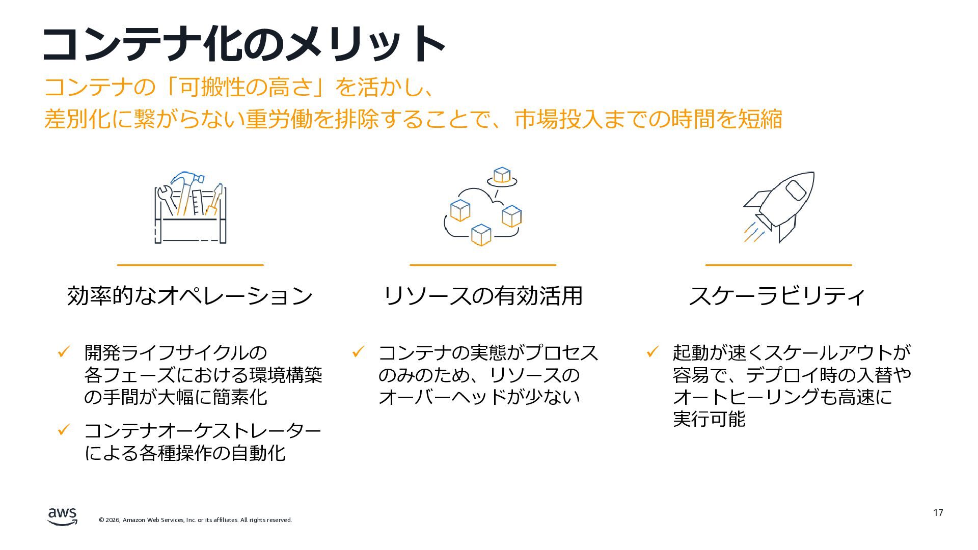 クラウドネイティブ市場の現状分析やコンテナ技術の基本概念を踏まえ、Amazon ECS / AWS Fargate / Amazon EKS、それぞれのサービスの特徴を含め、AWS がどのようなラインナップのコンテナサービスを提供しているのかを網羅的にご紹介します。更に、お客様のビジネス要件に応じた最適なサービス選択を支援するために、仮想サーバ / サーバレス / コンテナの各プラットフォームの違いや、AWS が提供する各コンテナサービス間の使い分けについて実践的な視点から説明します。