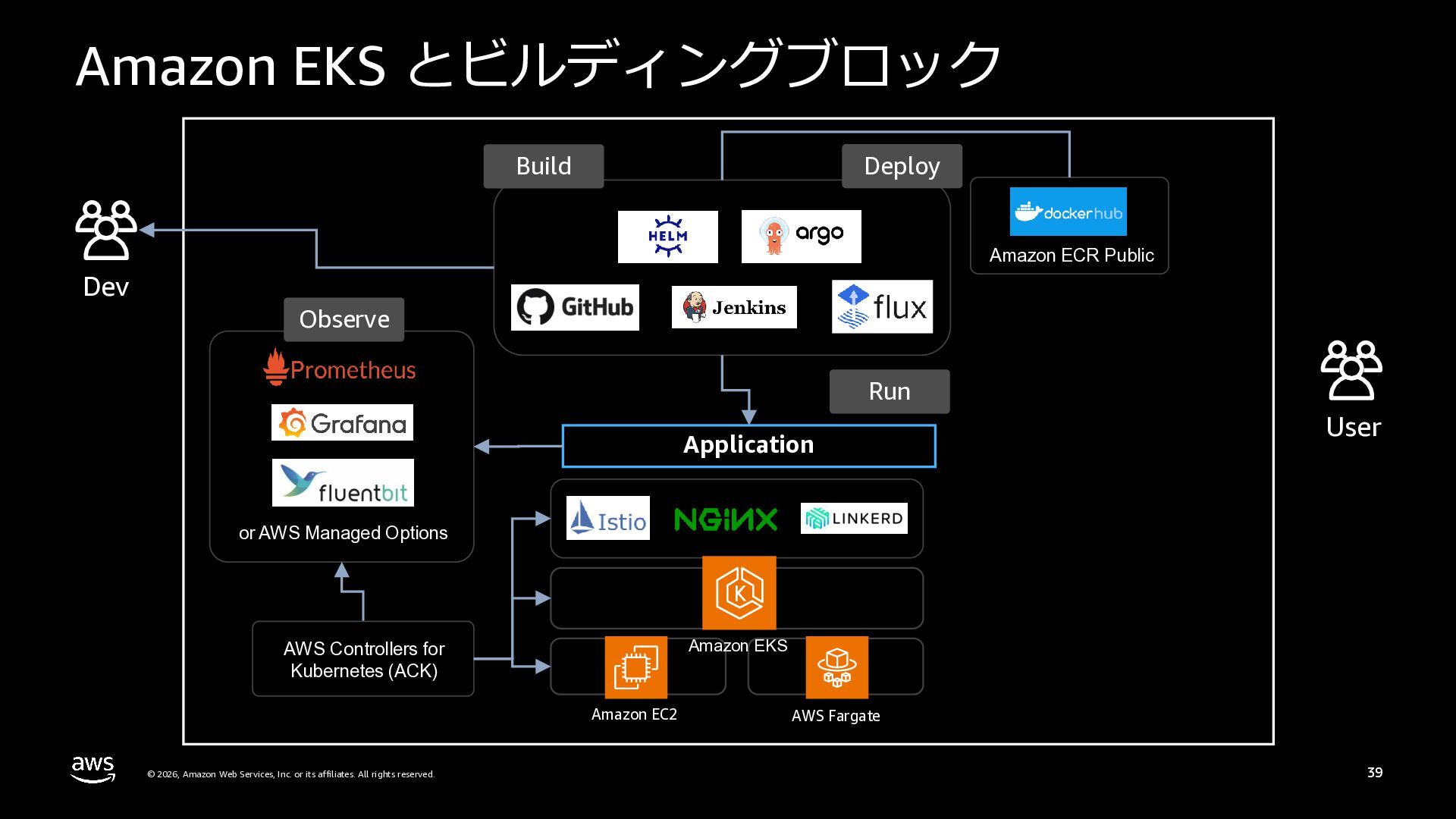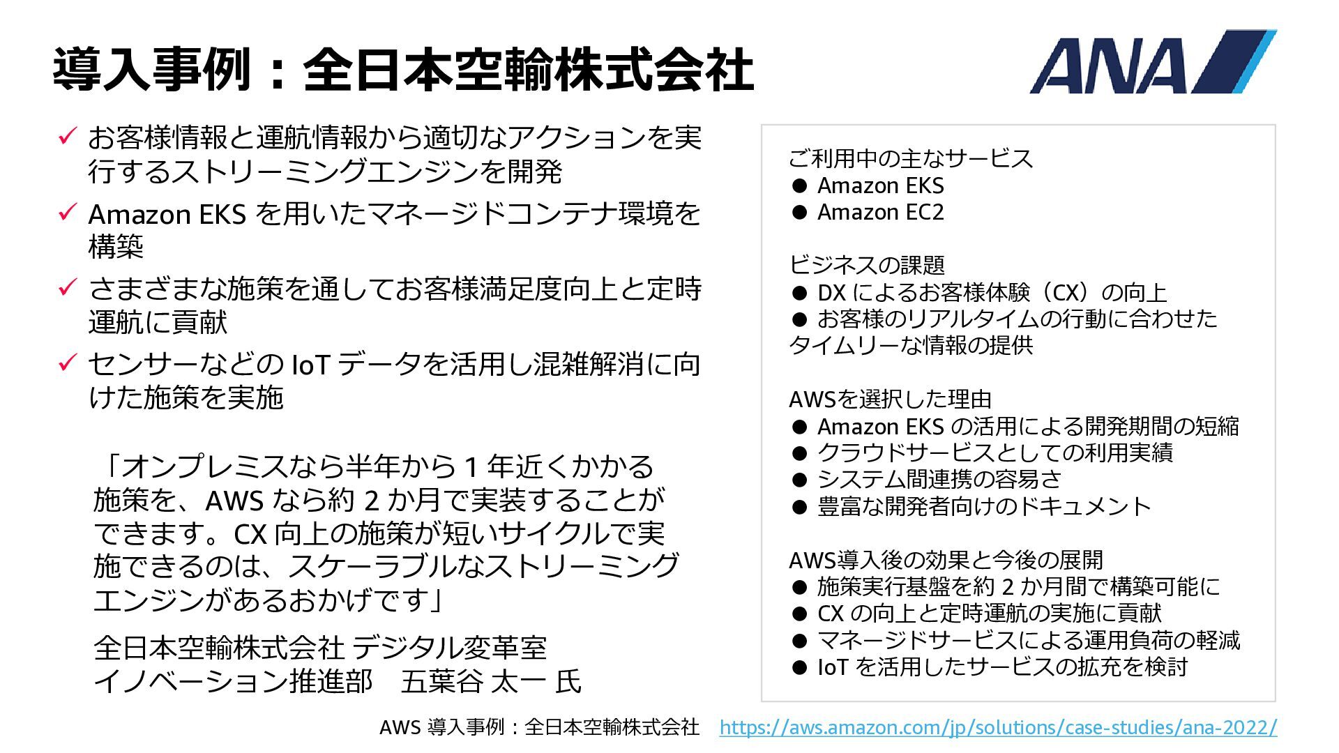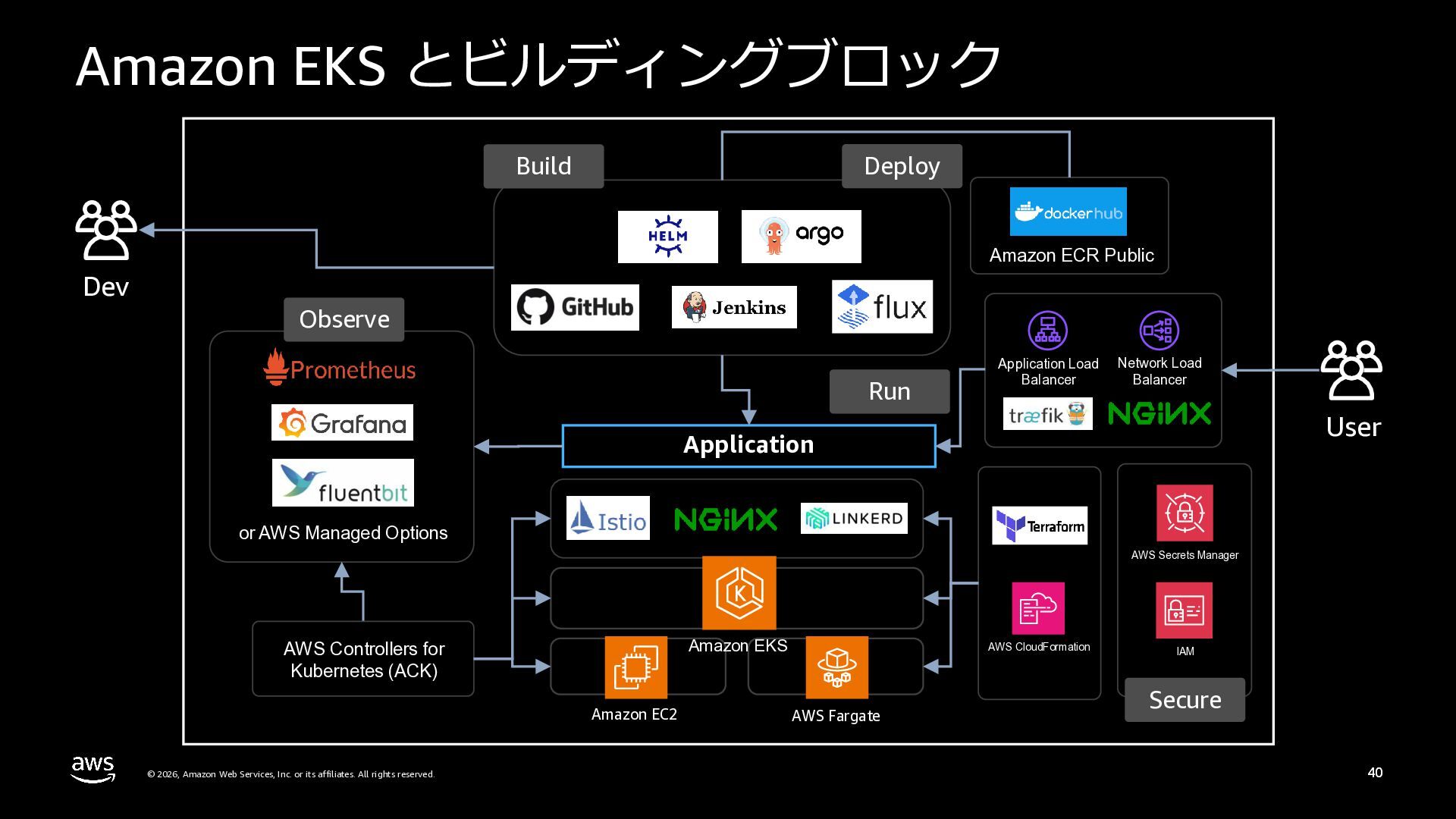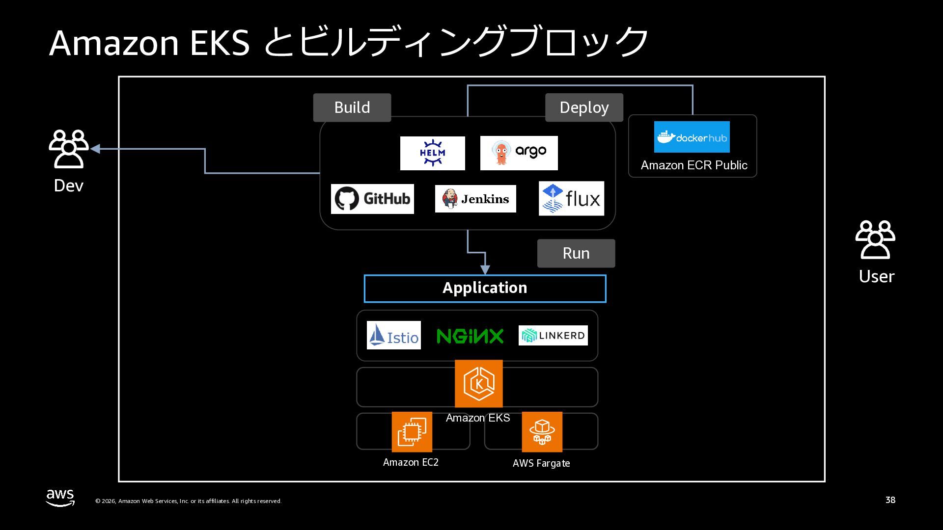クラウドネイティブ市場の現状分析やコンテナ技術の基本概念を踏まえ、Amazon ECS / AWS Fargate / Amazon EKS、それぞれのサービスの特徴を含め、AWS がどのようなラインナップのコンテナサービスを提供しているのかを網羅的にご紹介します。更に、お客様のビジネス要件に応じた最適なサービス選択を支援するために、仮想サーバ / サーバレス / コンテナの各プラットフォームの違いや、AWS が提供する各コンテナサービス間の使い分けについて実践的な視点から説明します。