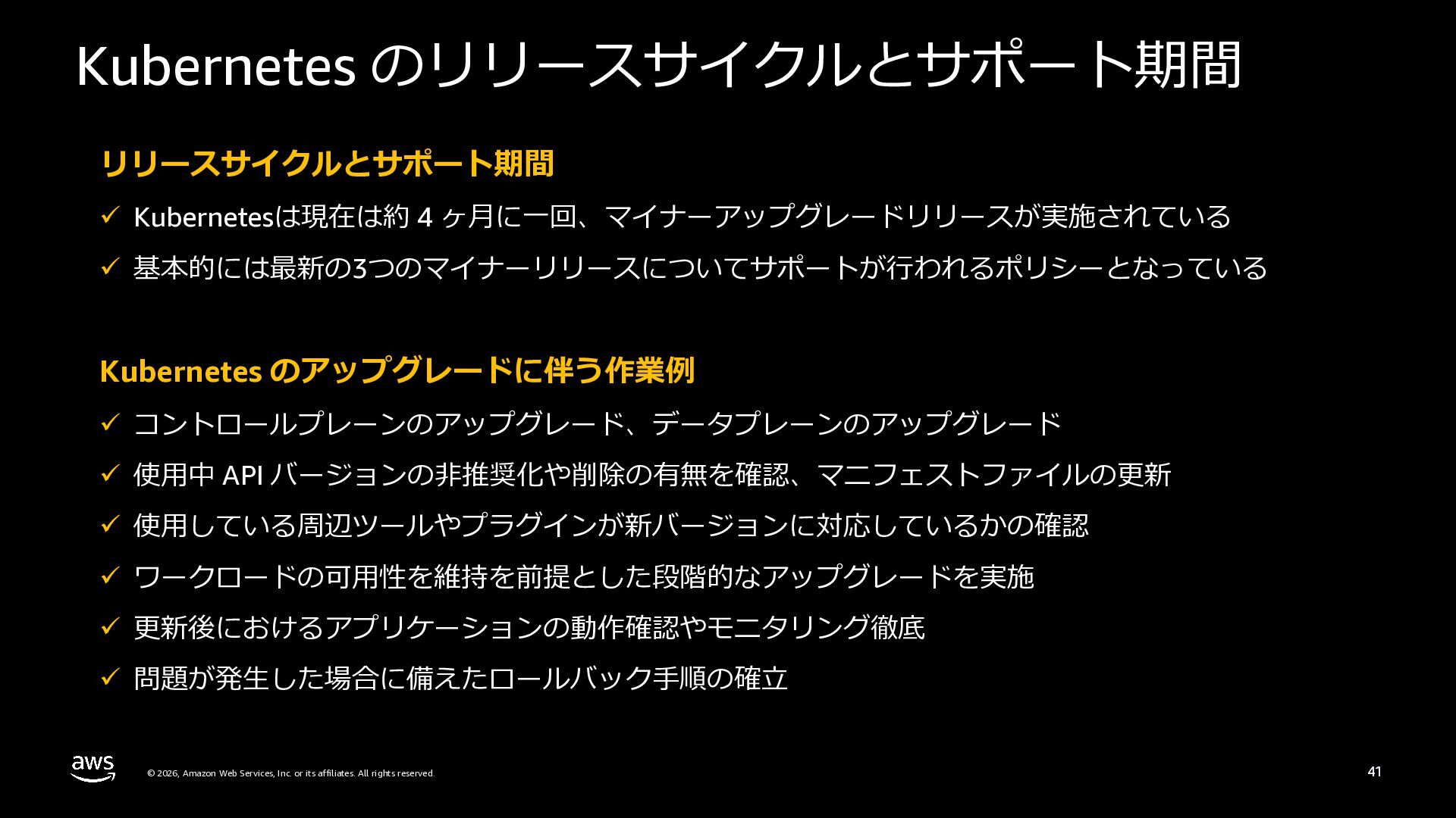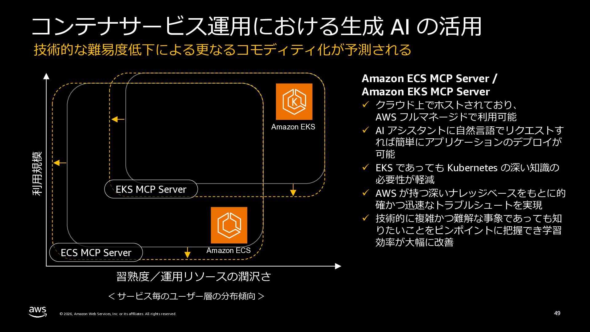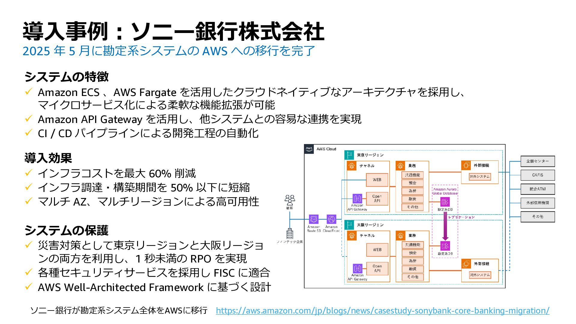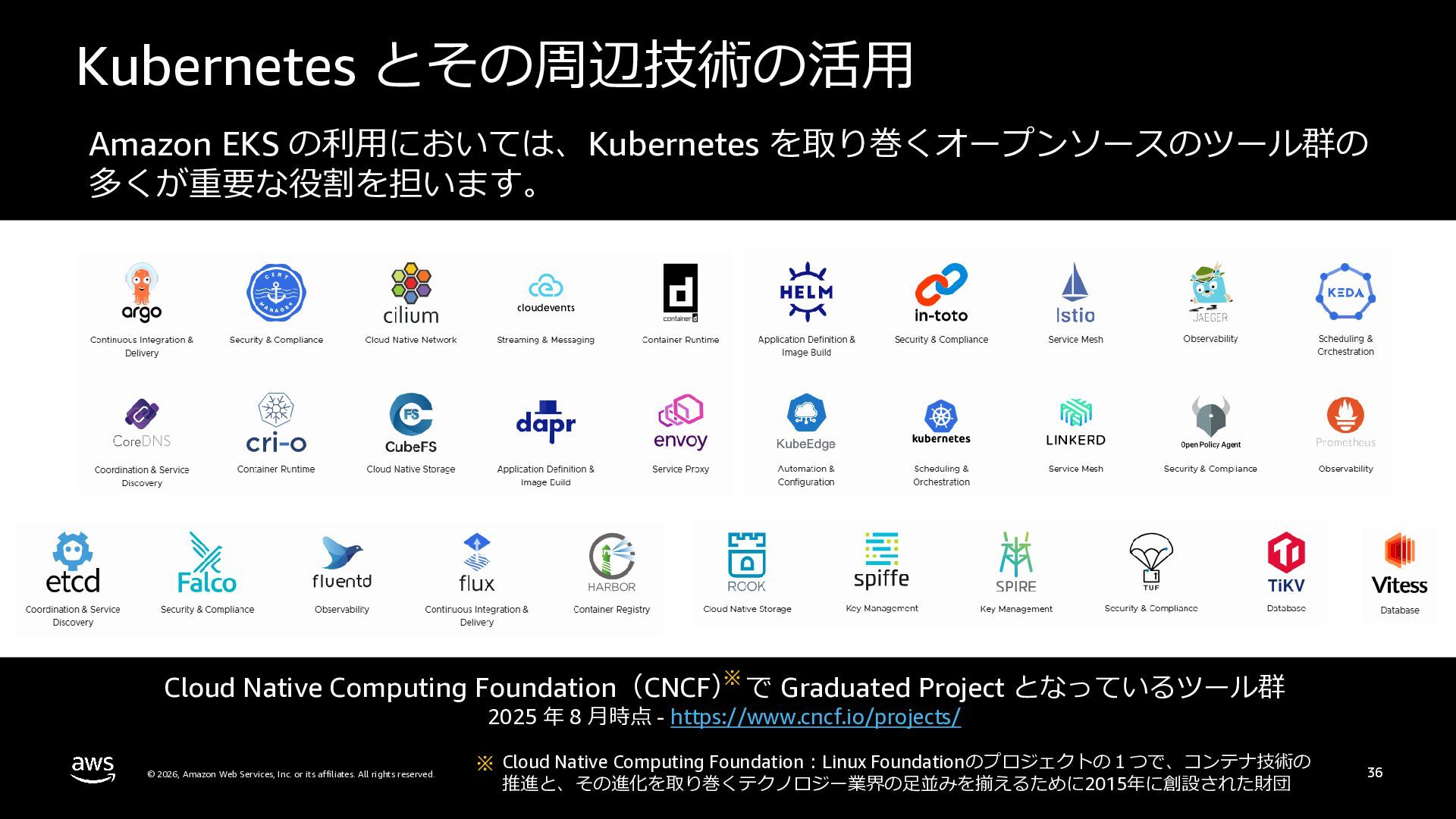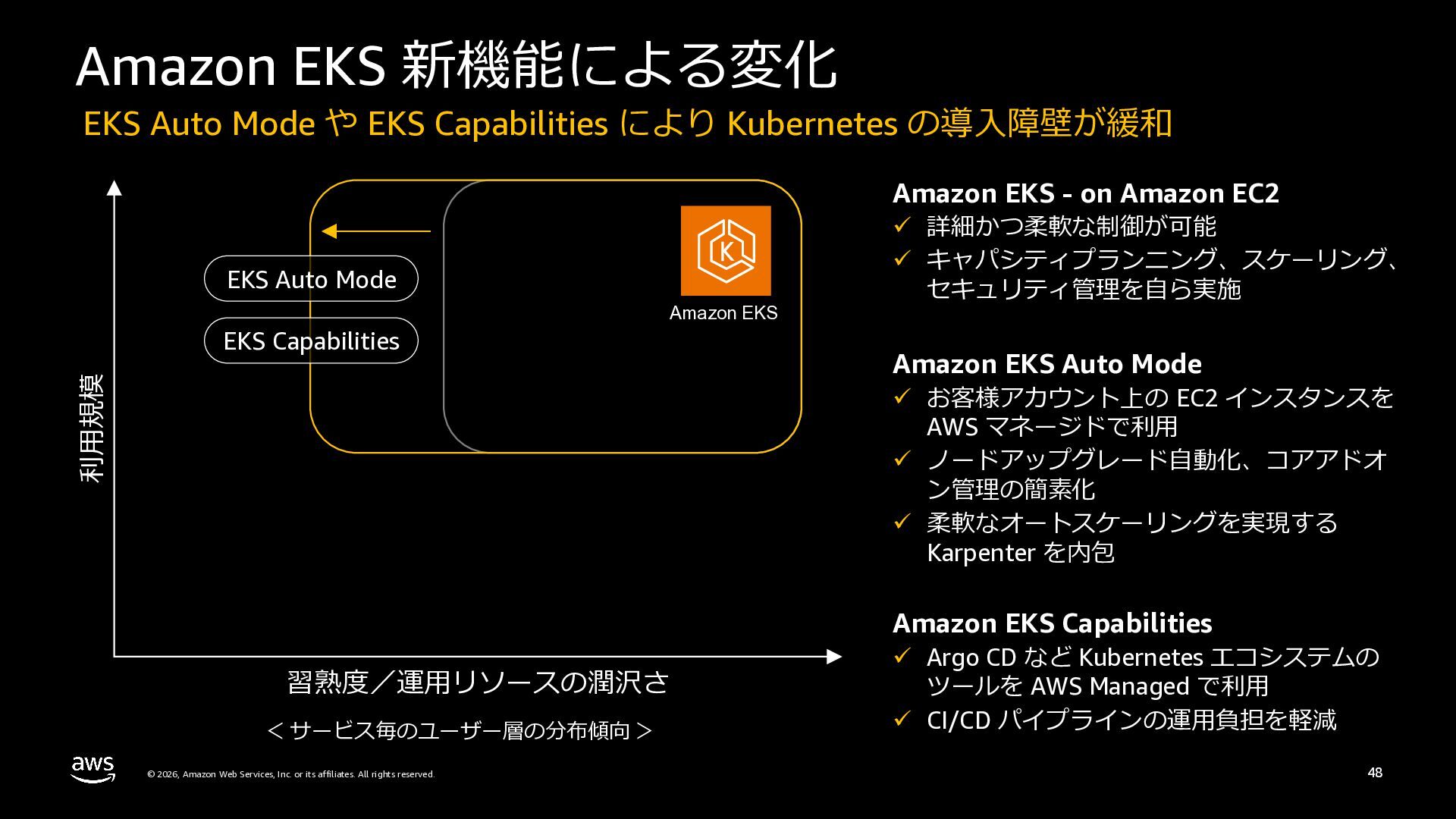 クラウドネイティブ市場の現状分析やコンテナ技術の基本概念を踏まえ、Amazon ECS / AWS Fargate / Amazon EKS、それぞれのサービスの特徴を含め、AWS がどのようなラインナップのコンテナサービスを提供しているのかを網羅的にご紹介します。更に、お客様のビジネス要件に応じた最適なサービス選択を支援するために、仮想サーバ / サーバレス / コンテナの各プラットフォームの違いや、AWS が提供する各コンテナサービス間の使い分けについて実践的な視点から説明します。