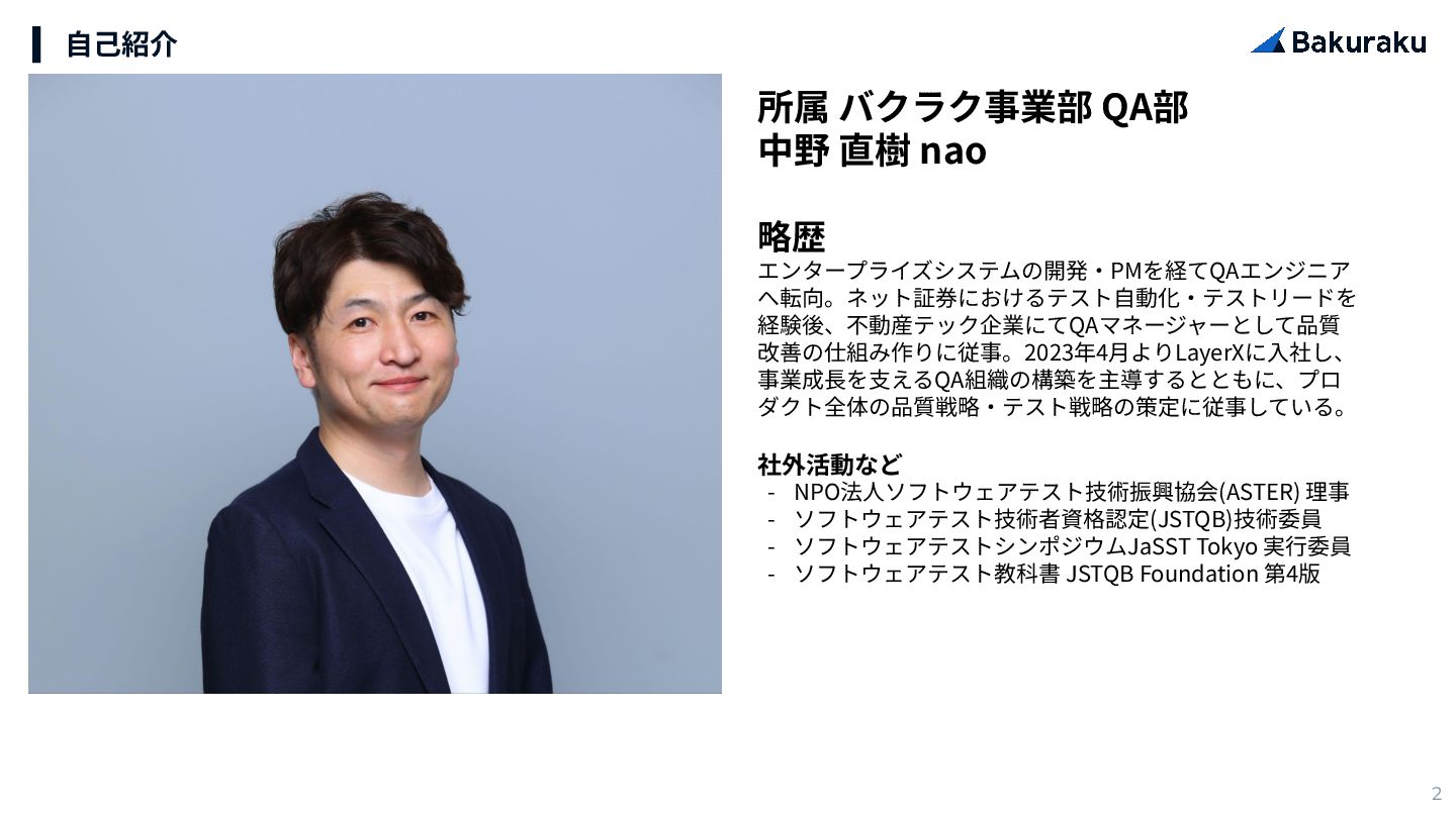 2 所属 バクラク事業部 QA部 中野 直樹 nao 略歴 エンタープライズシステムの開発‧PMを経てQAエンジニア へ転向。ネット証券におけるテスト⾃動化‧テストリードを