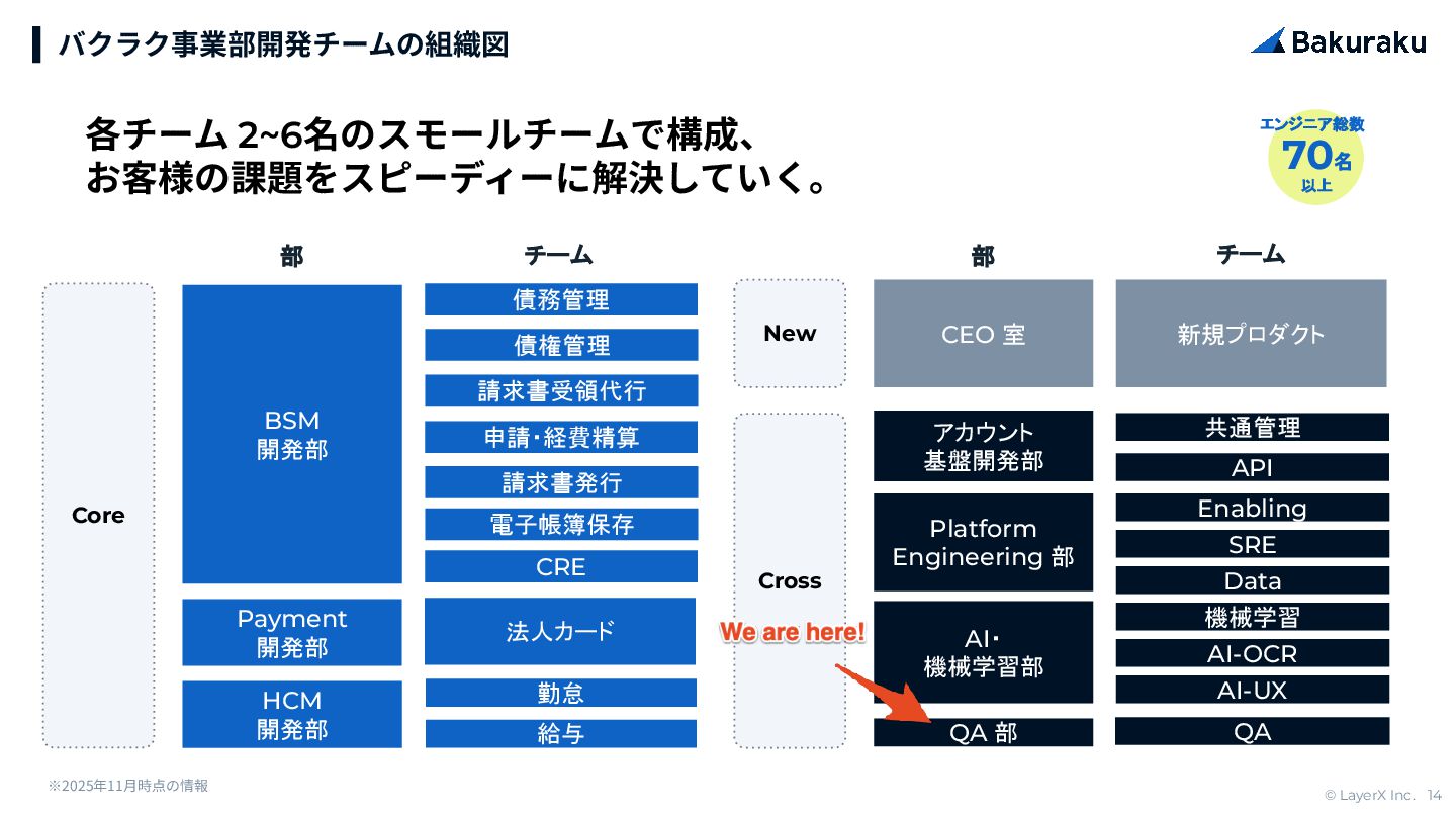 法人カード 債務管理 申請・経費精算 電子帳簿保存 請求書発行 勤怠 チーム HCM 開発部 請求書受領代行 債権管理 給与 CRE Core 部 チーム アカウント 基盤開発部 共通管理 QA 部 QA Cross API AI・ 機械学習部 機械学習 AI-OCR AI-UX Enabling SRE Platform Engineering 部 Data CEO 室 New 各チーム 2~6名のスモールチームで構成、 お客様の課題をスピーディーに解決していく。 ※2025年11⽉時点の情報 70名 以上 エンジニア総数 新規プロダクト