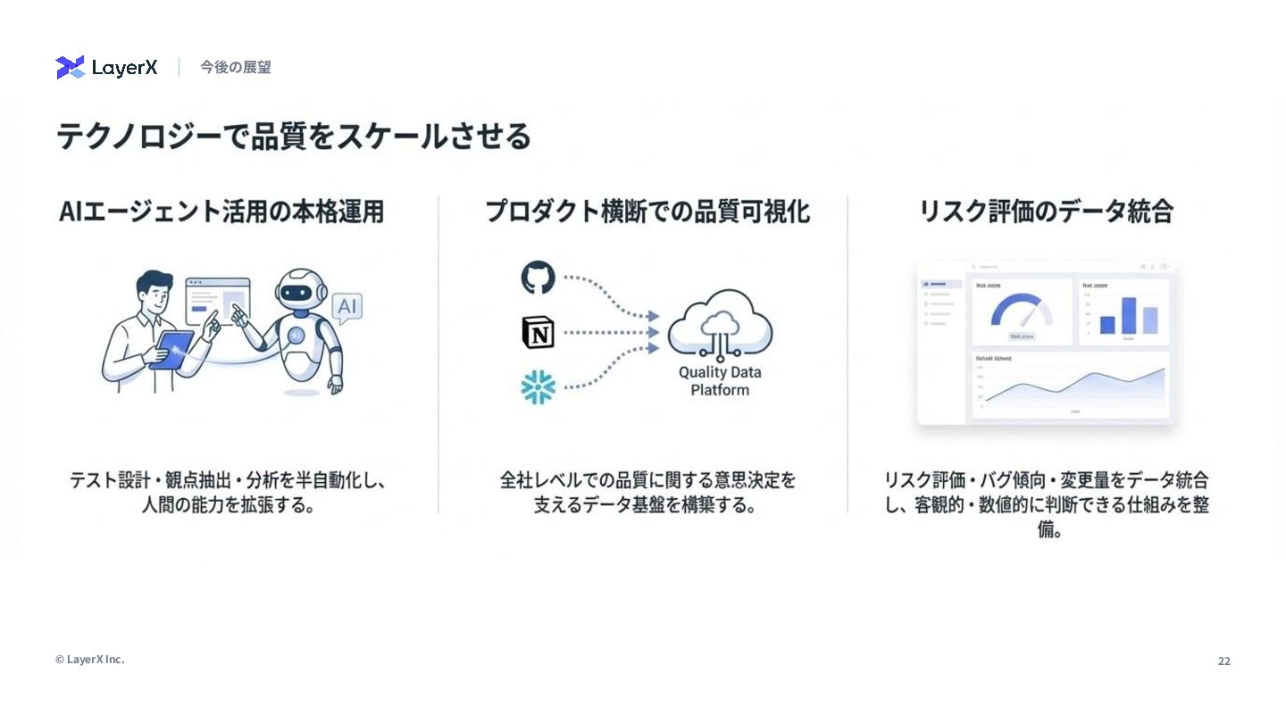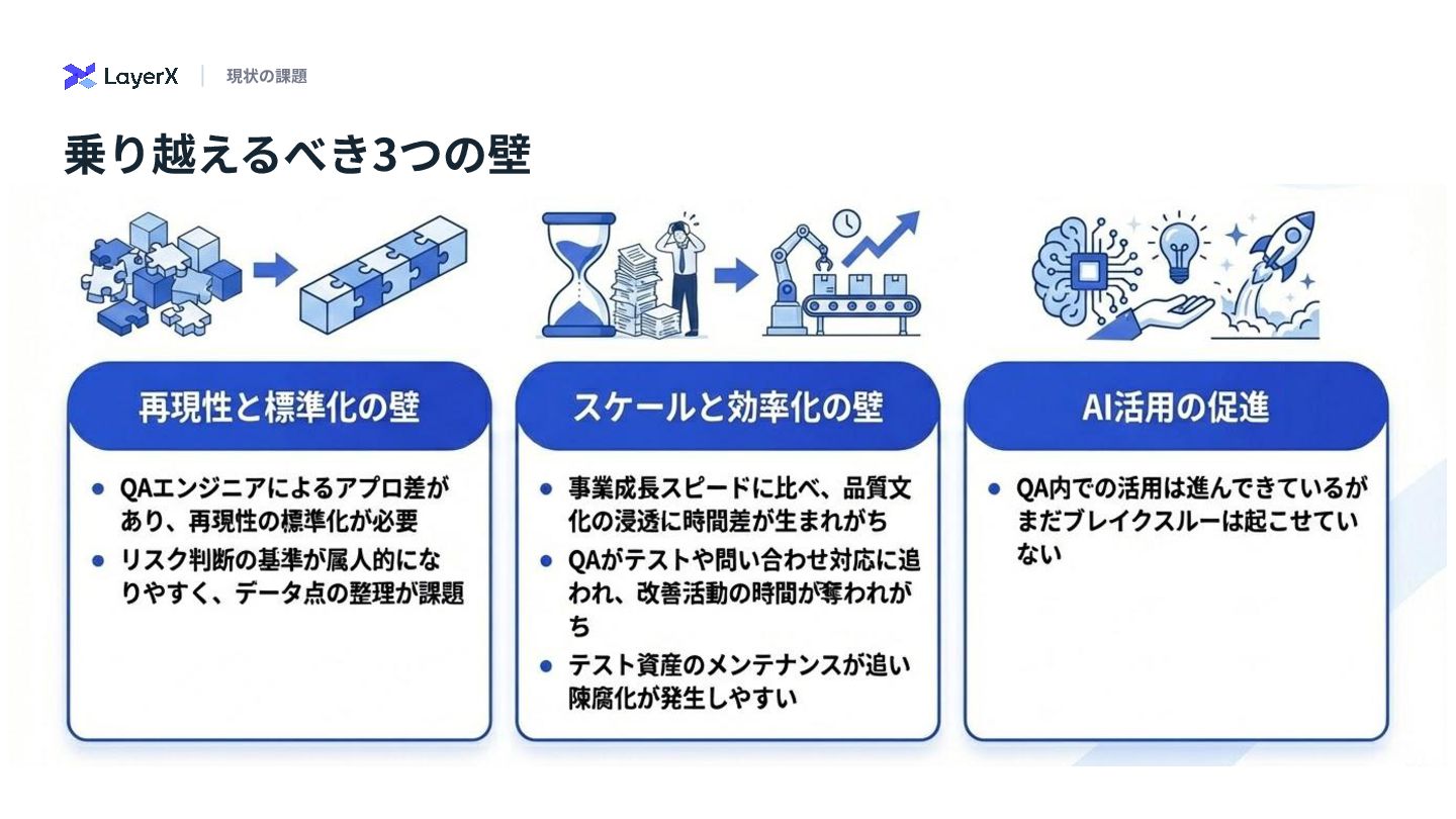 QAがテストや問い合わ せ対応に追われ、改善活 動の時間が奪われがち • テスト資産のメンテナン スが追い陳腐化が発⽣し やすい • QAエンジニアによるア プロ差があり、再現性の 標準化が必要 • リスク判断の基準が属⼈ 的になりやすく、データ 点の整理が課題 • QA内での活⽤は進んで きているがまだブレイク スルーは起こせていない 乗り越えるべき3つの壁 再現性と標準化の壁 スケールと効率化の壁 AI活⽤の促進