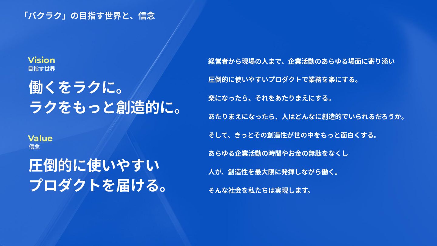 Value 信念 「バクラク」の⽬指す世界と、信念 Vision 働くをラクに。 ラクをもっと創造的に。 圧倒的に使いやすい プロダクトを届ける。 経営者から現場の⼈まで、企業活動のあらゆる場⾯に寄り添い 圧倒的に使いやすいプロダクトで業務を楽にする。