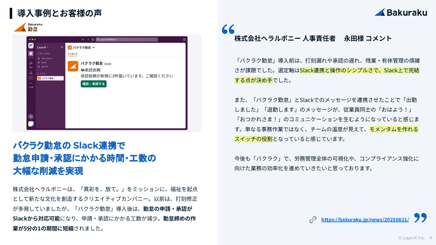 © LayerX Inc. 9 バクラク勤怠の Slack連携で 勤怠申請・承認にかかる時間・工数の 大幅な削減を実現 導⼊事例とお客様の声 https://bakuraku.jp/news/20250821/