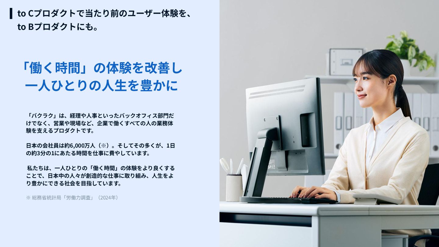 験を⽀えるプロダクトです。 ⽇本の会社員は約6,000万⼈(※)。そしてその多くが、1⽇ の約3分の1にあたる時間を仕事に費やしています。 私たちは、⼀⼈ひとりの「働く時間」の体験をより良くする ことで、⽇本中の⼈々が創造的な仕事に取り組み、⼈⽣をよ り豊かにできる社会を⽬指しています。 ※ 総務省統計局「労働⼒調査」(2024年) 「働く時間」の体験を改善し ⼀⼈ひとりの⼈⽣を豊かに