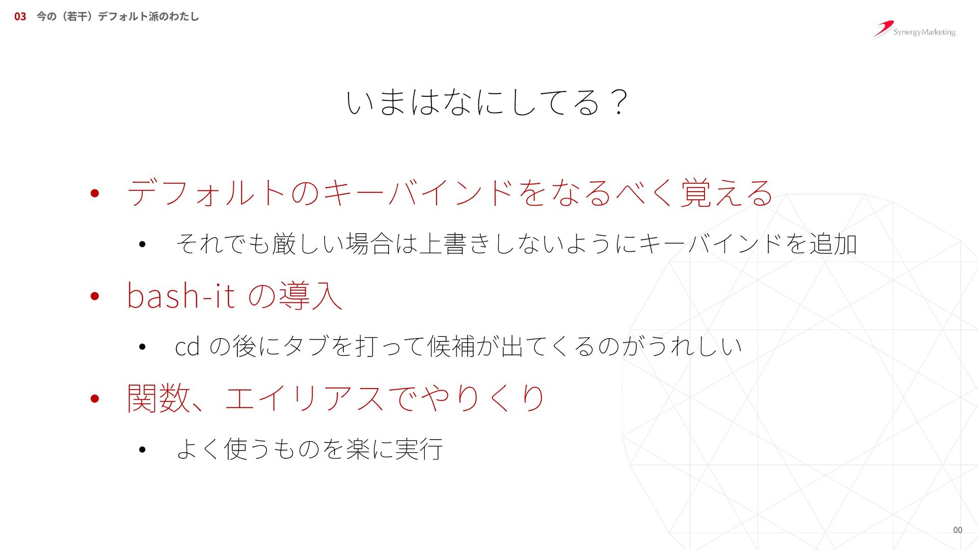 いまはなにしてる? • デフォルトのキーバインドをなるべく覚える • それでも厳しい場合は上書きしないようにキーバインドを追加 • bash-it の導入 • cd