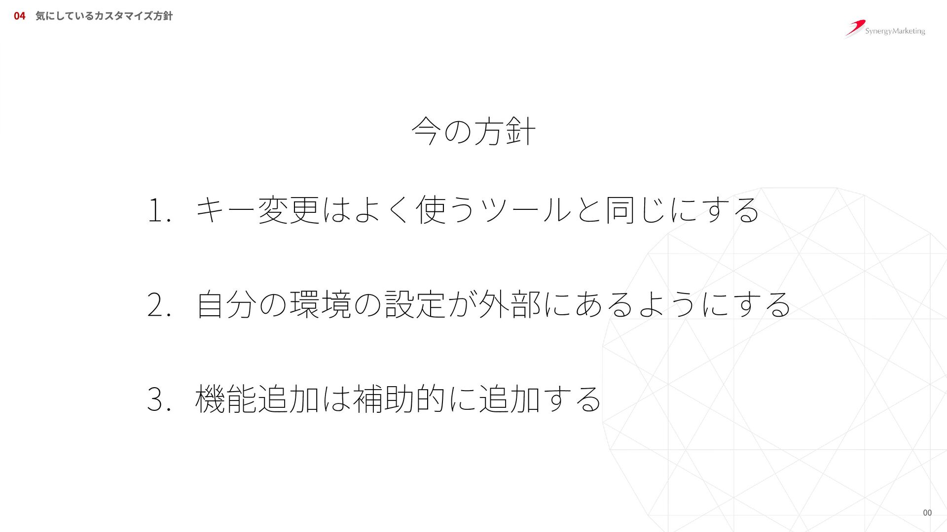 今の方針 1. キー変更はよく使うツールと同じにする 2. 自分の環境の設定が外部にあるようにする 3. 機能追加は補助的に追加する