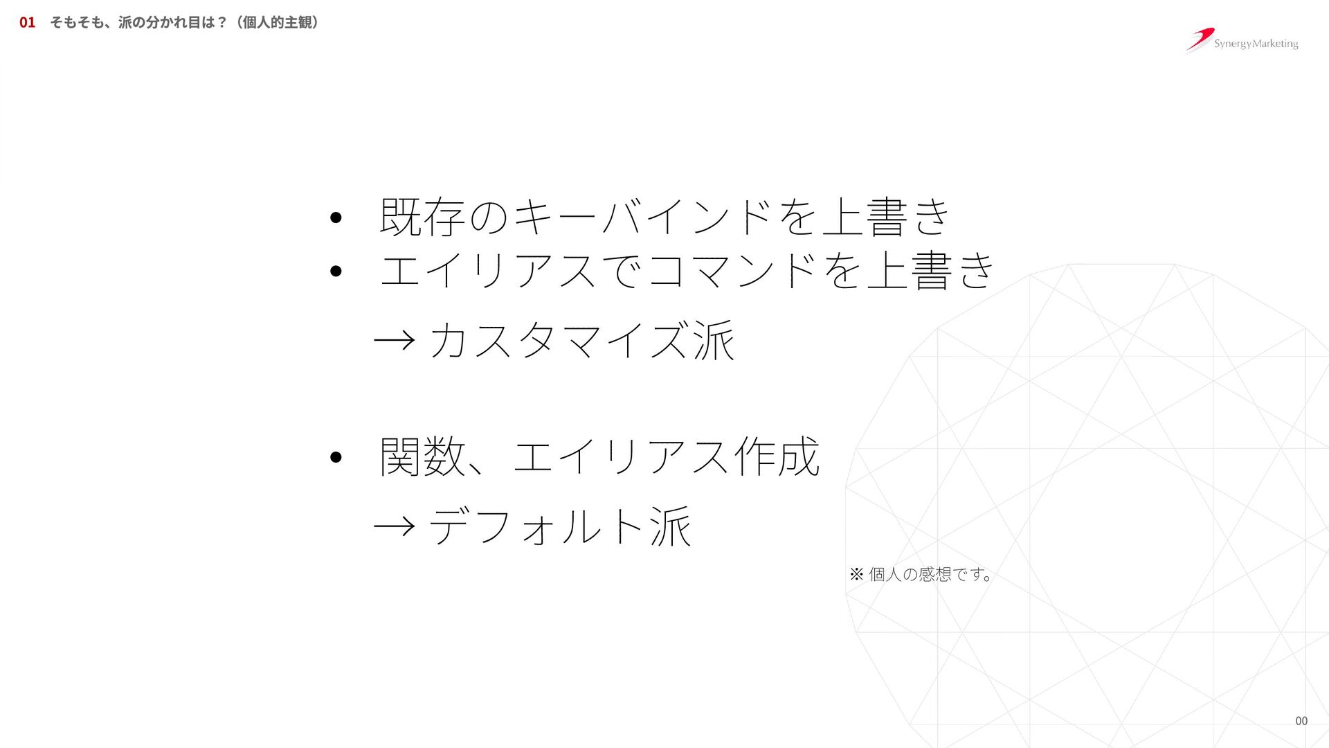 • 既存のキーバインドを上書き • エイリアスでコマンドを上書き → カスタマイズ派 • 関数、エイリアス作成 → デフォルト派