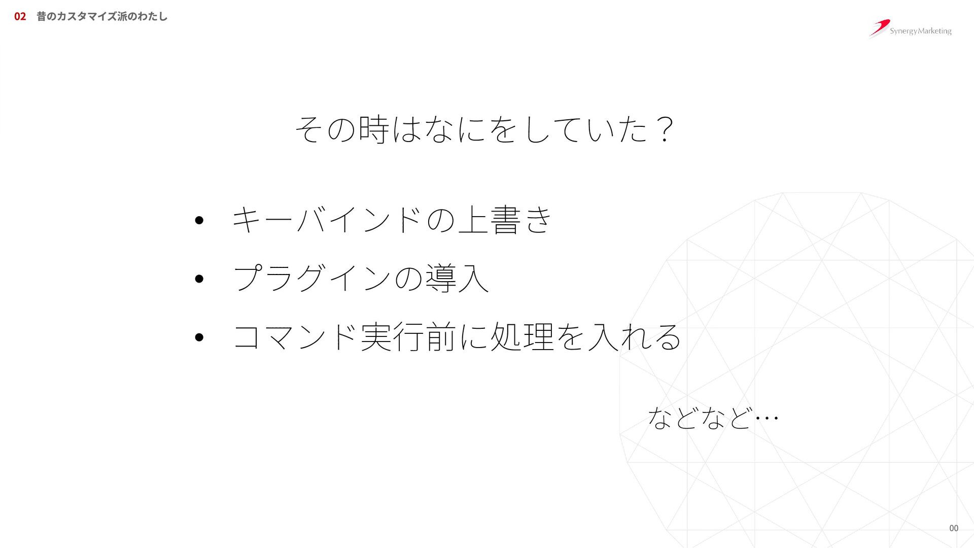 その時はなにをしていた? • キーバインドの上書き • プラグインの導入 • コマンド実行前に処理を入れる などなど…