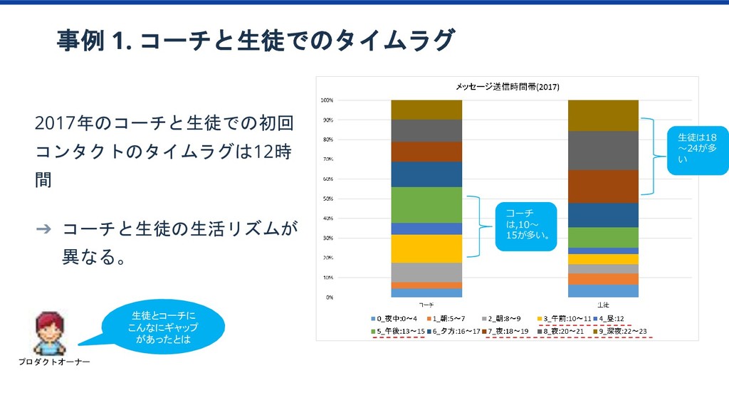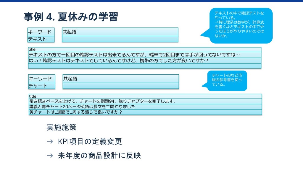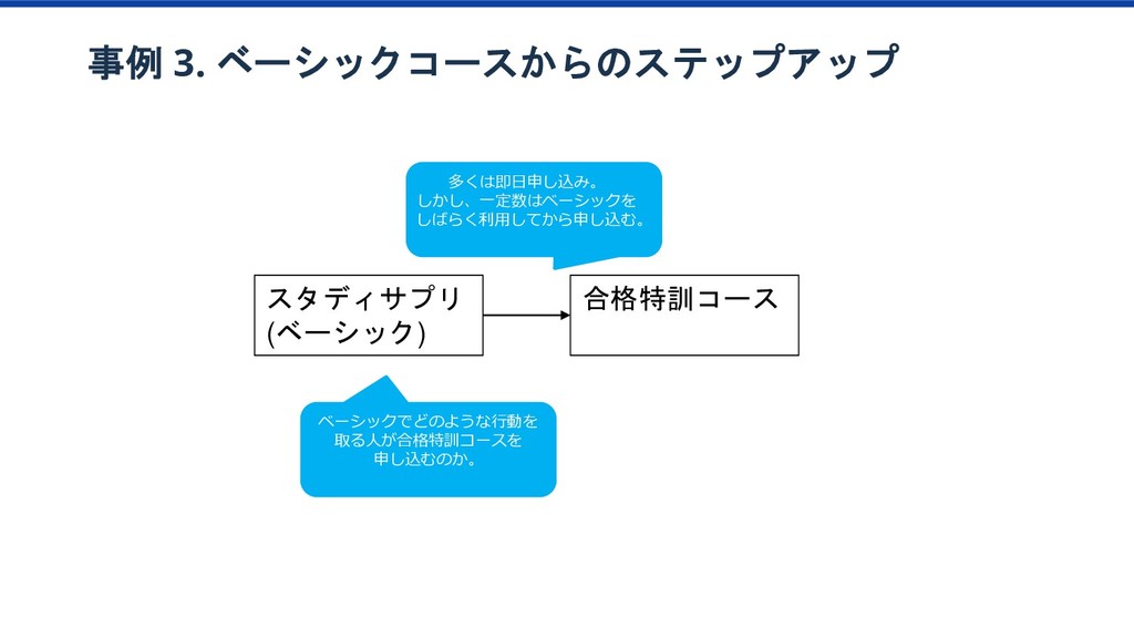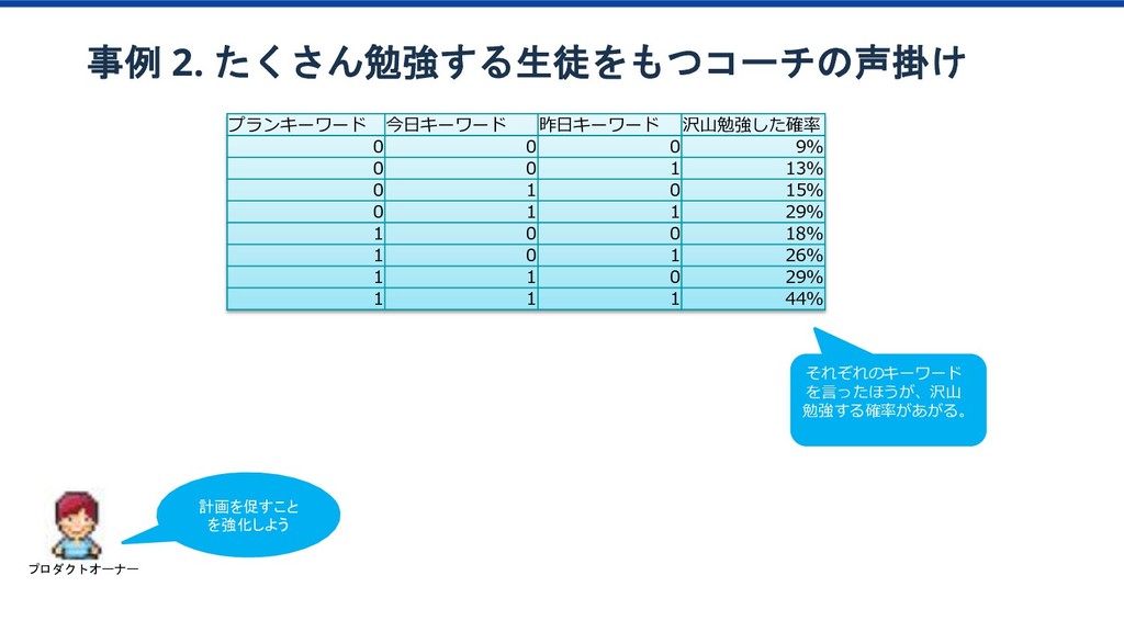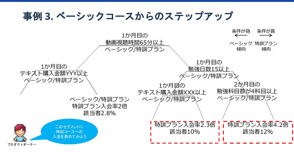 特訓プラン 傾向 1か月目の 動画視聴時間65分以上 ベーシック/特訓プラン 1か月目の 勉強日数15以上 ベーシック/特訓プラン 1か月目の テキスト購入金額YYY以上 ベーシック/特訓プラン 1か月目の テキスト購入金額XXX以上 ベーシック/特訓プラン 2か月目の 勉強科目数が4科目以上 ベーシック/特訓プラン ベーシック/特訓プラン 特訓プラン入会率2倍 該当者2.8% 特訓プラン入会率2.3倍 該当者10% 特訓プラン入会率4.2倍 該当者12% このセグメントに 特訓コースへの 入会を薦めてみよう プロダクトオーナー