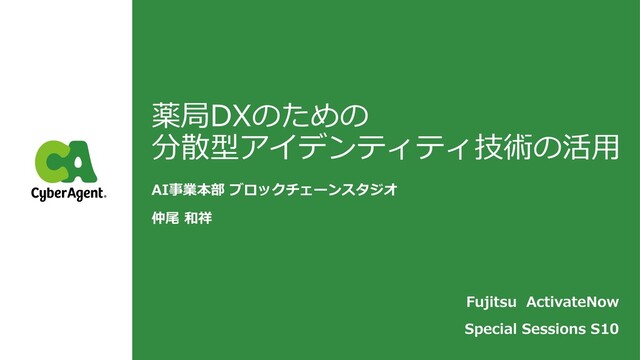 薬局DXのための 分散型アイデンティティ技術の活⽤ AI事業本部 ブロックチェーンスタジオ 仲尾 和祥 Fujitsu ActivateNow Special Sessions