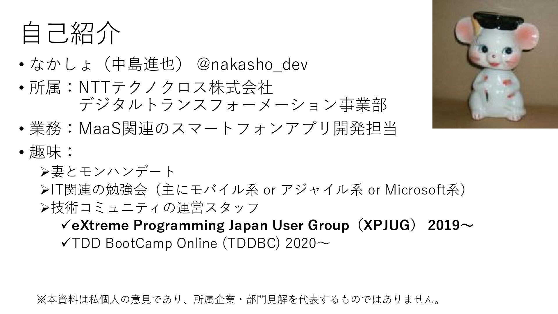 趣味: ➢妻とモンハンデート ➢IT関連の勉強会(主にモバイル系 or アジャイル系 or Microsoft系) ➢技術コミュニティの運営スタッフ ✓eXtreme Programming Japan User Group(XPJUG) 2019〜 ✓TDD BootCamp Online (TDDBC) 2020~ ※本資料は私個人の意見であり、所属企業・部門見解を代表するものではありません。