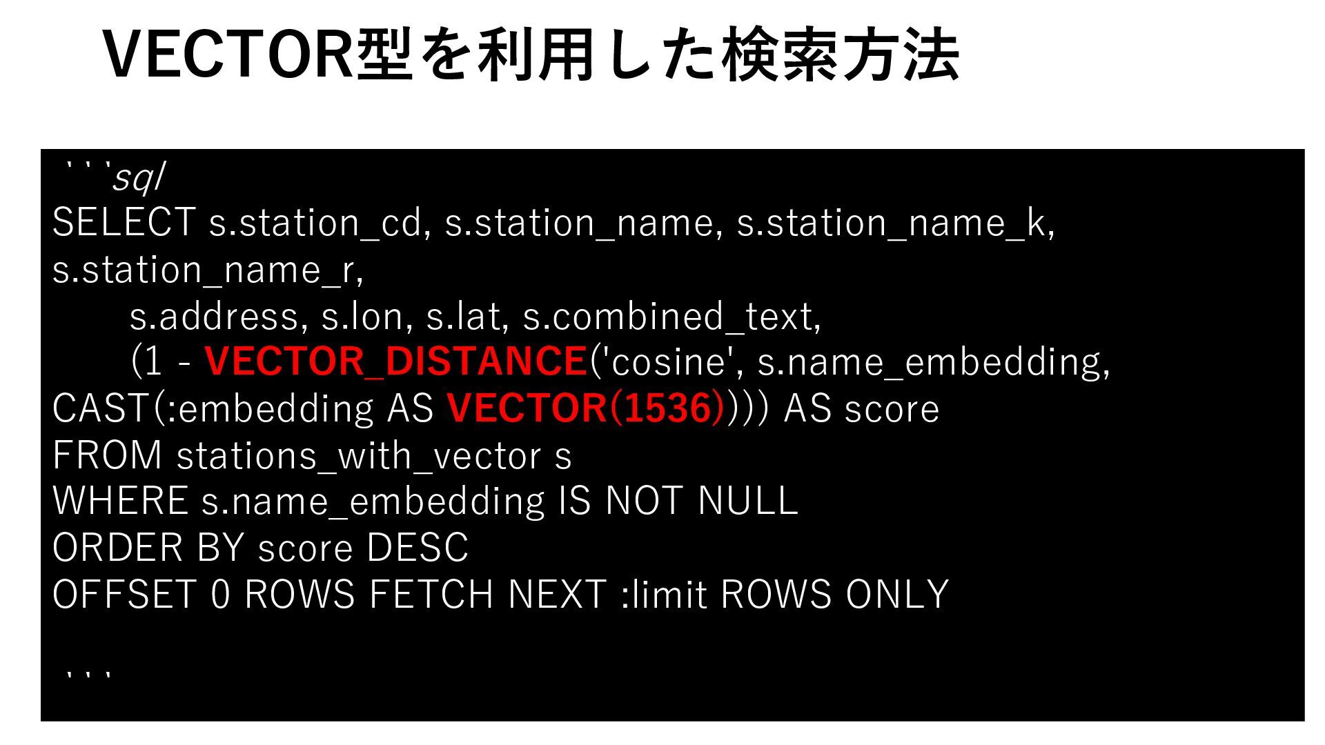 s.lat, s.combined_text, (1 - VECTOR_DISTANCE('cosine', s.name_embedding, CAST(:embedding AS VECTOR(1536)))) AS score FROM stations_with_vector s WHERE s.name_embedding IS NOT NULL ORDER BY score DESC OFFSET 0 ROWS FETCH NEXT :limit ROWS ONLY ```