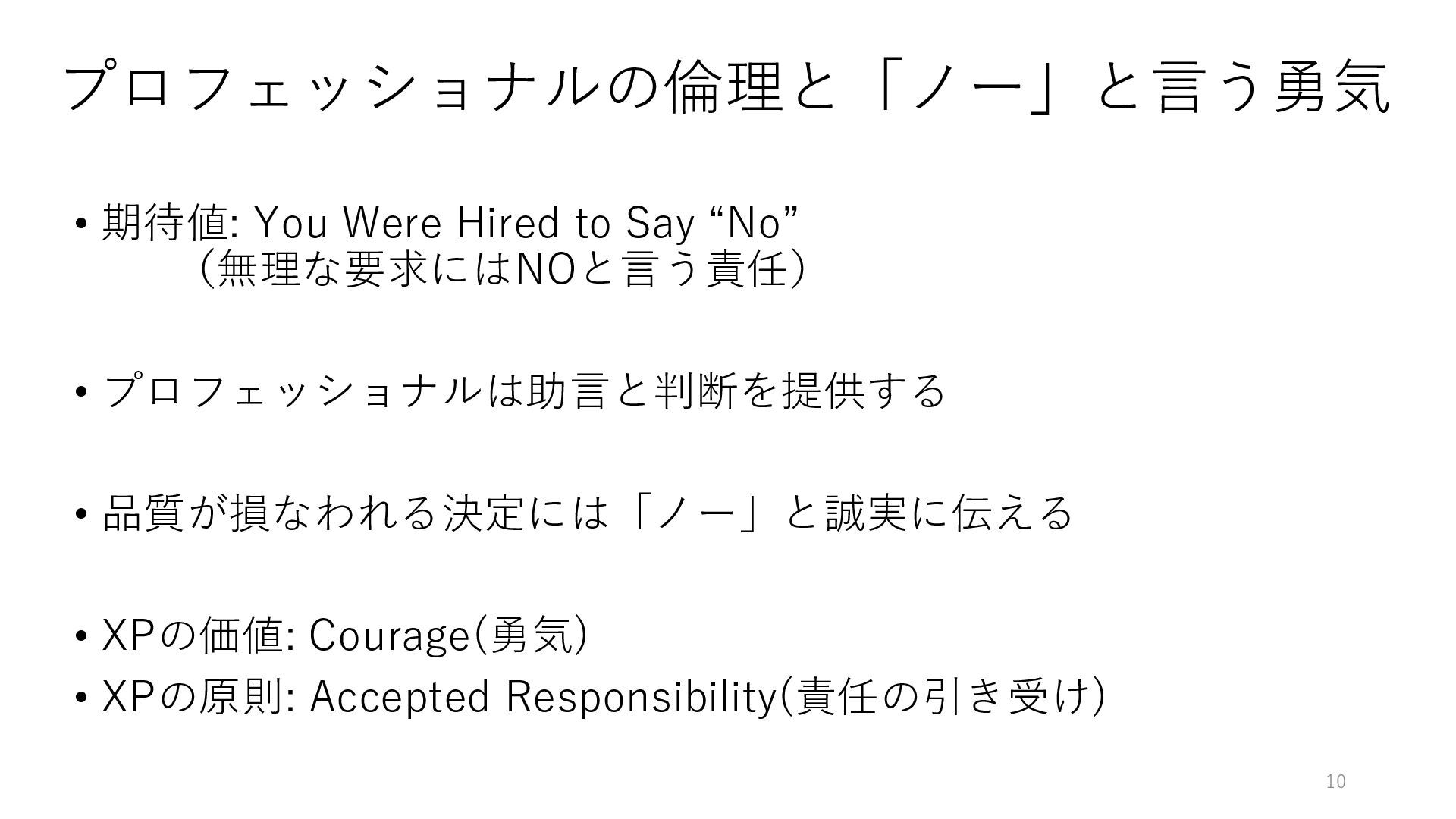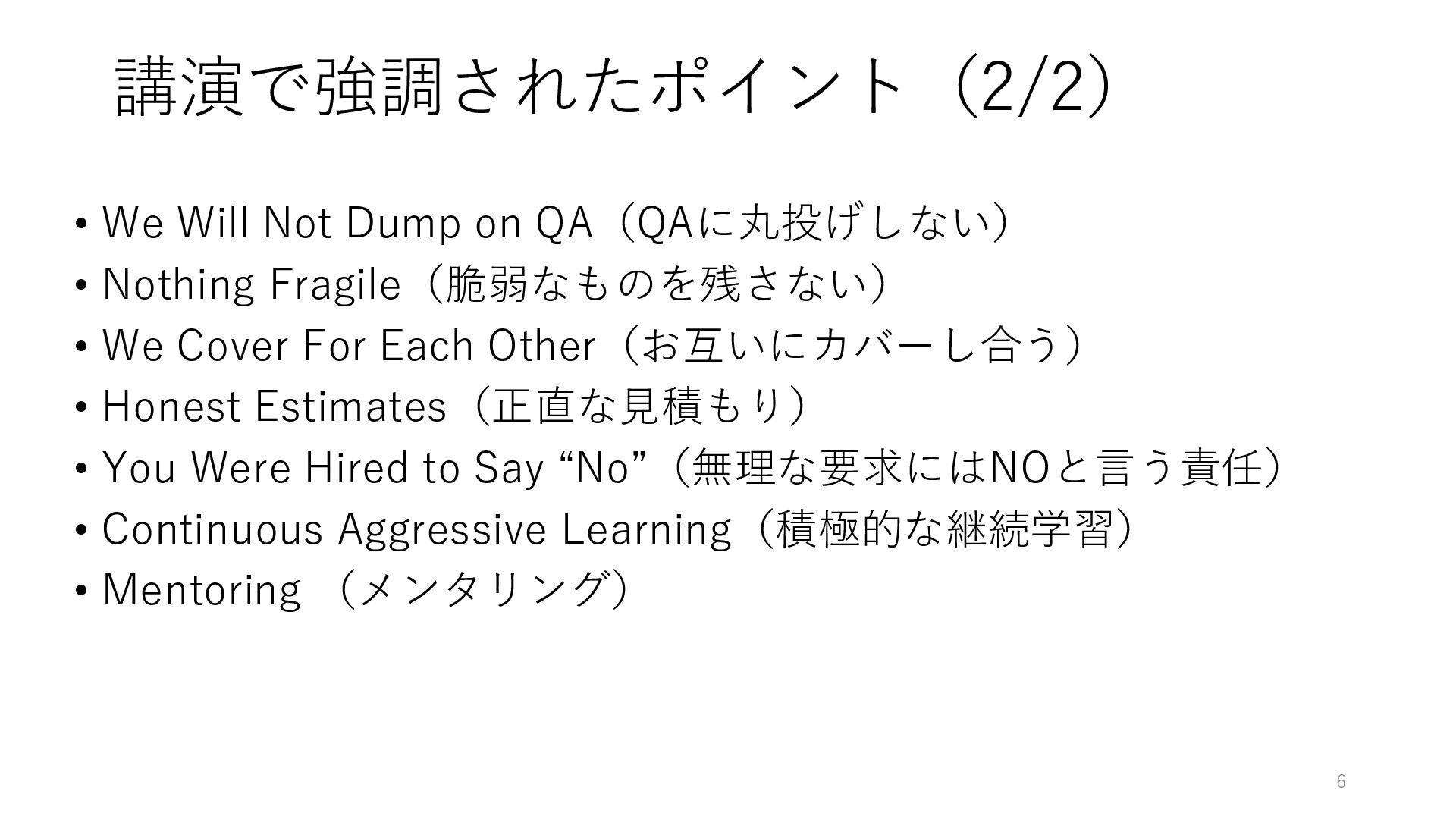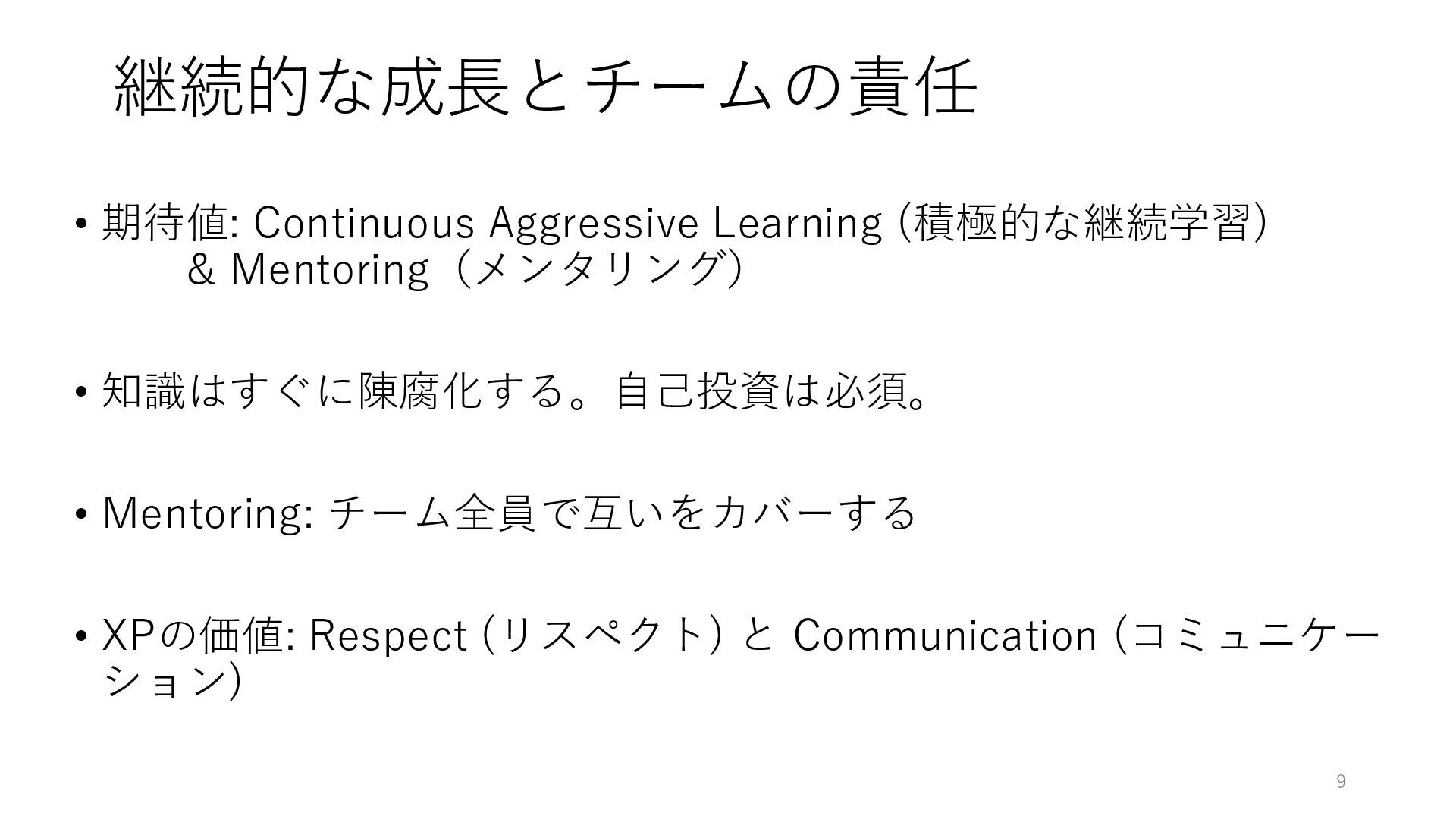 Nothing Fragile(脆弱なものを残さない) • We Cover For Each Other(お互いにカバーし合う) • Honest Estimates(正直な見積もり) • You Were Hired to Say “No”(無理な要求にはNOと言う責任) • Continuous Aggressive Learning(積極的な継続学習) • Mentoring (メンタリング)