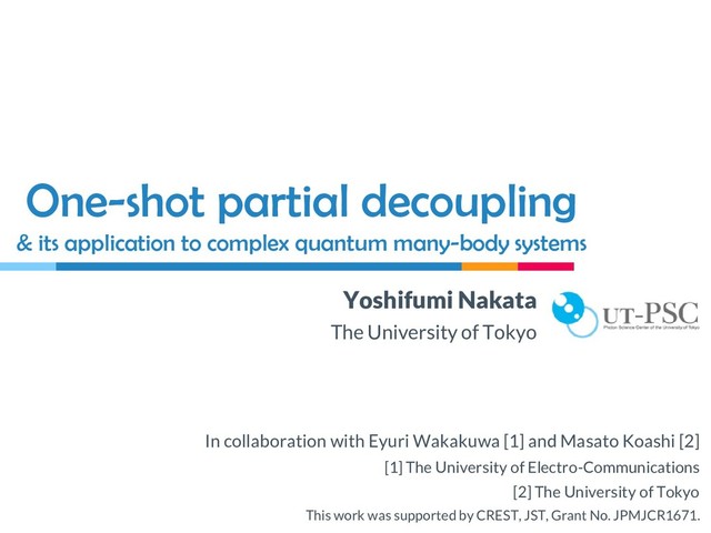 ▪ Applying the one-shot partial decoupling to Q. information theory? ➢ It’s already done (but time was limited today….) ➢ in progress…. (maybe, in next QIT) Alice Reference Bob qubits qubits qubits Black hole When a black hole has a symmetry, how does the information leak out from the BH?