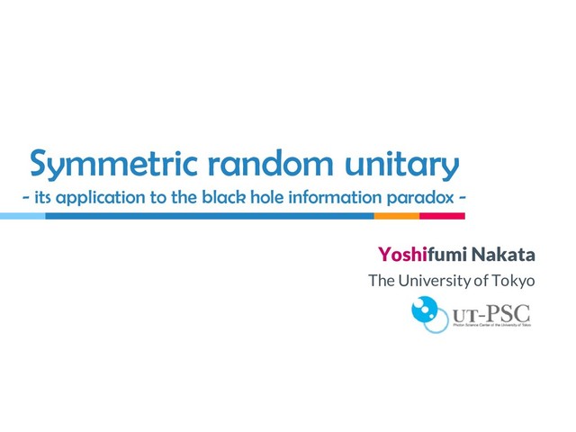 1. Haar random unitary in QI 2. Unitary designs in QI Part II. Symmetric random unitary 1. Symmetric random unitary from the representation theory 2. The information paradox when a black hole has a symmetry Part III. Conclusion As an organizer, to promote discussions b/t math. and Q.I. As a researcher working in the intersection b/t math. and Q.I.