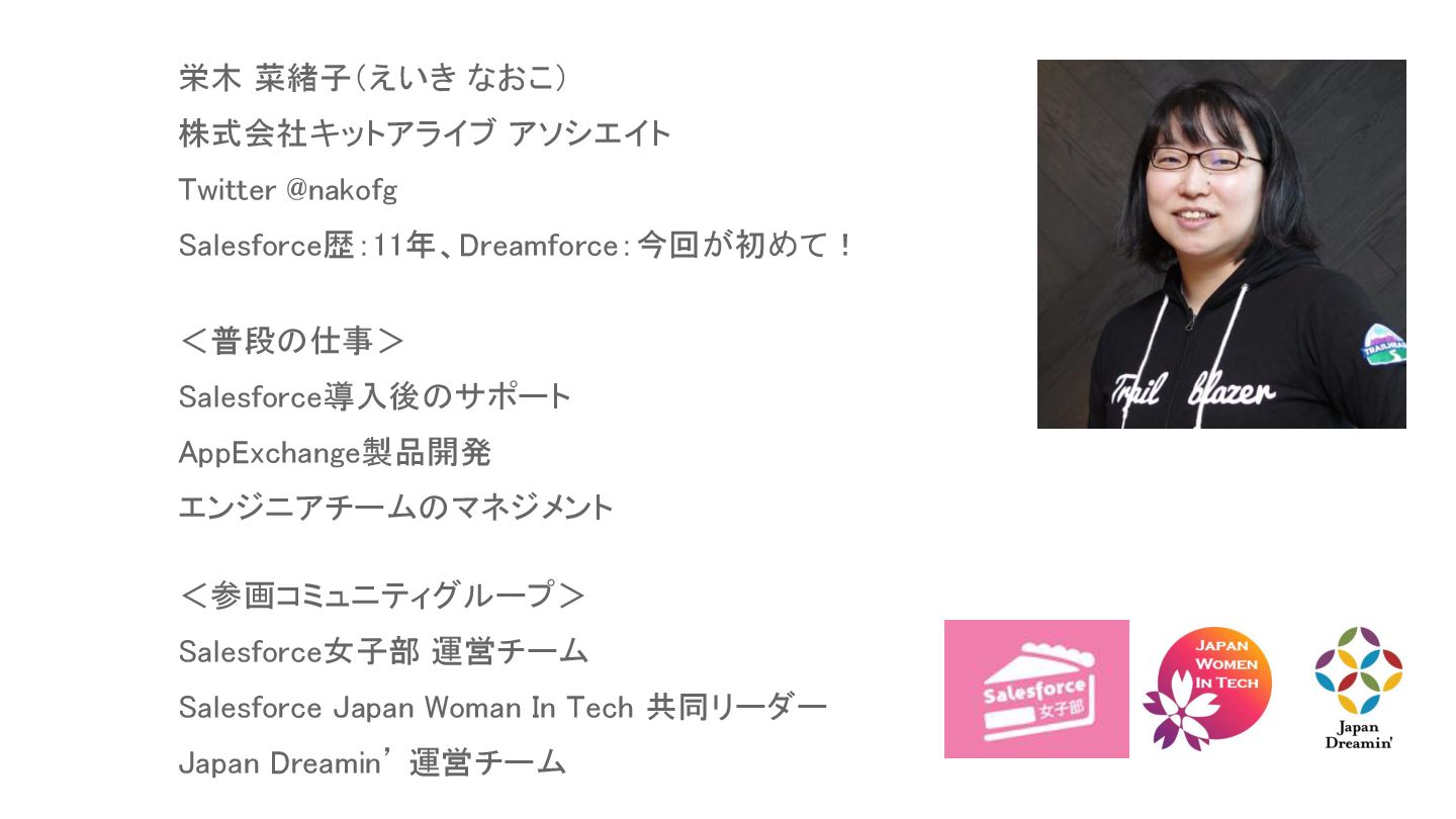 栄木 菜緒子(えいき なおこ) 株式会社キットアライブ アソシエイト Twitter @nakofg Salesforce歴:11年、Dreamforce:今回が初めて!