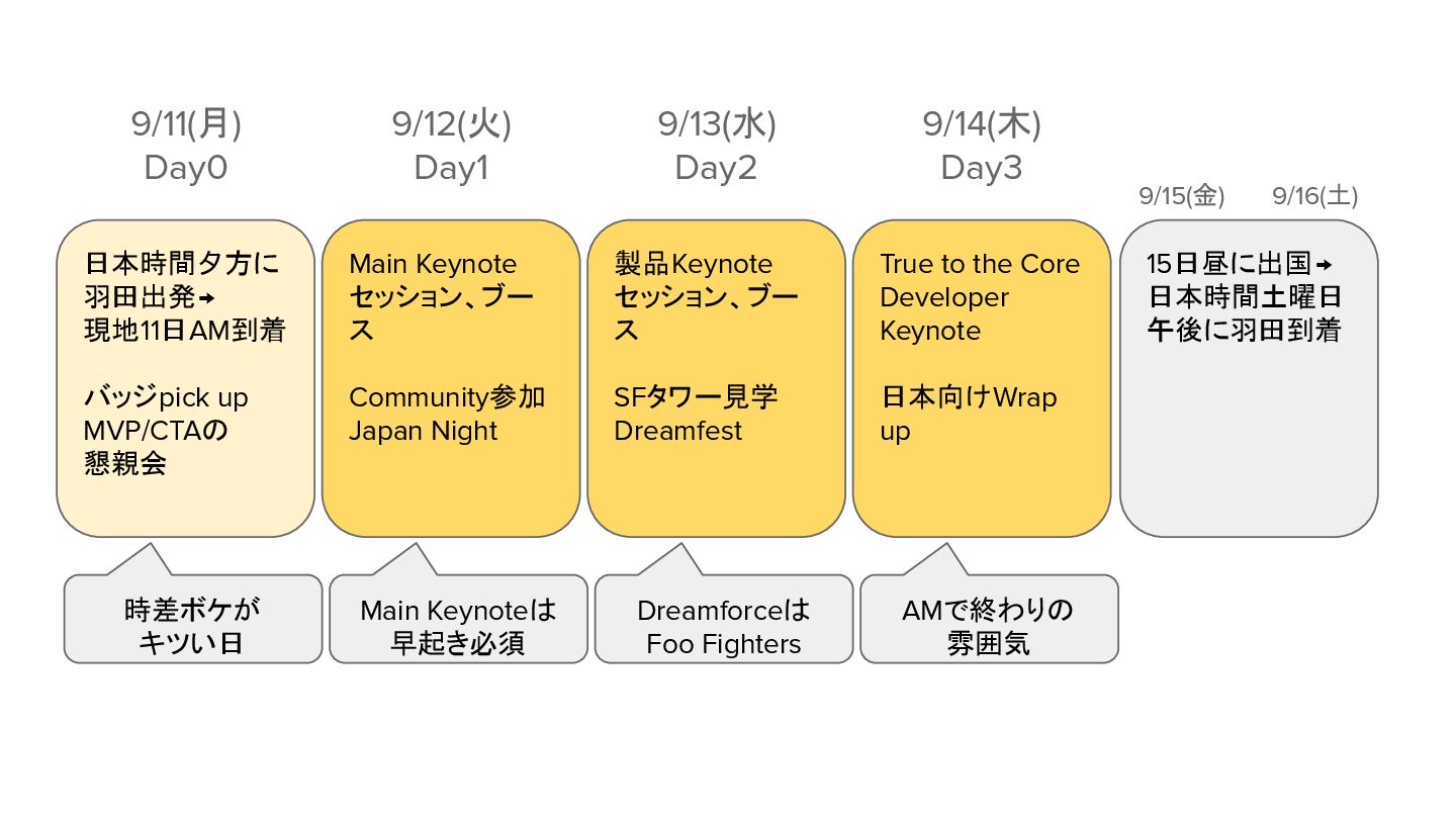 ス Community参加 Japan Night 製品Keynote セッション、ブー ス SFタワー見学 Dreamfest True to the Core Developer Keynote 日本向けWrap up 15日昼に出国→ 日本時間土曜日 午後に羽田到着 9/11(月) Day0 9/12(火) Day1 9/13(水) Day2 9/14(木) Day3 9/15(金) 9/16(土) AMで終わりの 雰囲気 Dreamforceは Foo Fighters Main Keynoteは 早起き必須 時差ボケが キツい日