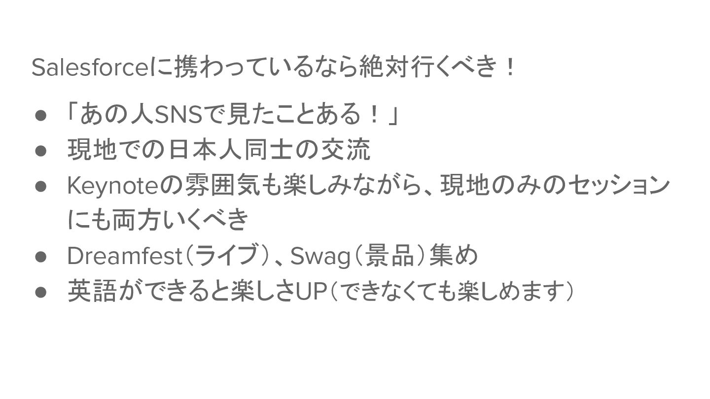 Salesforceに携わっているなら絶対行くべき! • 「あの人SNSで見たことある!」 • 現地での日本人同士の交流 • Keynoteの雰囲気も楽しみながら、現地のみのセッション にも両方いくべき • Dreamfest(ライブ)、Swag(景品)集め