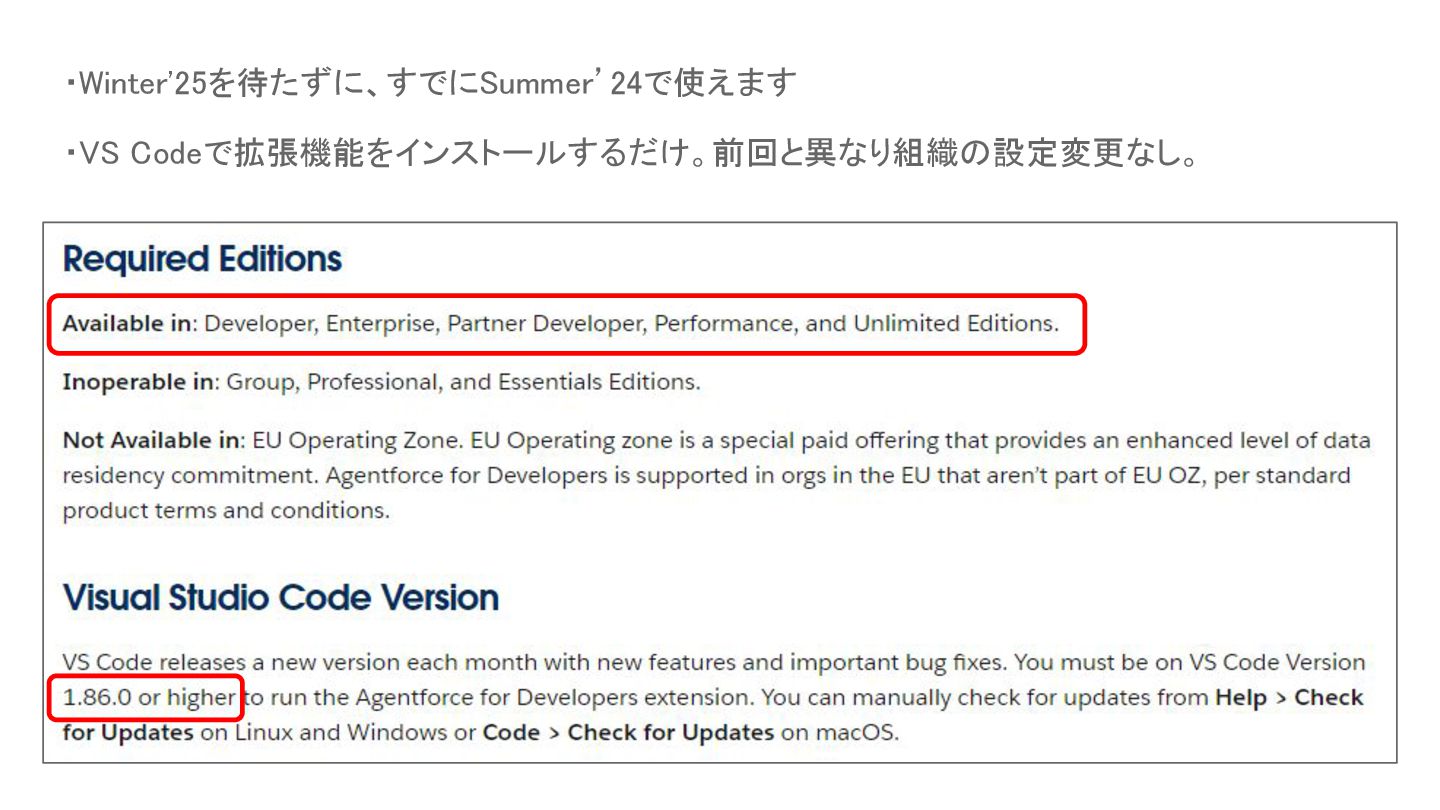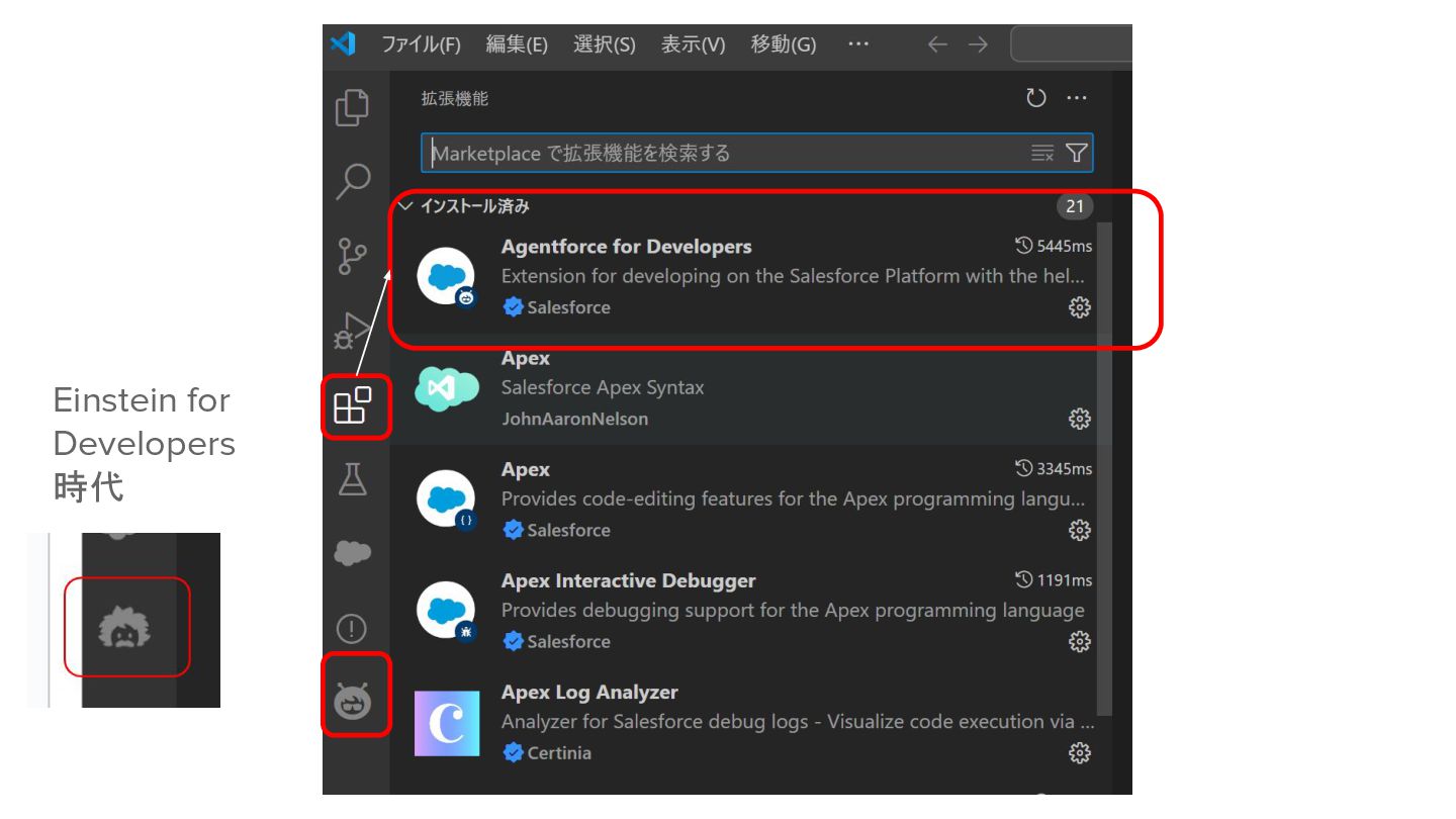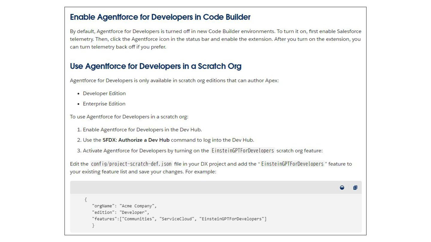 for Developers is turned off in new Code Builder environments. To turn it on, first enable Salesforce telemetry. Then, click the Agentforce icon in the status bar and enable the extension. After you turn on the extension, you can turn telemetry back off if you prefer. Use Agentforce for Developers in a Scratch Org Agentforce for Developers is only available in scratch org editions that can author Apex: Developer Edition Enterprise Edition To use Agentforce for Developers in a scratch org: 1. Enable Agentforce for Developers in the Dev Hub. 2. Use the SFDX: Authorize a Dev Hub command to log into the Dev Hub. 3. Activate Agentforce for Developers by turning on the EinsteinGPTForDevelopers scratch org feature: Edit the config/project-scratch-def. json file in your DX project and add the "EinsteinGPTForDeve lopers"feature to your existing feature list and save your changes. For example: } "orgName": "Acme Company", "edition": "Developer", "features": ["Communities", "ServiceCloud", "EinsteinGPTForDevelopers"] }