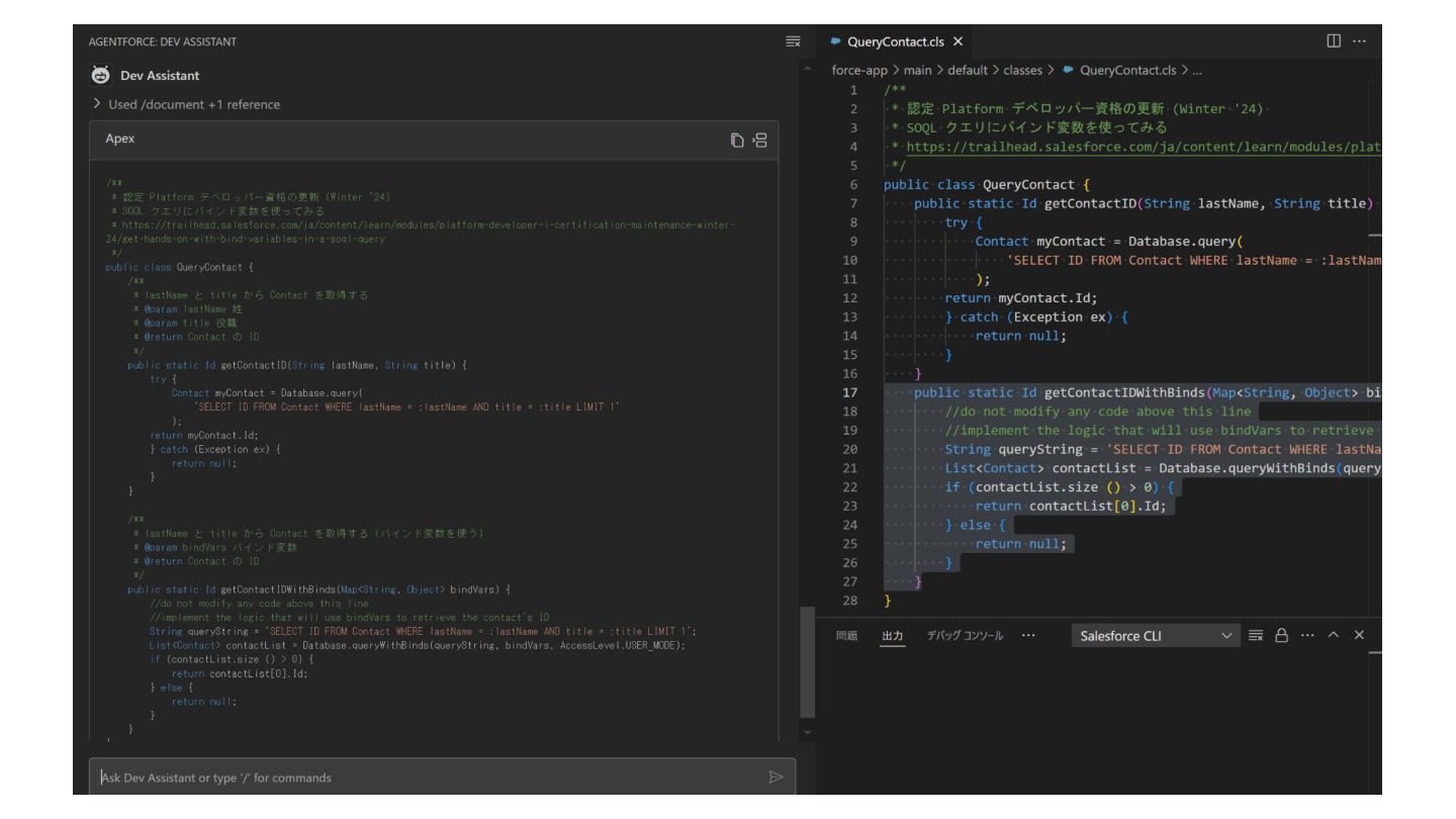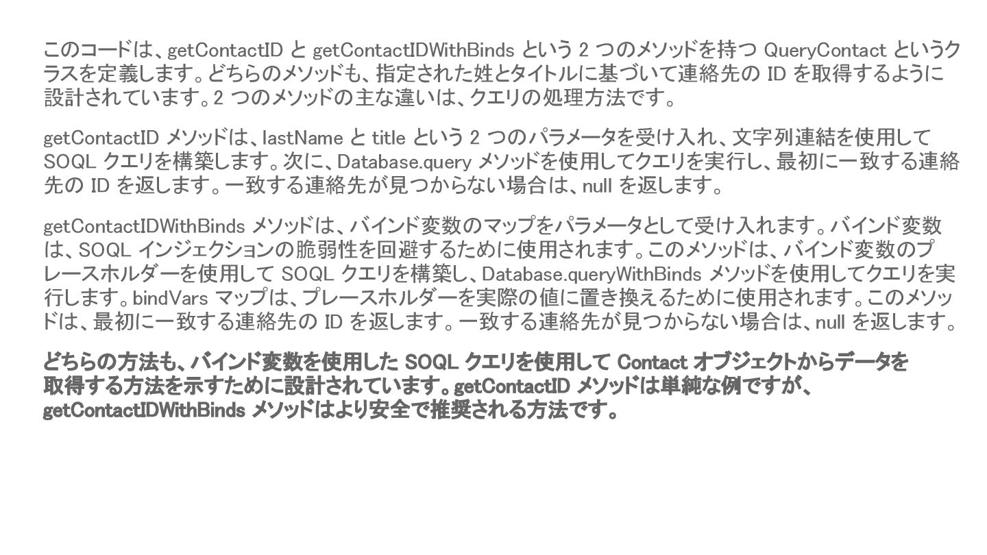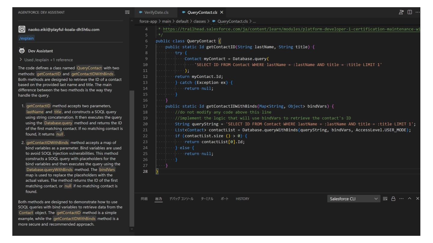 > classes > QueryContact.cls Π [email protected] 4 * https://trailhead.salesforce.com/ja/content/learn/modules/platform-developer-i-certification-maintenance-wi 5 /explain 6 public class QueryContact{ 7 public static Id getContactID(String lastName, String title) Dev Assistant 8 try { > Used /explain +1 reference 9 Contact myContact = Database.query( 10 'SELECT ID FROM Contact WHERE lastName = :lastName AND title = :title LIMIT 1' The code defines a class named QueryContact with two methods: getContactID and getContactIDWithBinds. Both methods are designed to retrieve the ID of a contact based on the provided last name and title. The main difference between the two methods is the way they handle the query. 11 ); 12 return myContact.Id; 13 14 } catch (Exception ex) { return null; 15 16 1. getContactID method accepts two parameters, lastName and title, and constructs a SOQL query using string concatenation. It then executes the query using the Database.query method and returns the ID of the first matching contact. If no matching contact is found, it returns null. 2. getContactIDWithBinds method accepts a map of bind variables as a parameter. Bind variables are used to avoid SOQL injection vulnerabilities. This method constructs a SOQL query with placeholders for the bind variables and then executes the query using the Database.queryWithBinds method. The bindVars map is used to replace the placeholders with the actual values. The method returns the ID of the first matching contact, or null if no matching contact is found. Both methods are designed to demonstrate how to use SOQL queries with bind variables to retrieve data from the Contact object. The getContactID method is a simple example, while the getContactIDWithBinds method is a more secure and recommended approach. 17 18 19 20 21 22 23 public static Id getContactIDWithBinds(Map<String, Object> bindVars) { //do not modify any code above this line //implement the logic that will use bindVars to retrieve the contact's ID String queryString = 'SELECT ID FROM Contact WHERE lastName = :lastName AND title = :title LIMIT 1'; List<Contact> contactList = Database.queryWithBinds(queryString, bindVars, AccessLevel.USER_MODE); if (contactList.size () > 0) { return contactList[0].Id; 24 } else 25 return null; 26 27 28 問題 出力 デバッグ コンソール ターミナル ポート HISTORY Salesforce CLI