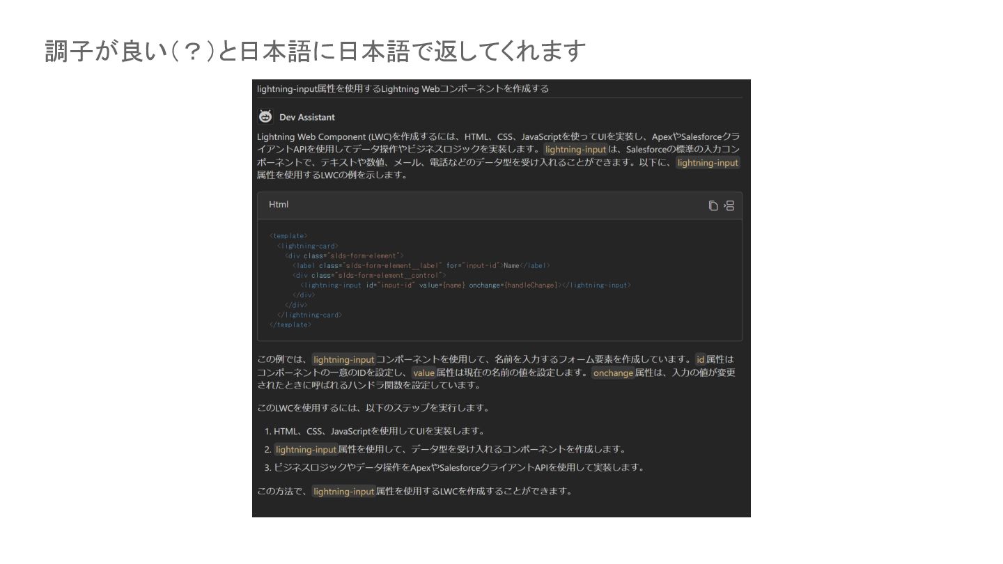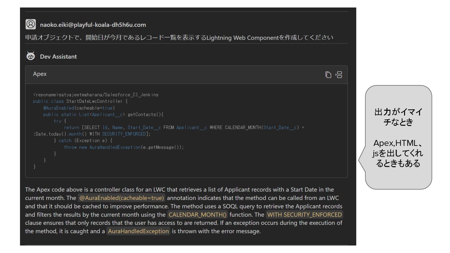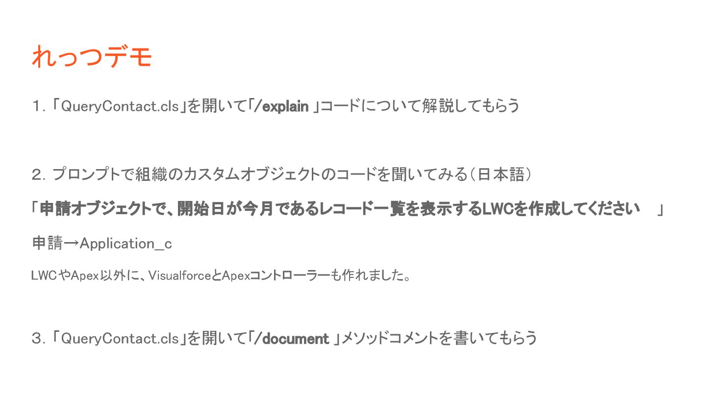 > classes > QueryContact.cls Π [email protected] 4 * https://trailhead.salesforce.com/ja/content/learn/modules/platform-developer-i-certification-maintenance-wi 5 /explain 6 public class QueryContact{ 7 public static Id getContactID(String lastName, String title) Dev Assistant 8 try { > Used /explain +1 reference 9 Contact myContact = Database.query( 10 'SELECT ID FROM Contact WHERE lastName = :lastName AND title = :title LIMIT 1' The code defines a class named QueryContact with two methods: getContactID and getContactIDWithBinds. Both methods are designed to retrieve the ID of a contact based on the provided last name and title. The main difference between the two methods is the way they handle the query. 11 ); 12 return myContact.Id; 13 14 } catch (Exception ex) { return null; 15 16 1. getContactID method accepts two parameters, lastName and title, and constructs a SOQL query using string concatenation. It then executes the query using the Database.query method and returns the ID of the first matching contact. If no matching contact is found, it returns null. 2. getContactIDWithBinds method accepts a map of bind variables as a parameter. Bind variables are used to avoid SOQL injection vulnerabilities. This method constructs a SOQL query with placeholders for the bind variables and then executes the query using the Database.queryWithBinds method. The bindVars map is used to replace the placeholders with the actual values. The method returns the ID of the first matching contact, or null if no matching contact is found. Both methods are designed to demonstrate how to use SOQL queries with bind variables to retrieve data from the Contact object. The getContactID method is a simple example, while the getContactIDWithBinds method is a more secure and recommended approach. 17 18 19 20 21 22 23 public static Id getContactIDWithBinds(Map<String, Object> bindVars) { //do not modify any code above this line //implement the logic that will use bindVars to retrieve the contact's ID String queryString = 'SELECT ID FROM Contact WHERE lastName = :lastName AND title = :title LIMIT 1'; List<Contact> contactList = Database.queryWithBinds(queryString, bindVars, AccessLevel.USER_MODE); if (contactList.size () > 0) { return contactList[0].Id; 24 } else 25 return null; 26 27 28 問題 出力 デバッグ コンソール ターミナル ポート HISTORY Salesforce CLI