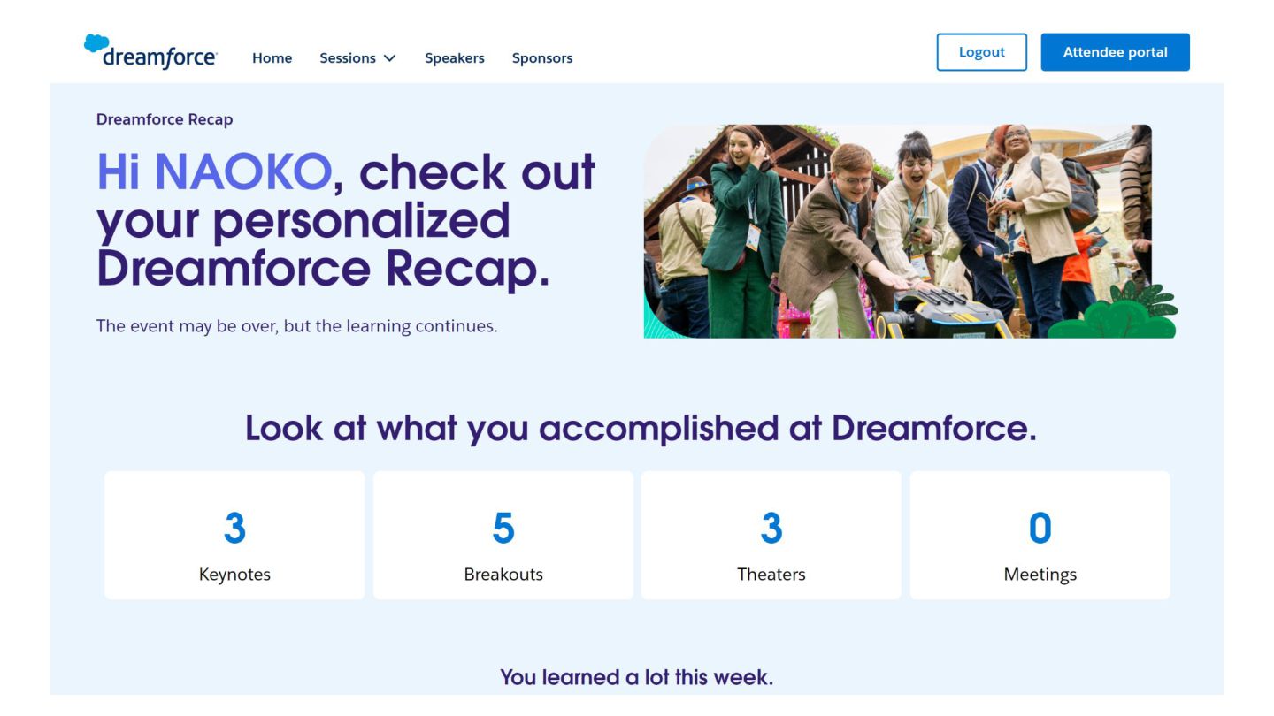 Hi NAOKO, check out your personalized Dreamforce Recaр. The event may be over, but the learning continues. Look at what you accomplished at Dreamforce. 3 5 3 Keynotes Breakouts Theaters Meetings You learned a lot this week.