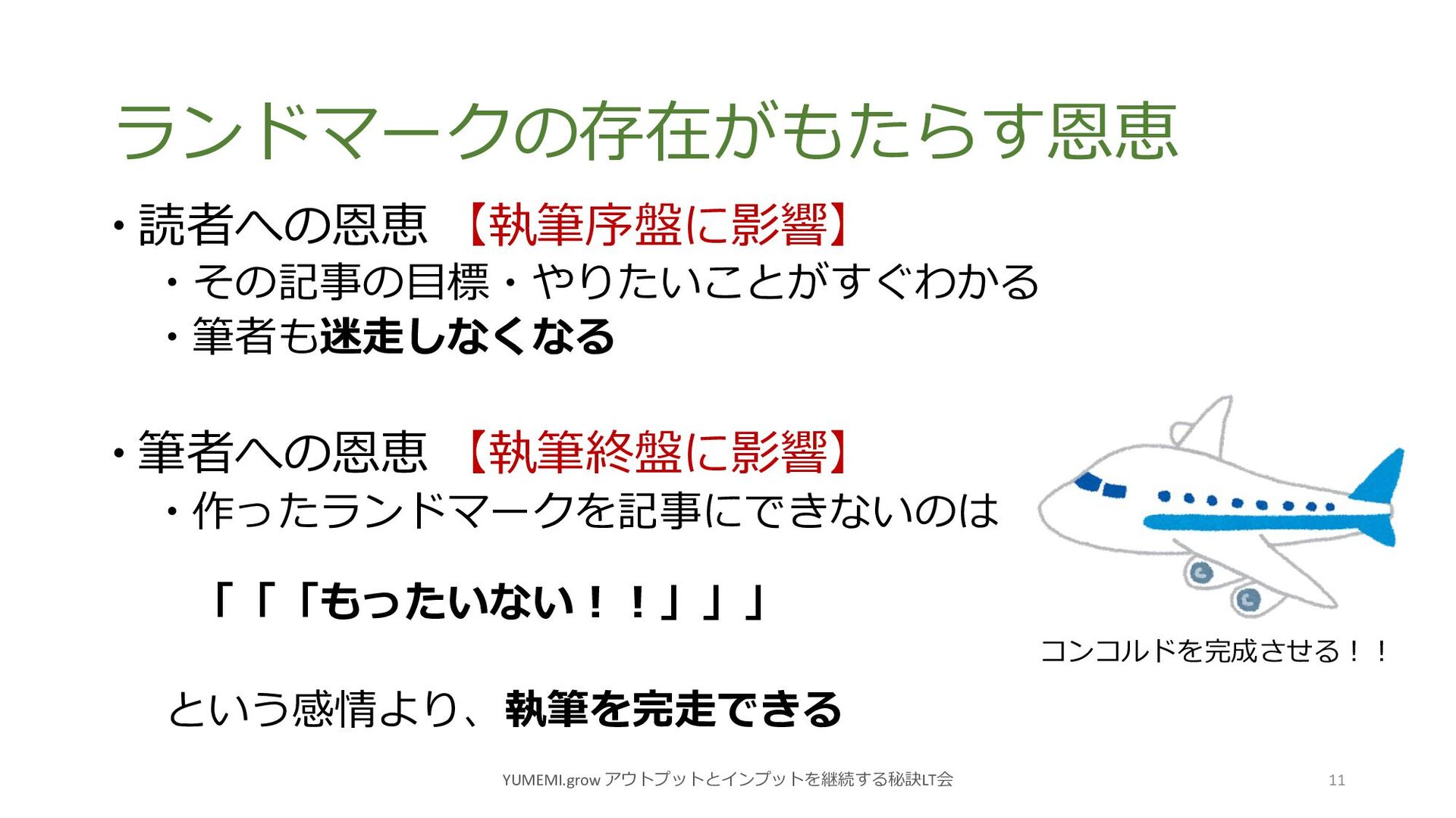 ランドマークの存在がもたらす恩恵 YUMEMI.grow アウトプットとインプットを継続する秘訣LT会 11 読者への恩恵 【執筆序盤に影響】 その記事の⽬標・やりたいことがすぐわかる