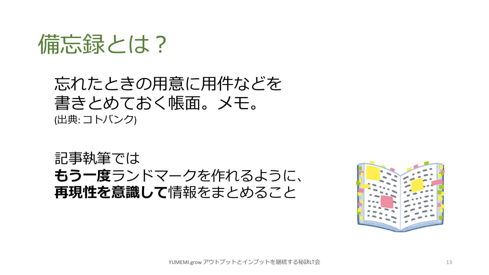 備忘録とは︖ YUMEMI.grow アウトプットとインプットを継続する秘訣LT会 13 忘れたときの⽤意に⽤件などを 書きとめておく帳⾯。メモ。 (出典: コトバンク) 記事執筆では もう⼀度ランドマークを作れるように、
