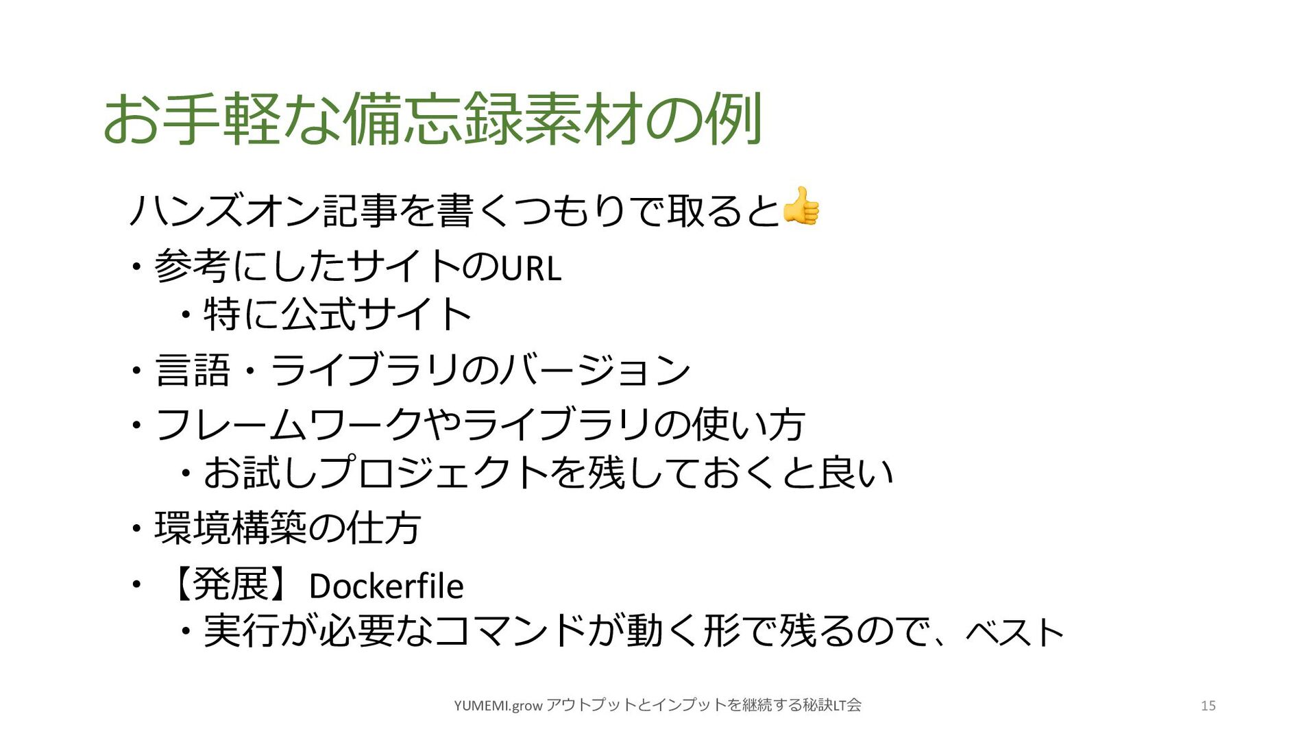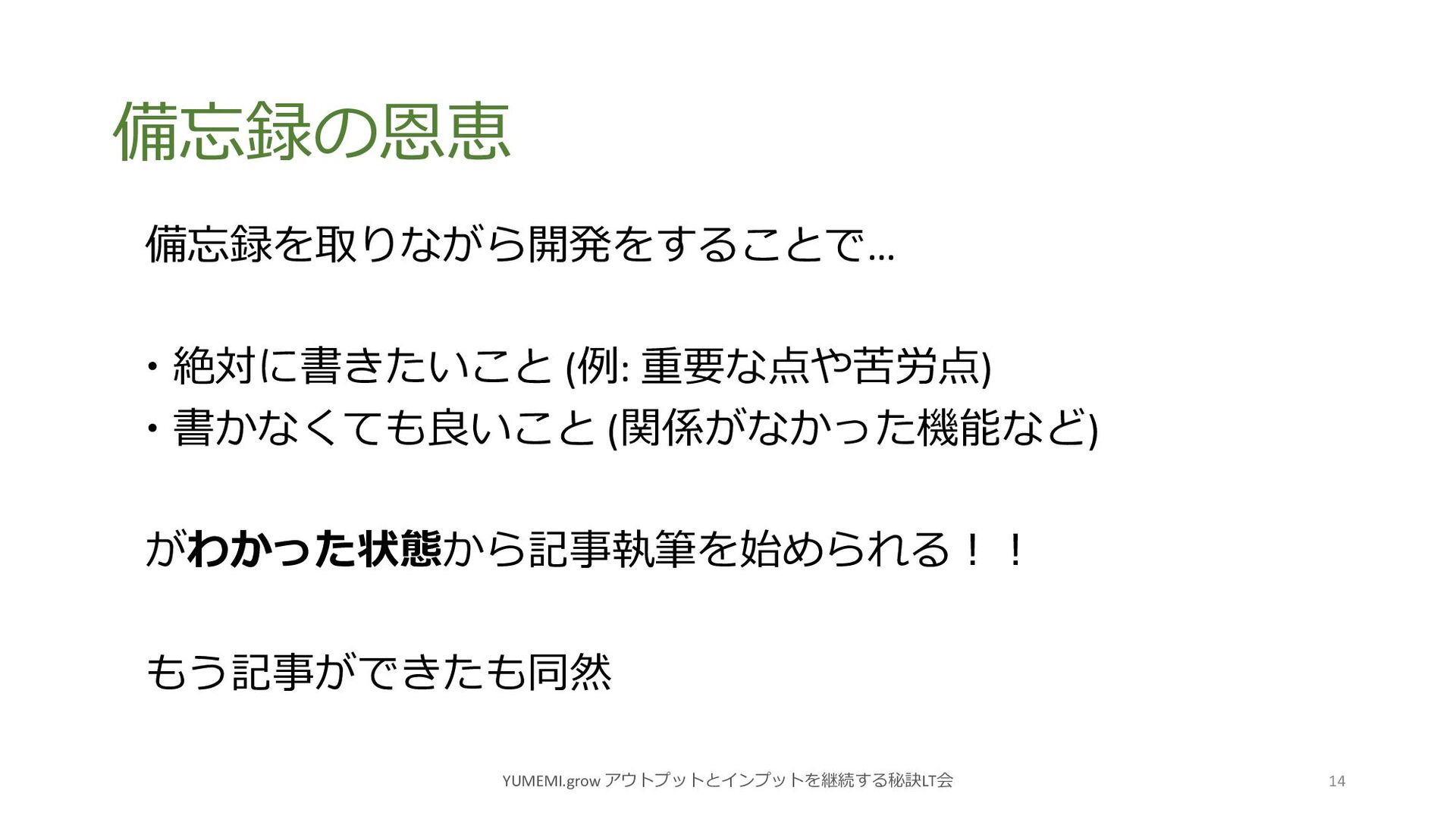 備忘録の恩恵 YUMEMI.grow アウトプットとインプットを継続する秘訣LT会 14 備忘録を取りながら開発をすることで… 絶対に書きたいこと (例: 重要な点や苦労点)