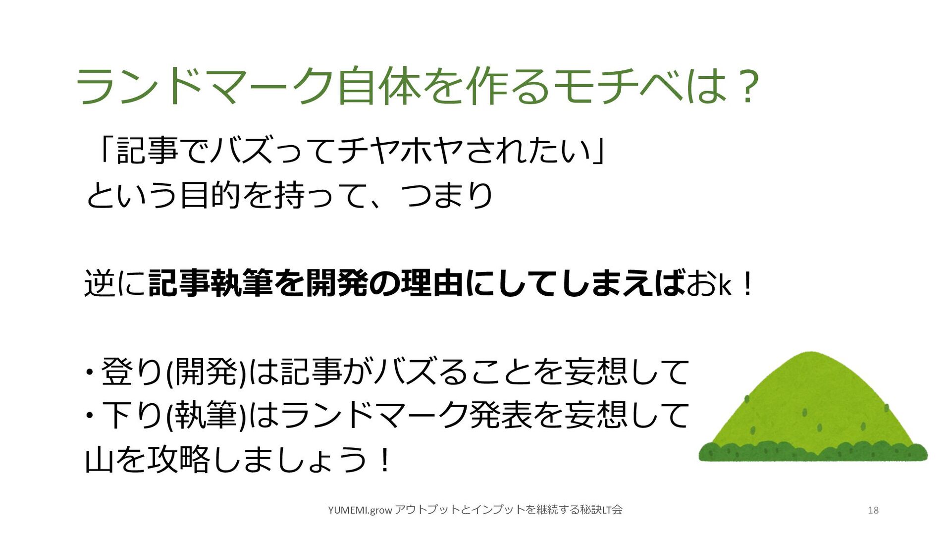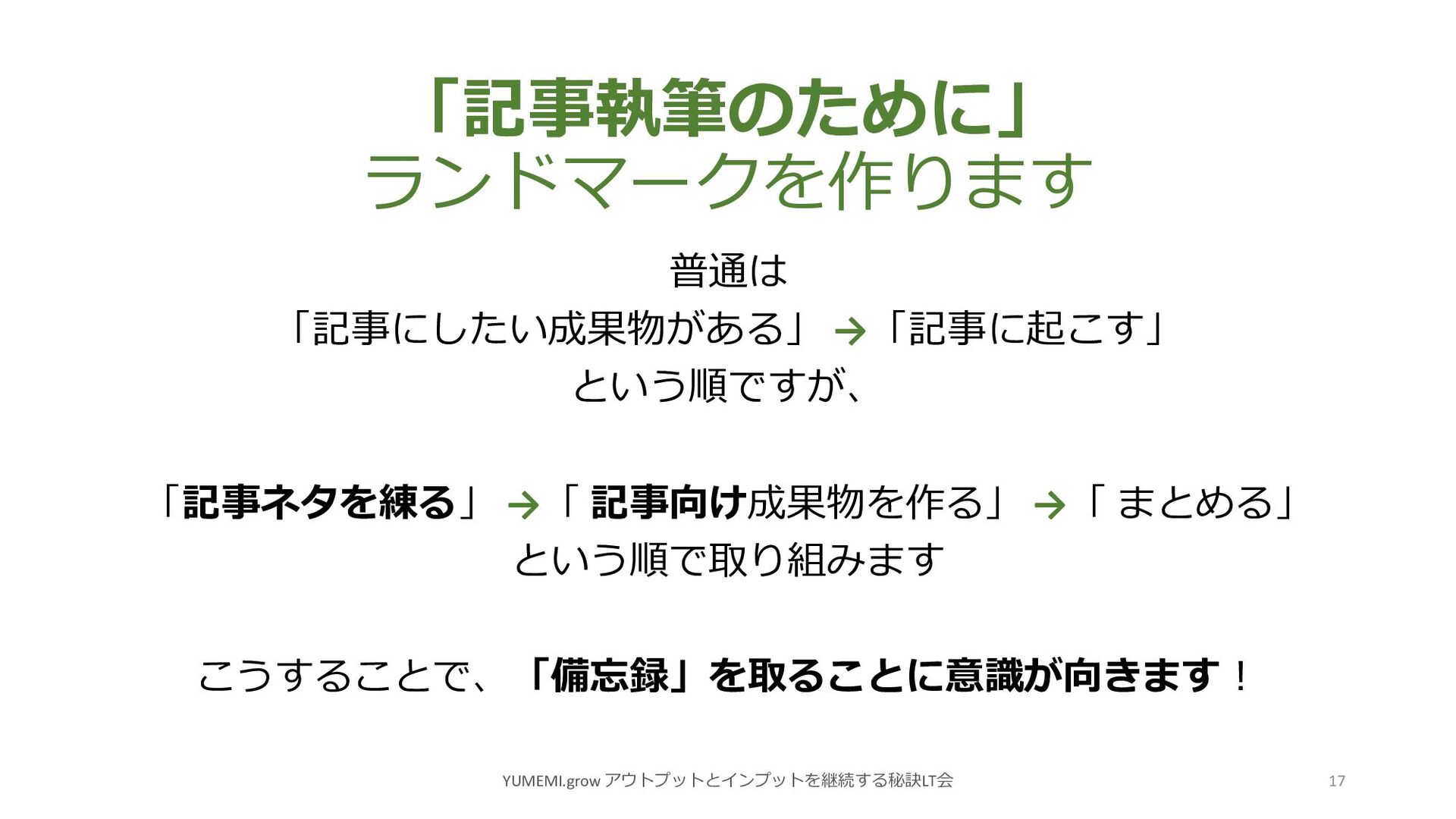 「記事執筆のために」 ランドマークを作ります YUMEMI.grow アウトプットとインプットを継続する秘訣LT会 17 普通は 「記事にしたい成果物がある」 →「記事に起こす」 という順ですが、 「記事ネタを練る」