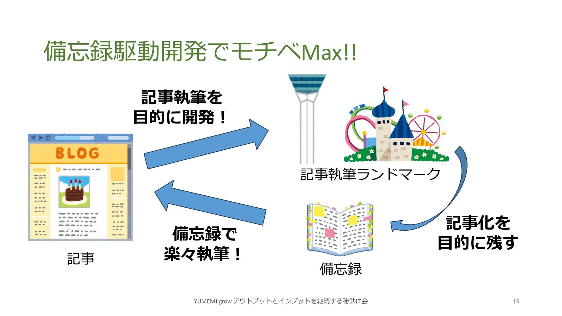 備忘録駆動開発でモチベMax!! YUMEMI.grow アウトプットとインプットを継続する秘訣LT会 19 記事執筆を ⽬的に開発︕ 記事執筆ランドマーク 記事 備忘録 備忘録で
