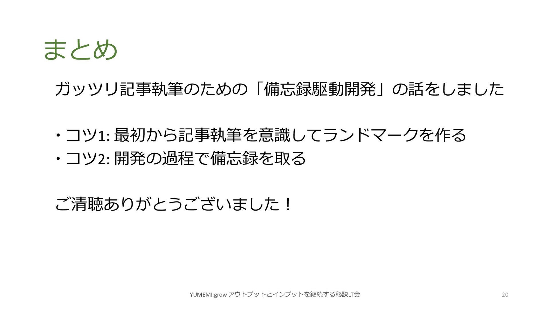 まとめ ガッツリ記事執筆のための「備忘録駆動開発」の話をしました コツ1: 最初から記事執筆を意識してランドマークを作る コツ2: 開発の過程で備忘録を取る ご清聴ありがとうございました︕ YUMEMI.grow