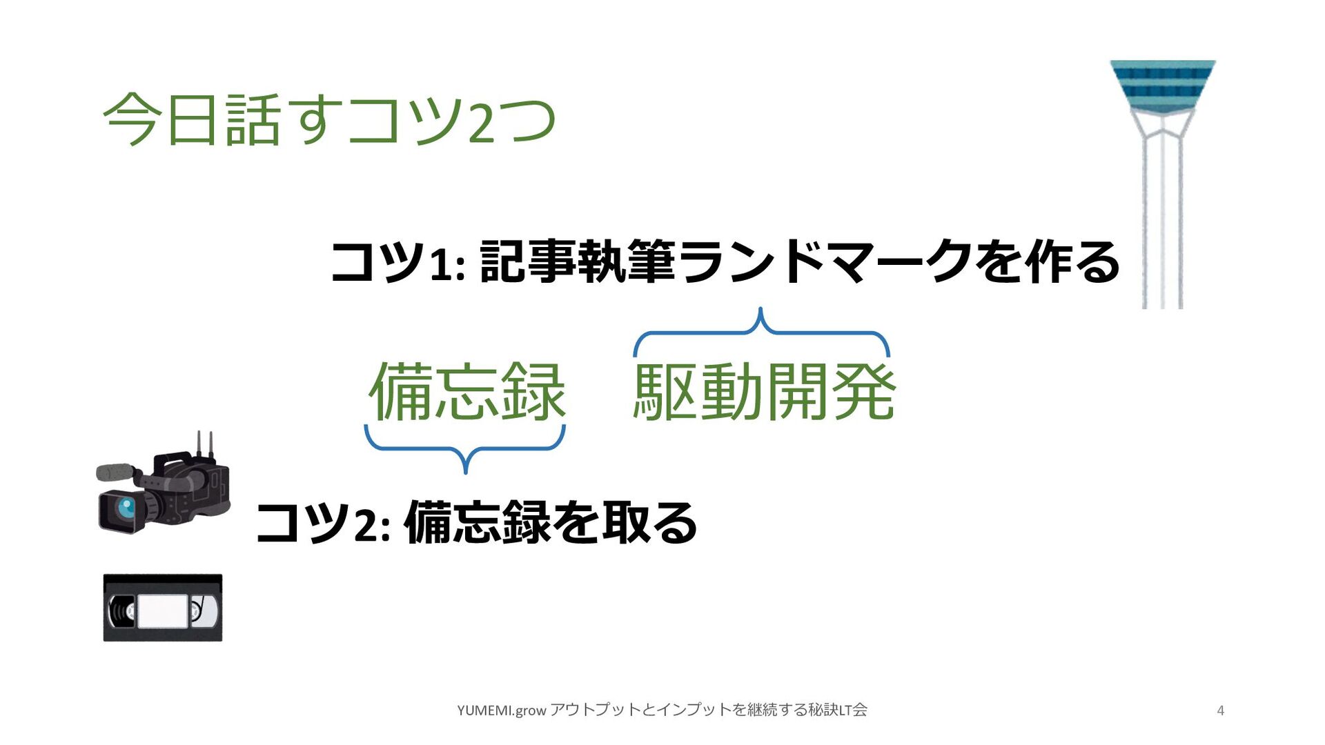 今⽇話すコツ2つ YUMEMI.grow アウトプットとインプットを継続する秘訣LT会 4 備忘録 駆動開発 コツ1: 記事執筆ランドマークを作る コツ2: 備忘録を取る