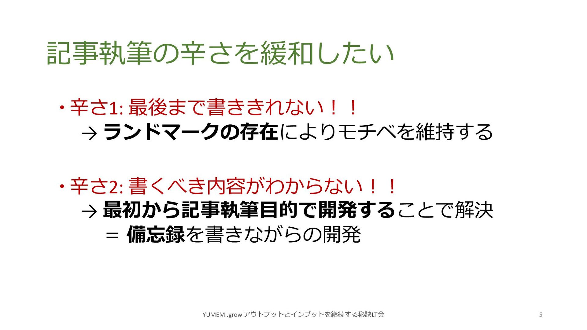 最初から記事執筆⽬的で開発することで解決 = 備忘録を書きながらの開発 YUMEMI.grow アウトプットとインプットを継続する秘訣LT会 5