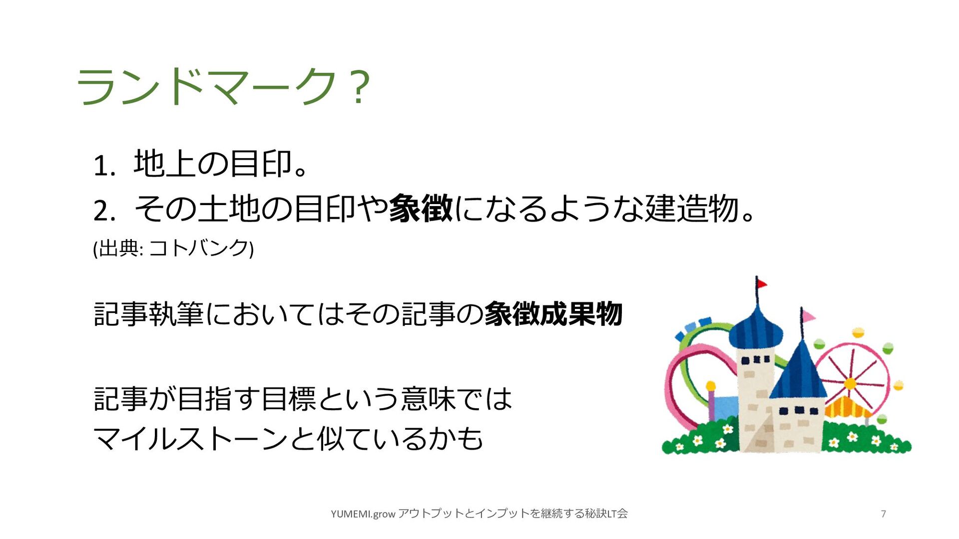 ランドマーク︖ YUMEMI.grow アウトプットとインプットを継続する秘訣LT会 7 1. 地上の⽬印。 2. その⼟地の⽬印や象徴になるような建造物。 (出典: コトバンク)