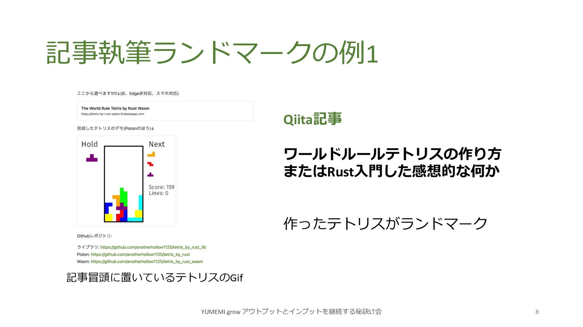記事執筆ランドマークの例1 YUMEMI.grow アウトプットとインプットを継続する秘訣LT会 8 Qiita記事 ワールドルールテトリスの作り⽅ またはRust⼊⾨した感想的な何か 作ったテトリスがランドマーク 記事冒頭に置いているテトリスのGif