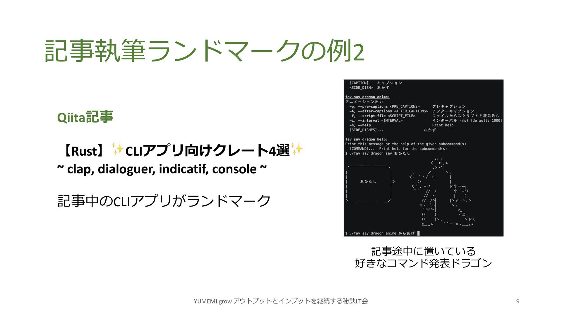 記事執筆ランドマークの例2 YUMEMI.grow アウトプットとインプットを継続する秘訣LT会 9 Qiita記事 【Rust】✨CLIアプリ向けクレート4選✨ ~ clap, dialoguer, indicatif,