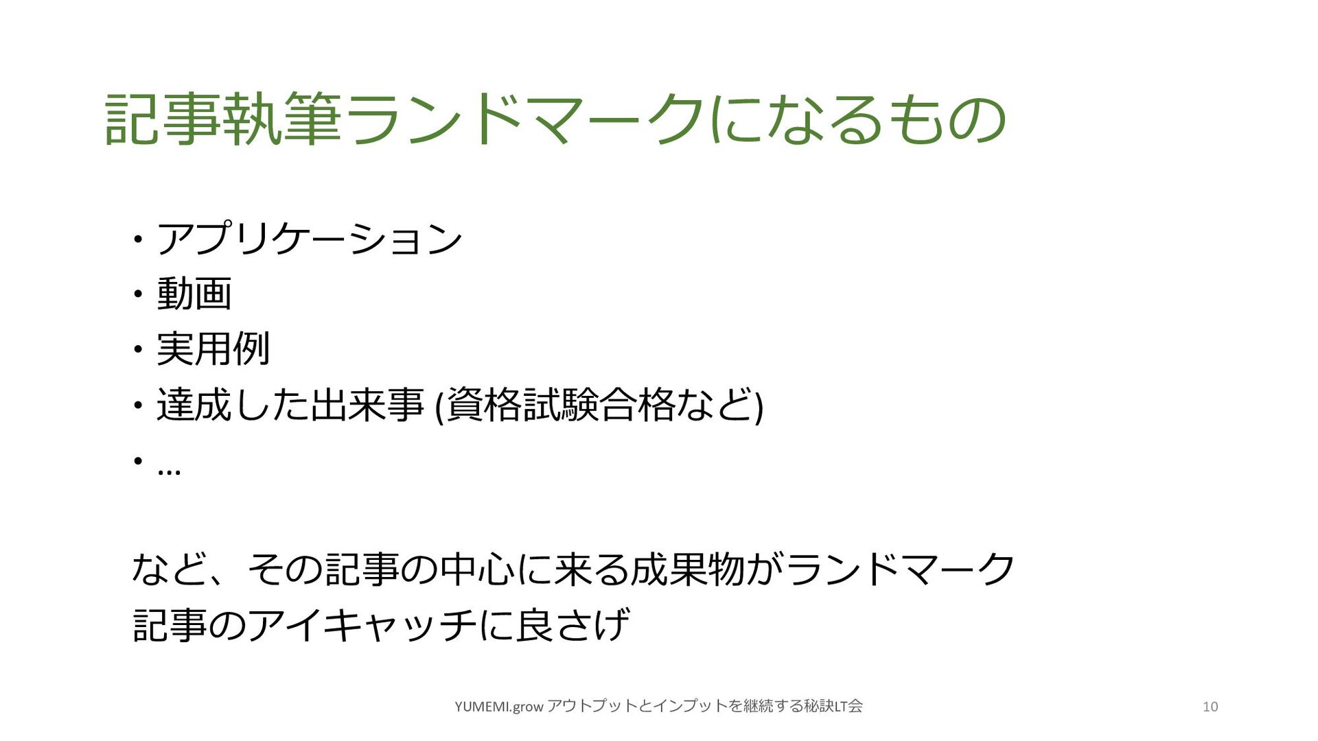 記事執筆ランドマークになるもの YUMEMI.grow アウトプットとインプットを継続する秘訣LT会 10 アプリケーション 動画 実⽤例