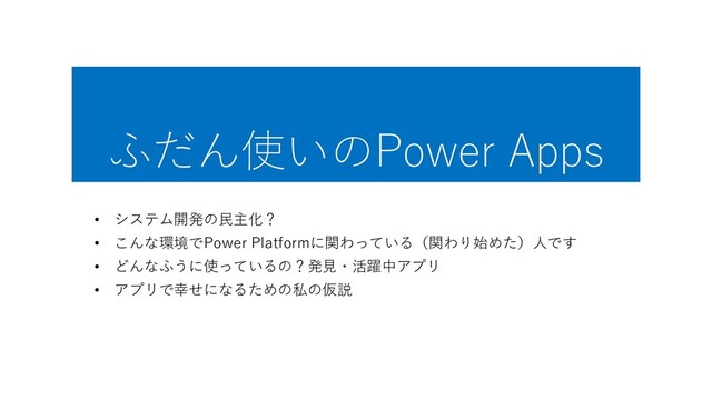 ふだん使いのPower Apps • システム開発の民主化? • こんな環境でPower Platformに関わっている(関わり始めた)人です • どんなふうに使っているの?発見・活躍中アプリ •