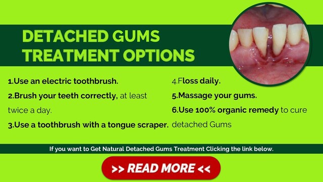 teeth correctly, at least twice a day. 3.Use a toothbrush with a tongue scraper. 4.Floss daily. 5.Massage your gums. 6.Use 100% organic remedy to cure detached Gums >> READ MORE << If you want to Get Natural Detached Gums Treatment Clicking the link below.