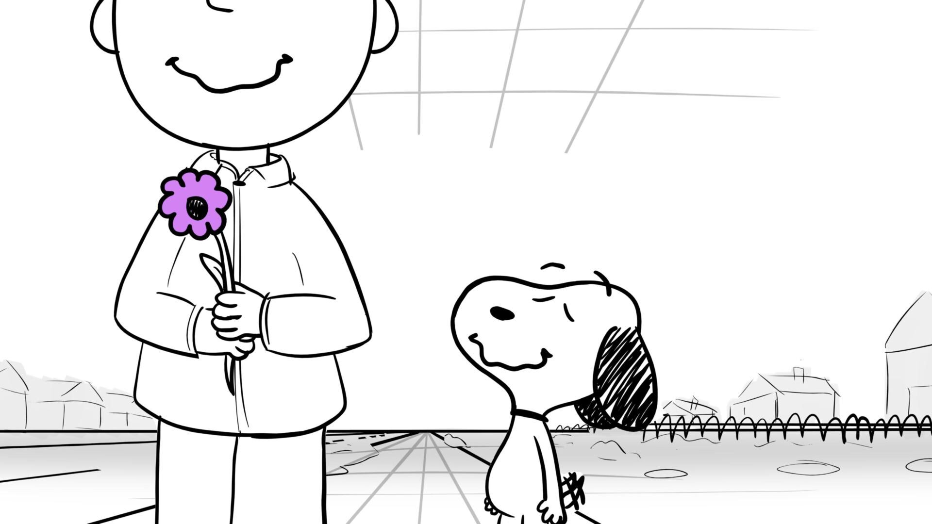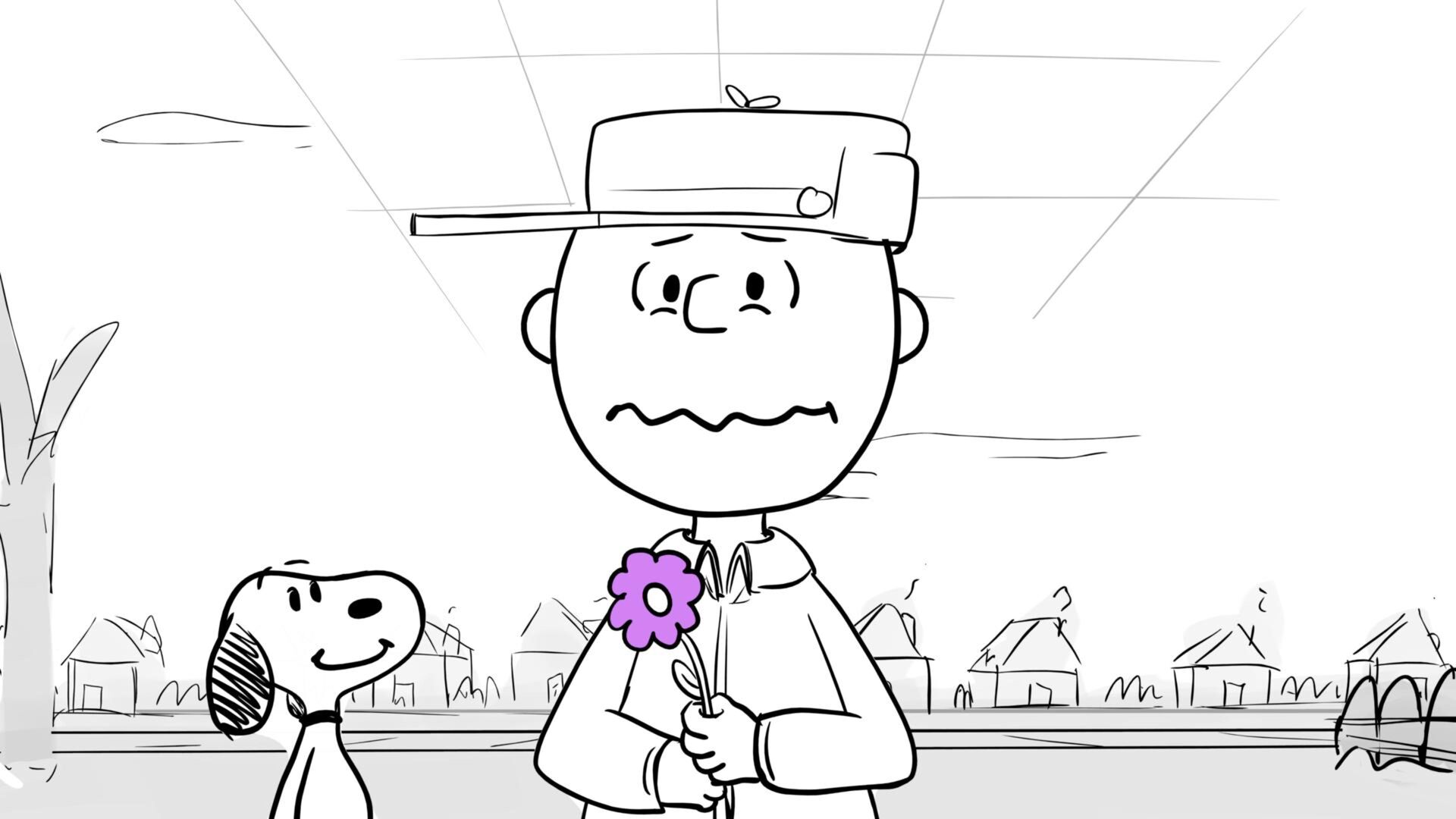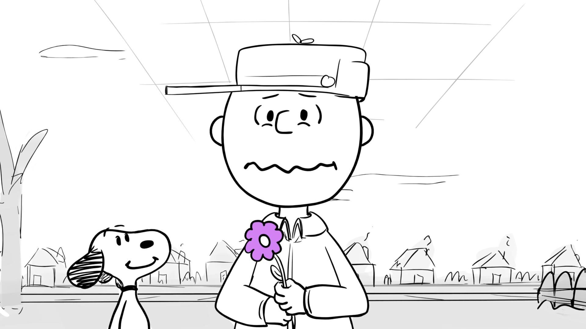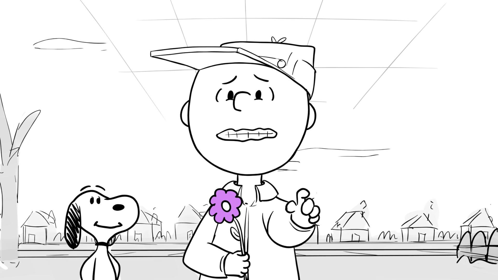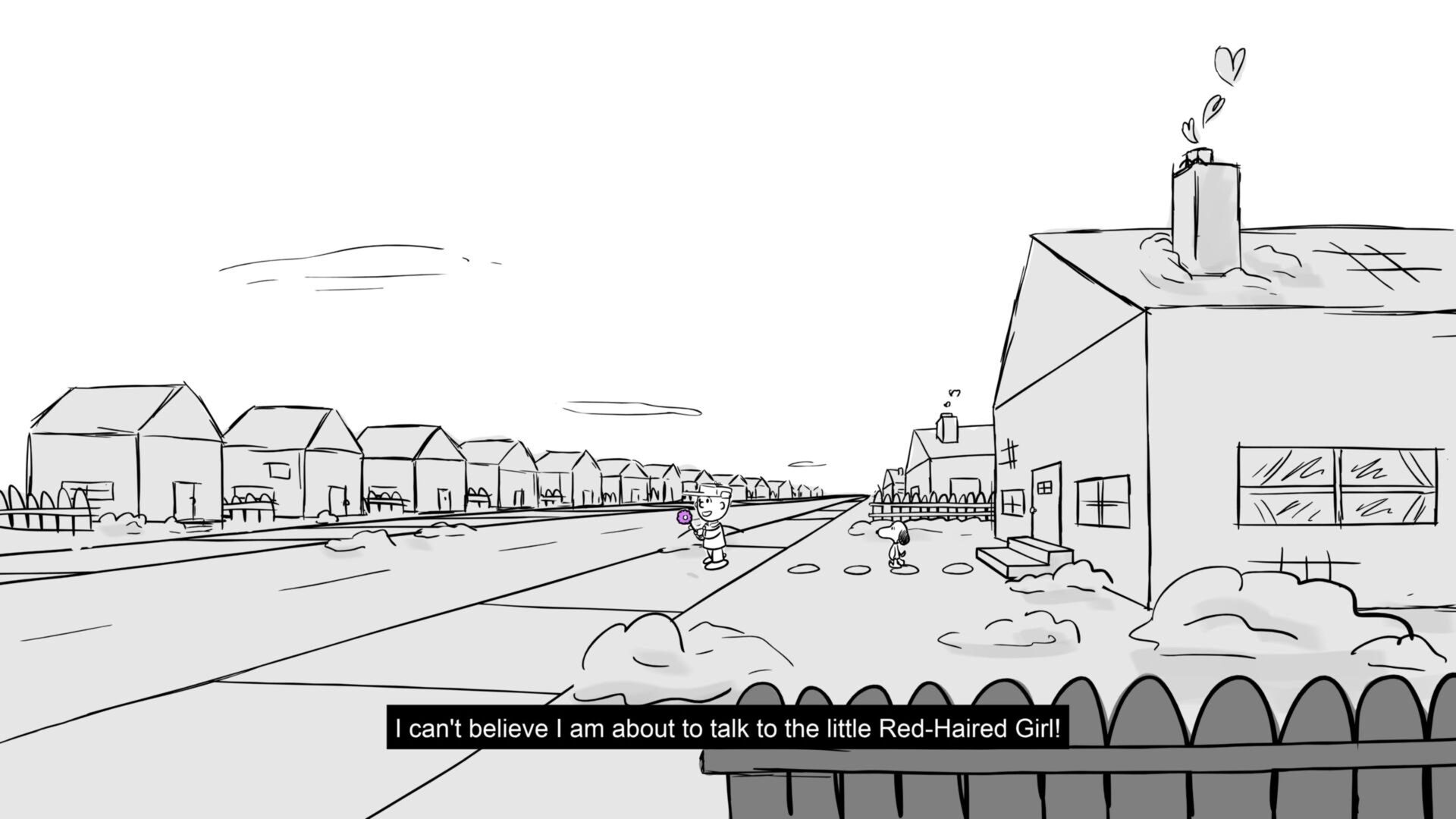 Charlie Brown anxiously plans on giving the little Red-Haired girl a purple flower with the help of his friend Snoopy.