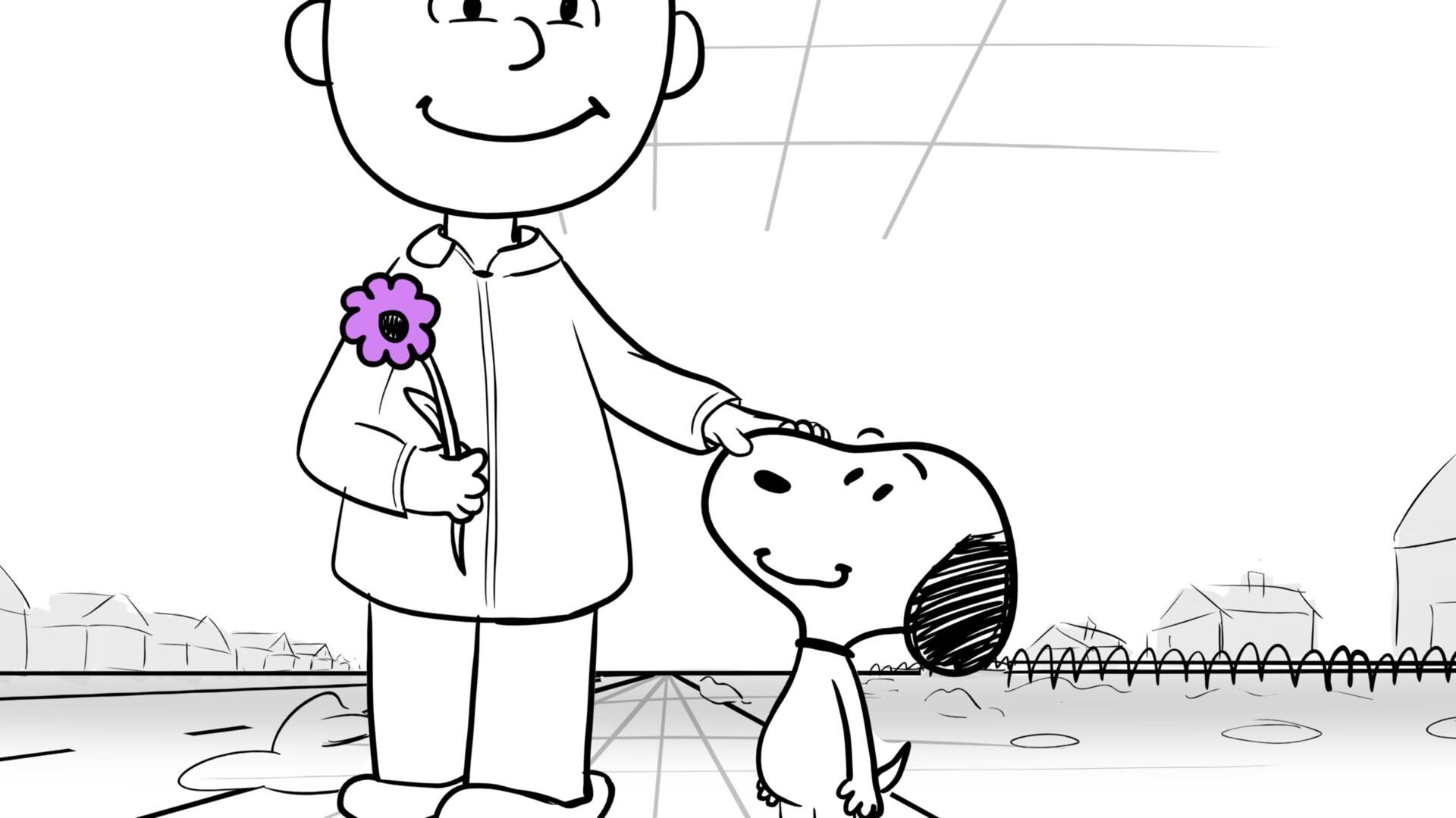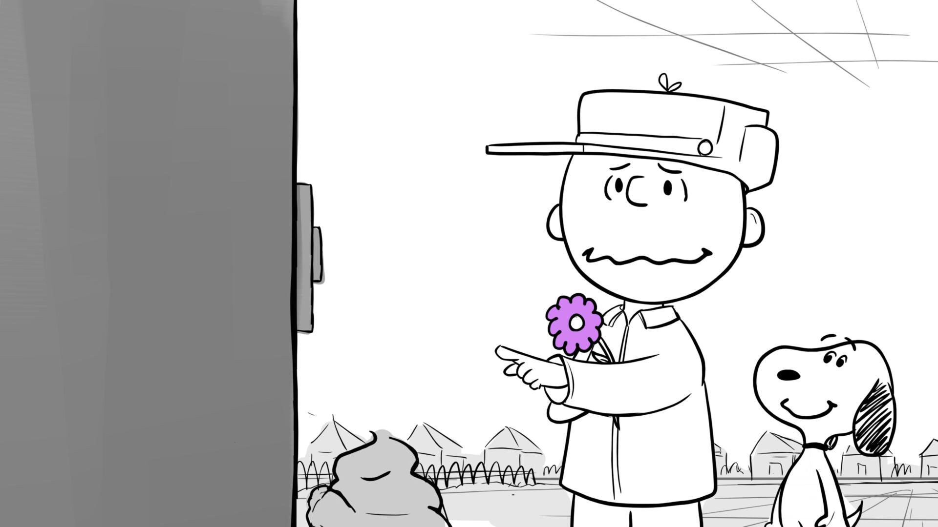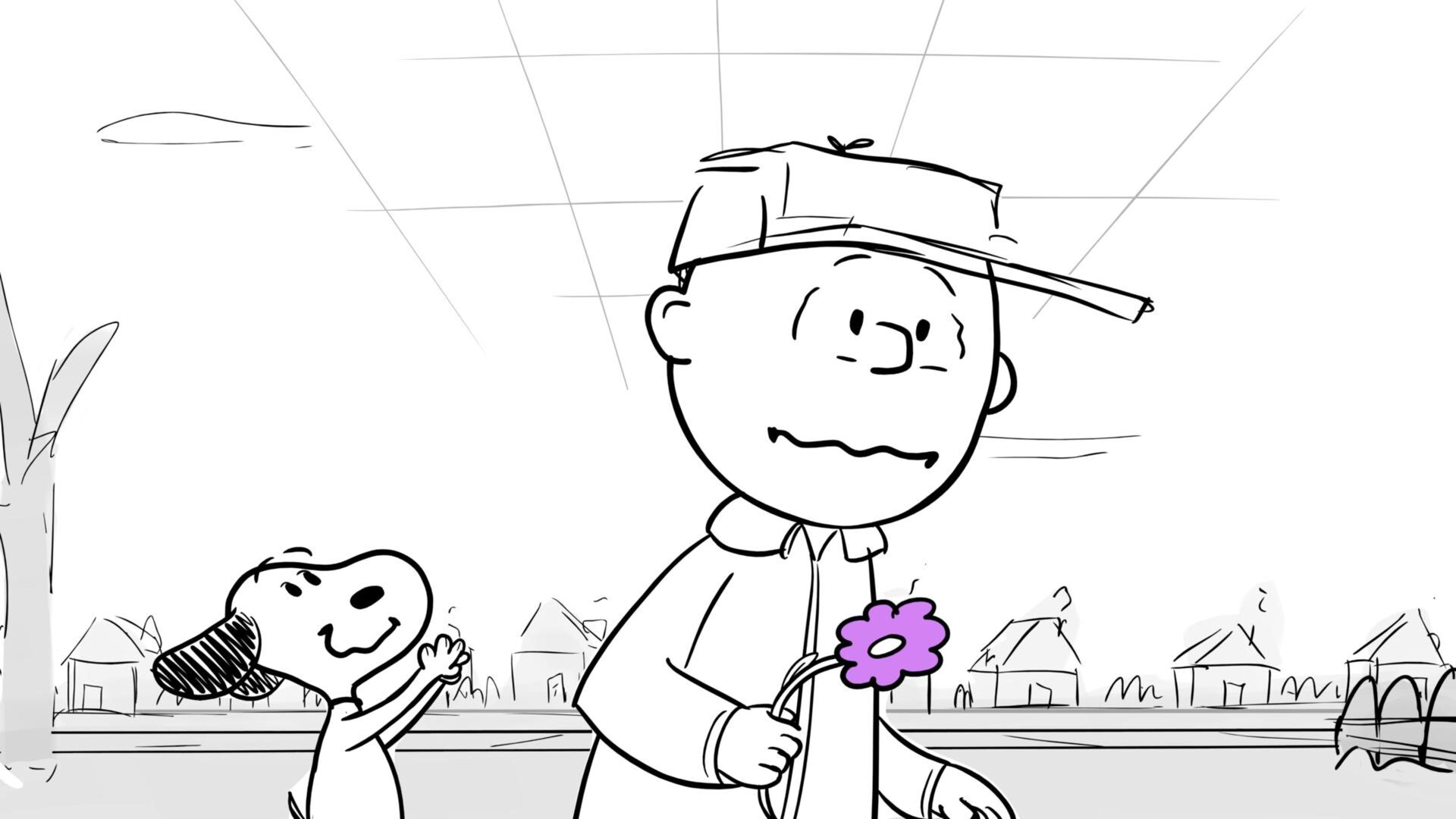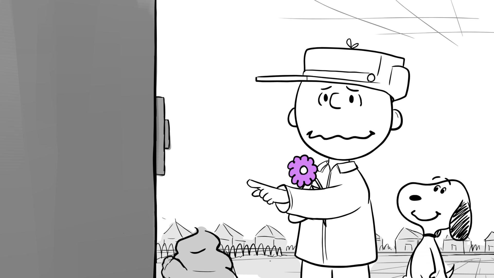 Charlie Brown anxiously plans on giving the little Red-Haired girl a purple flower with the help of his friend Snoopy.