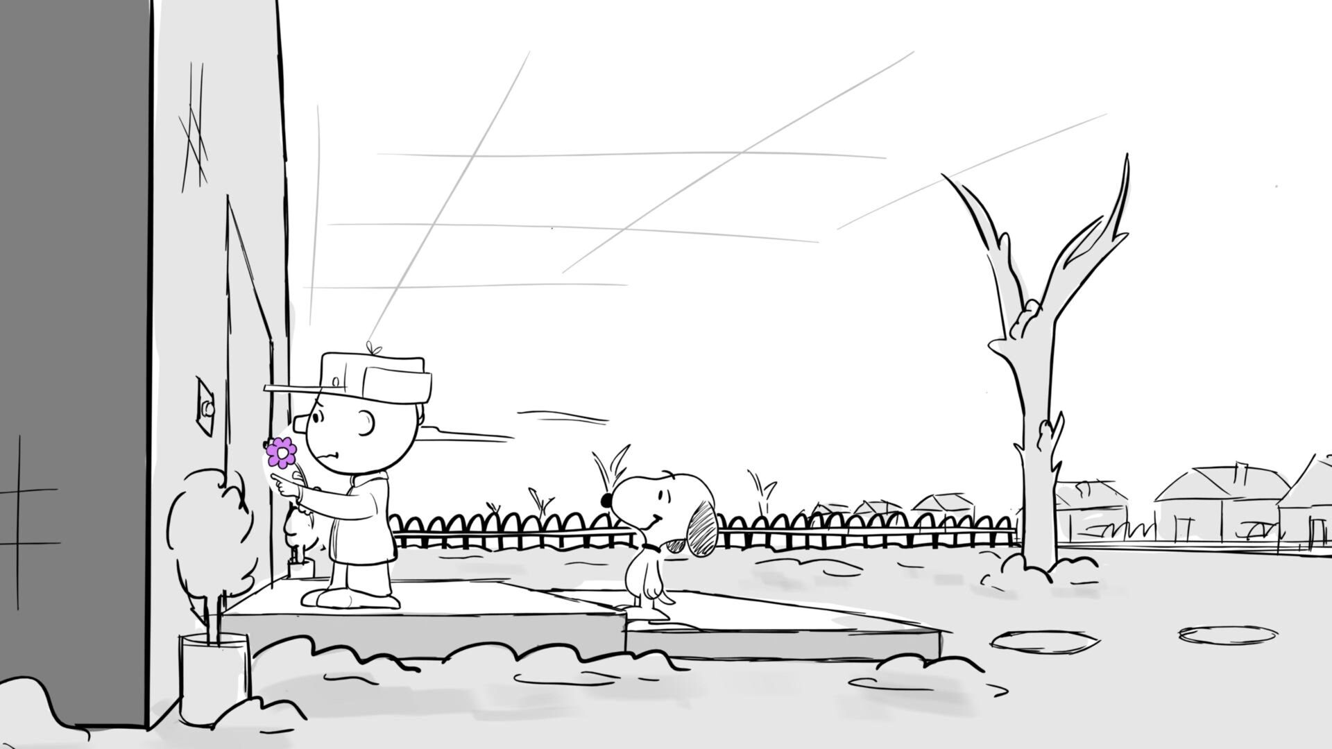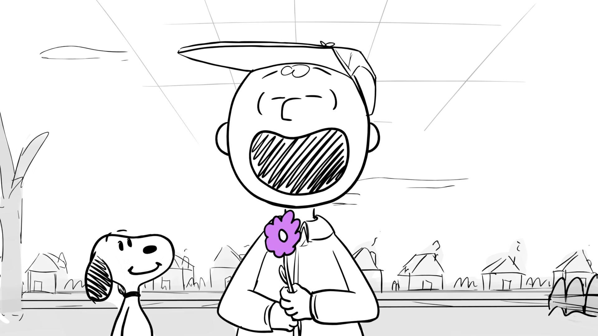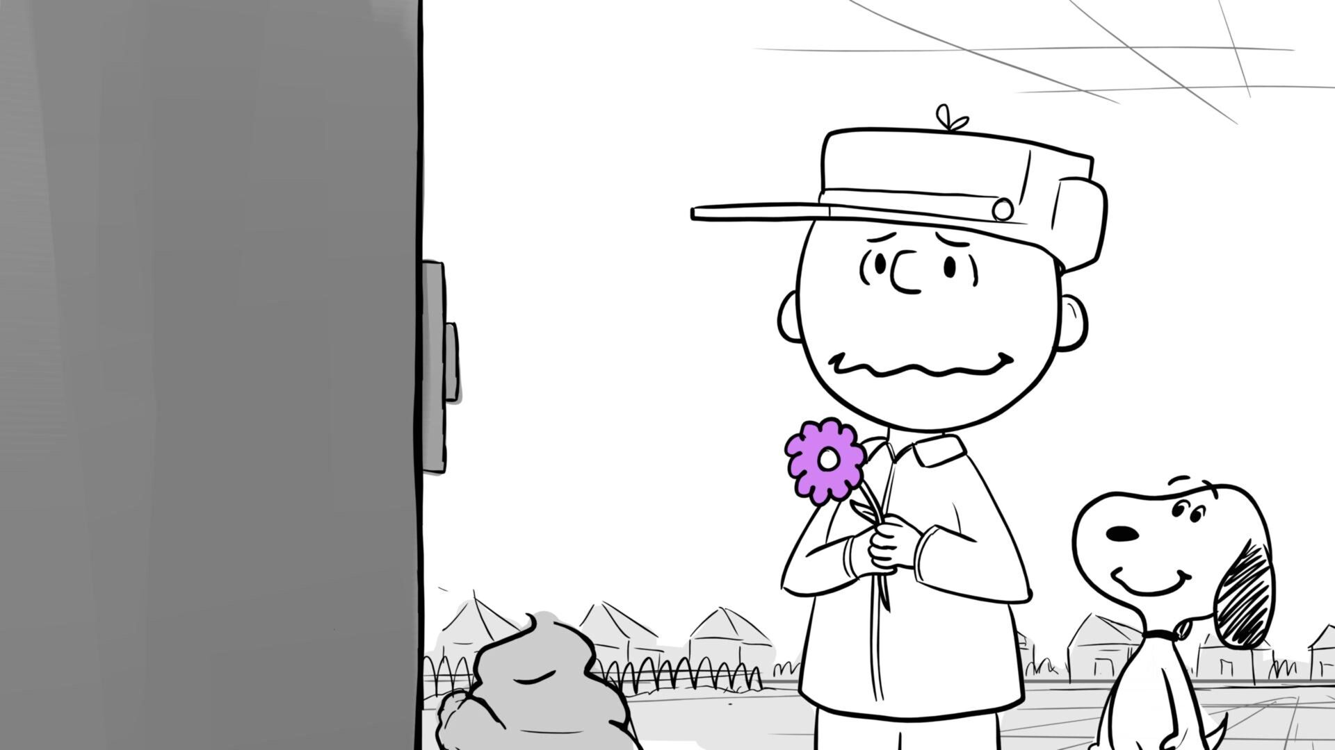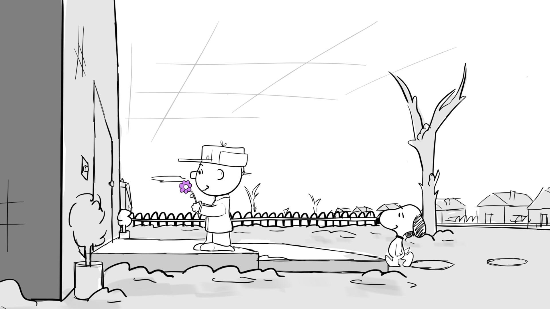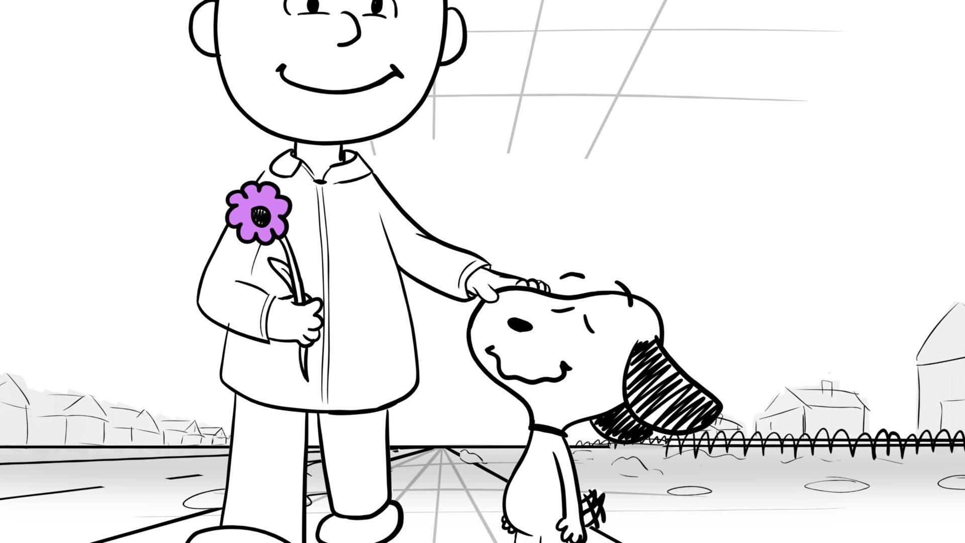 Charlie Brown anxiously plans on giving the little Red-Haired girl a purple flower with the help of his friend Snoopy.
