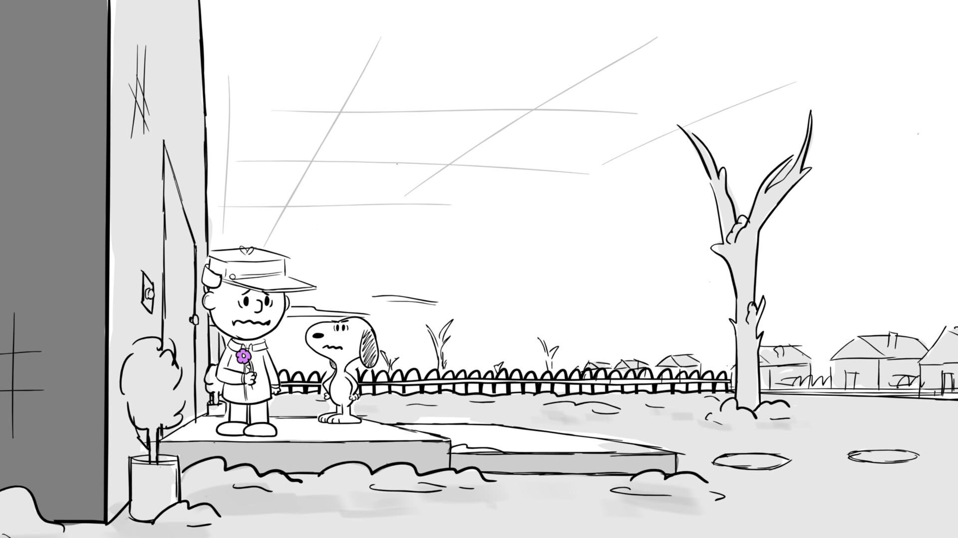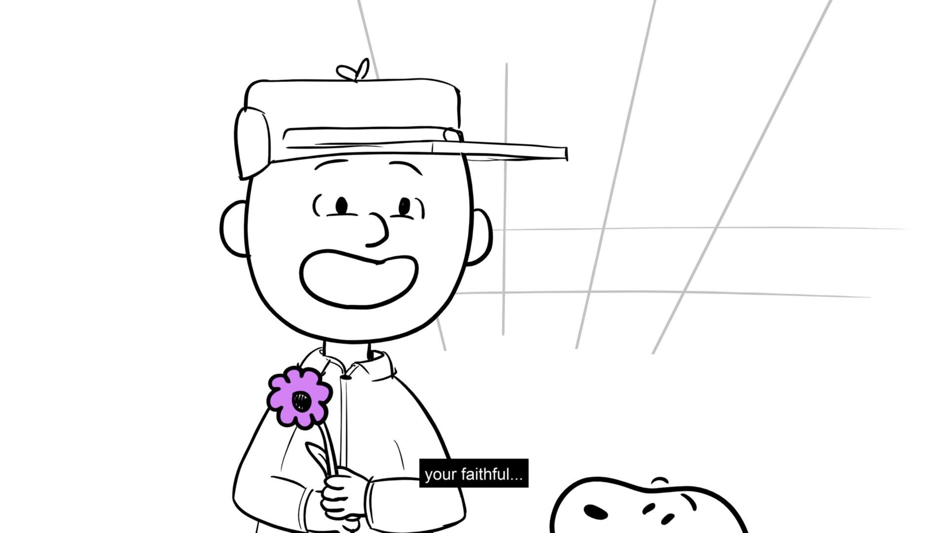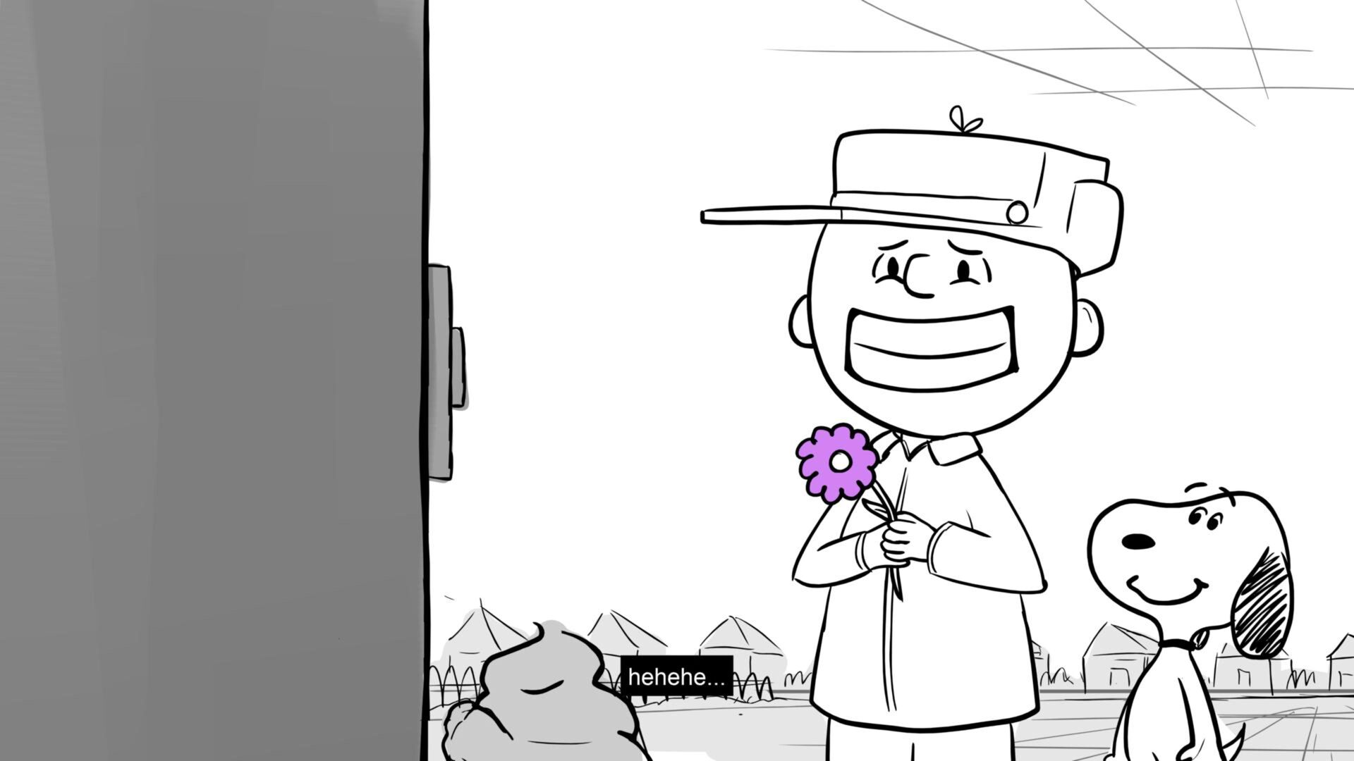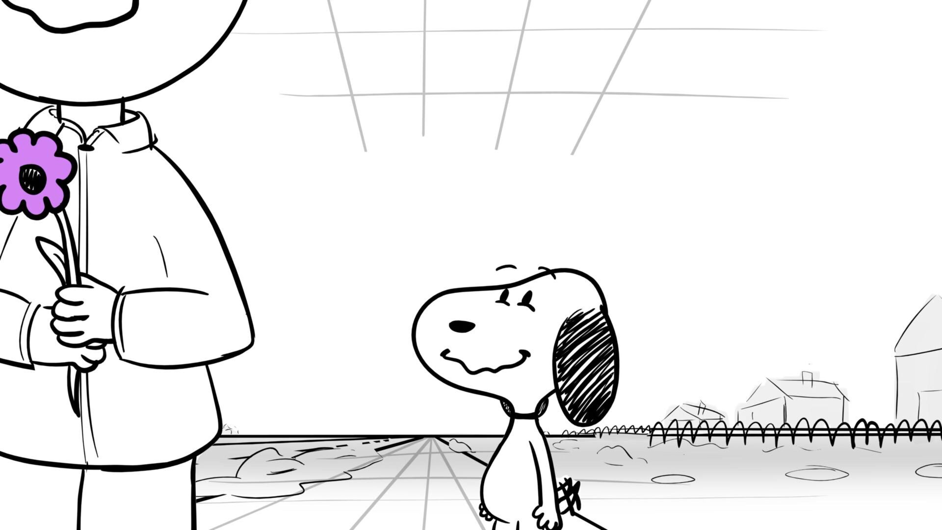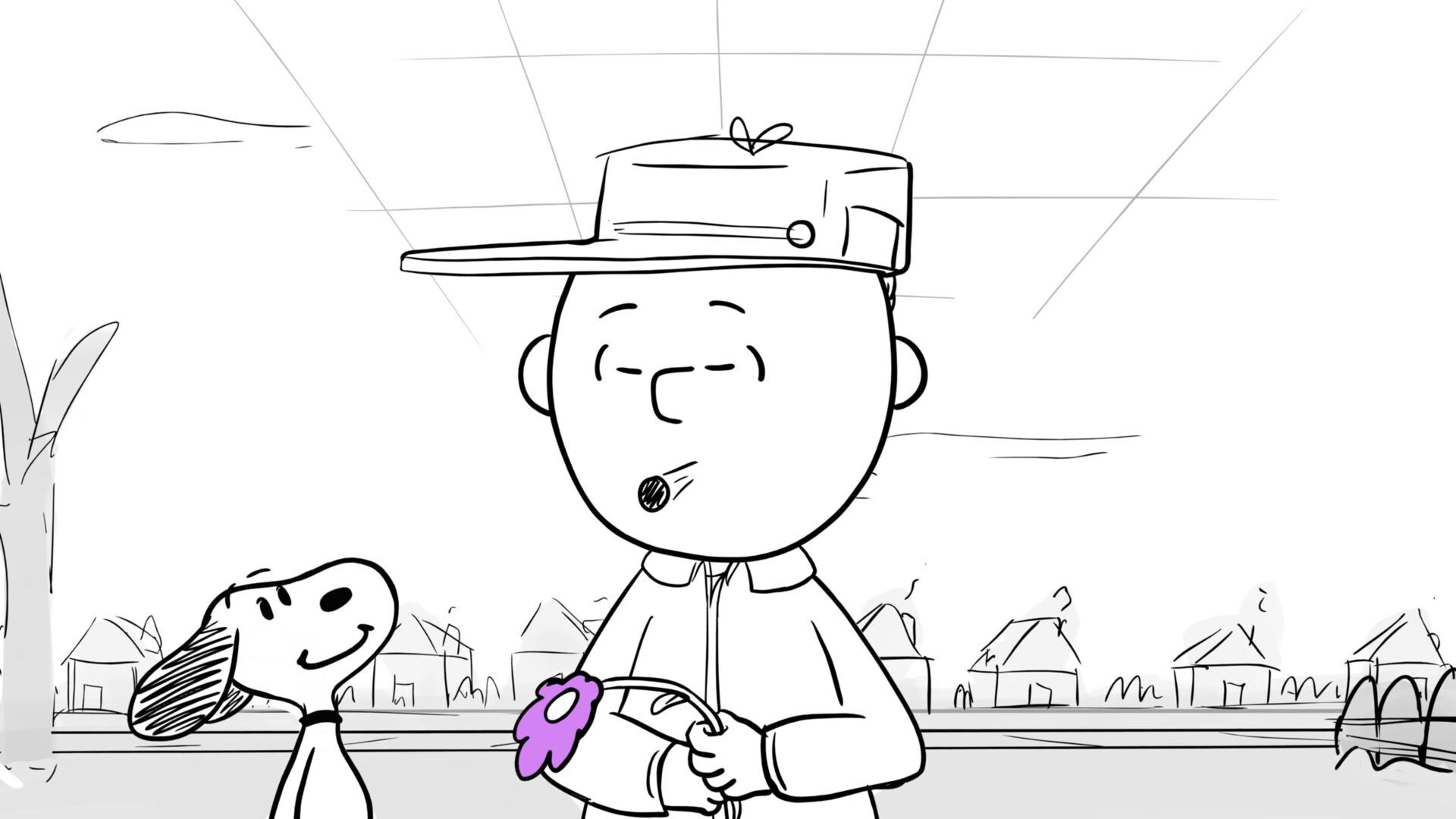 Charlie Brown anxiously plans on giving the little Red-Haired girl a purple flower with the help of his friend Snoopy.