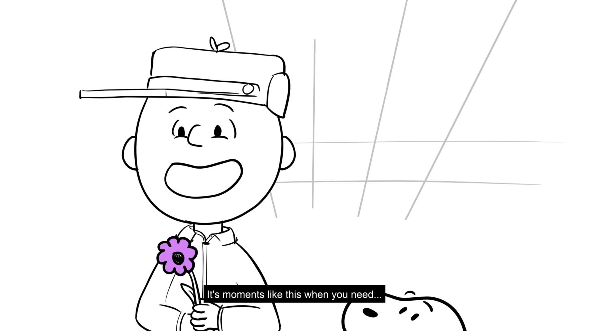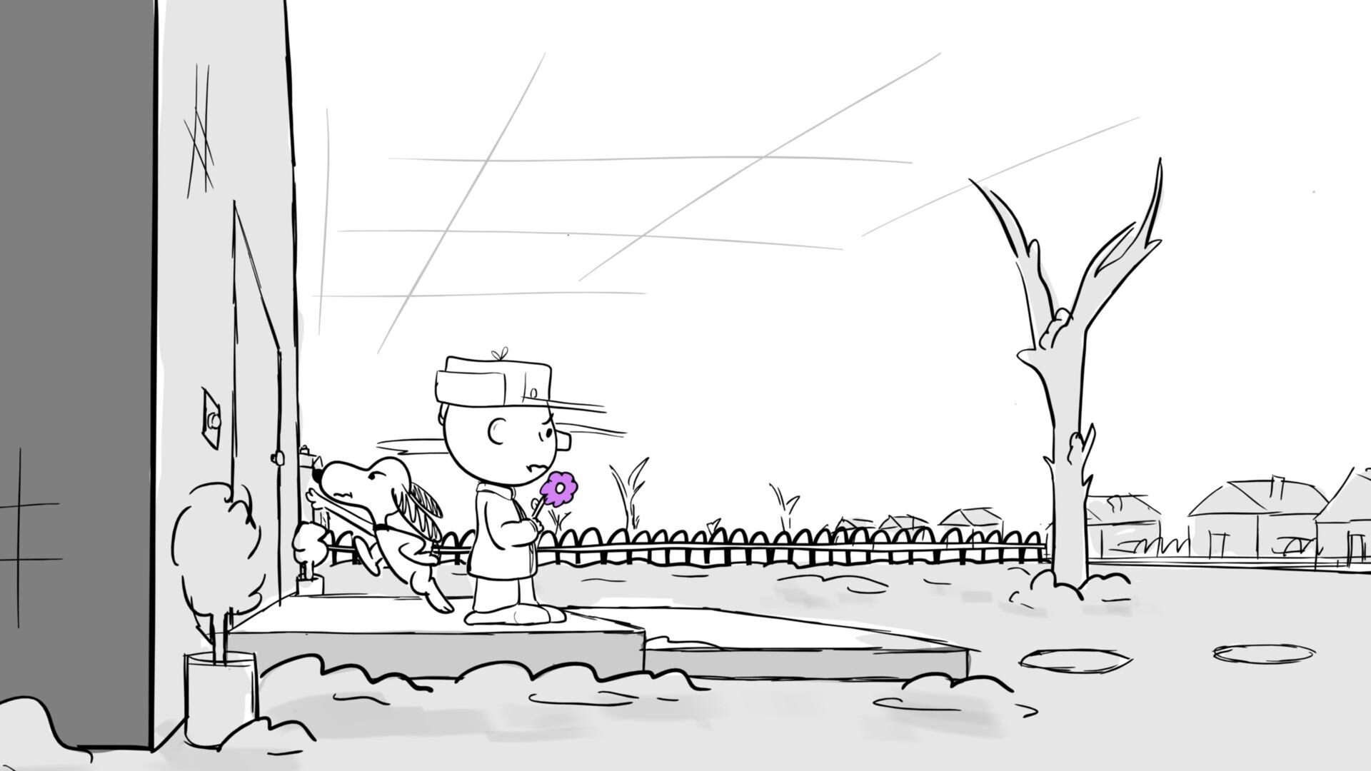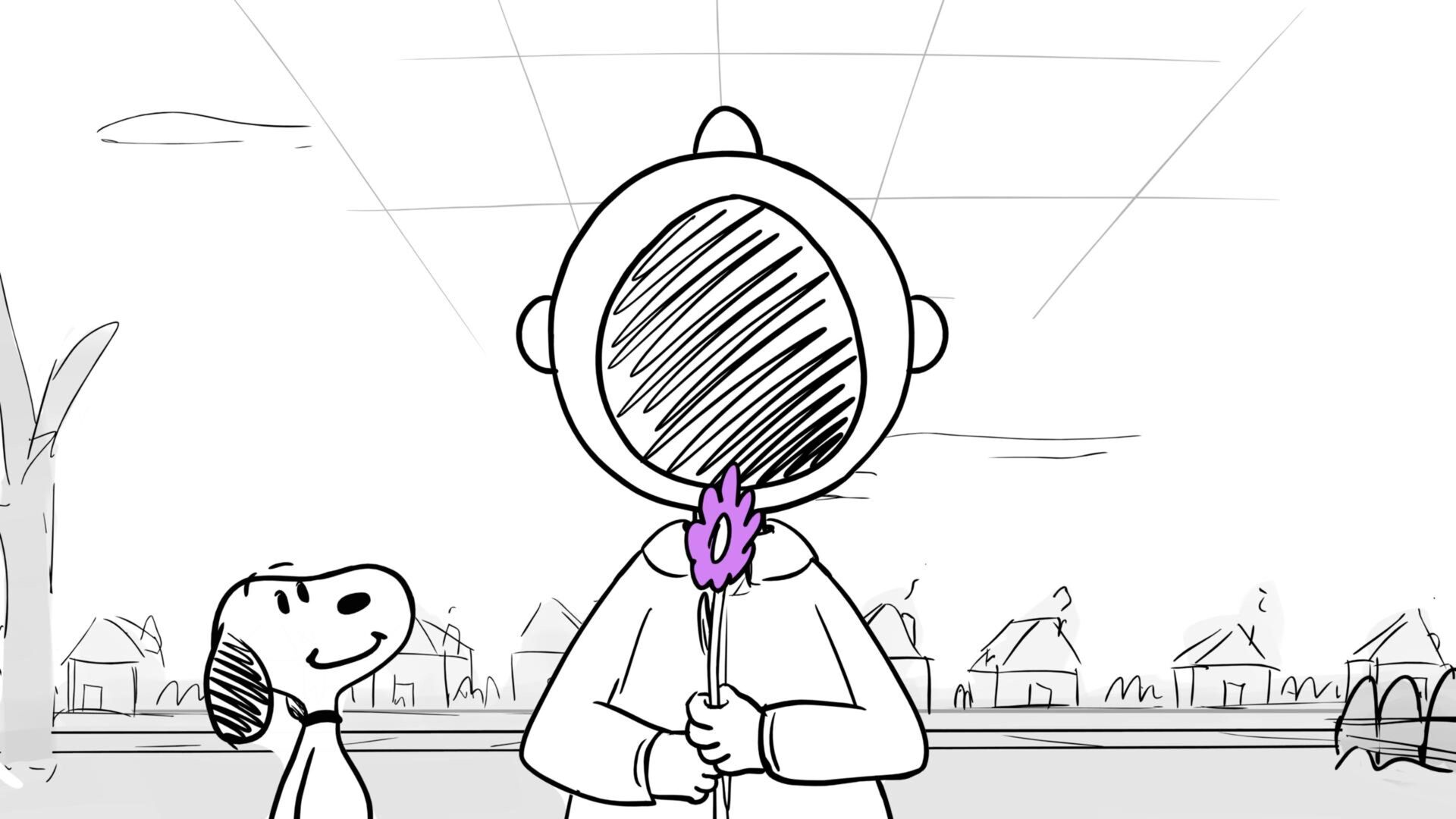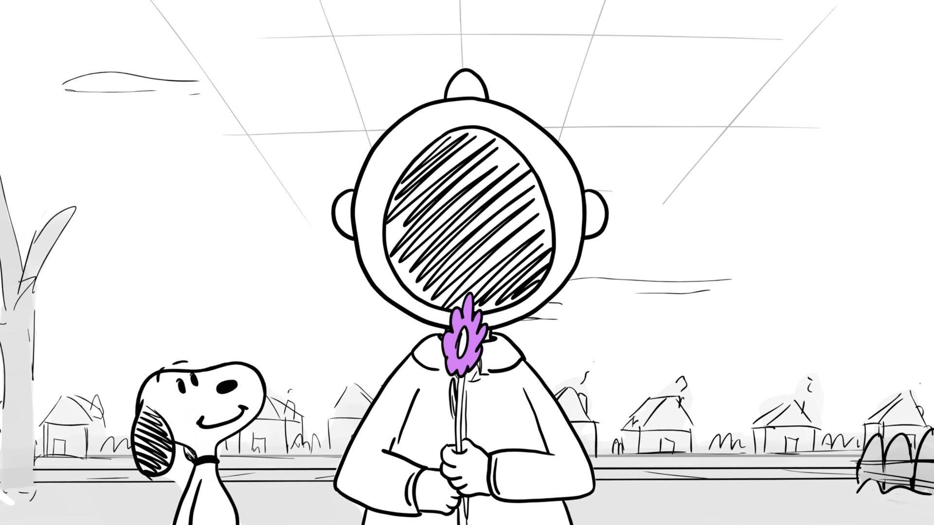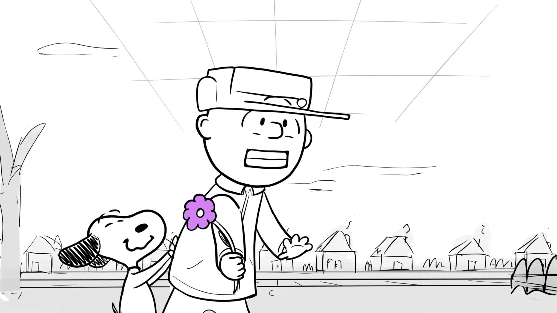 Charlie Brown anxiously plans on giving the little Red-Haired girl a purple flower with the help of his friend Snoopy.