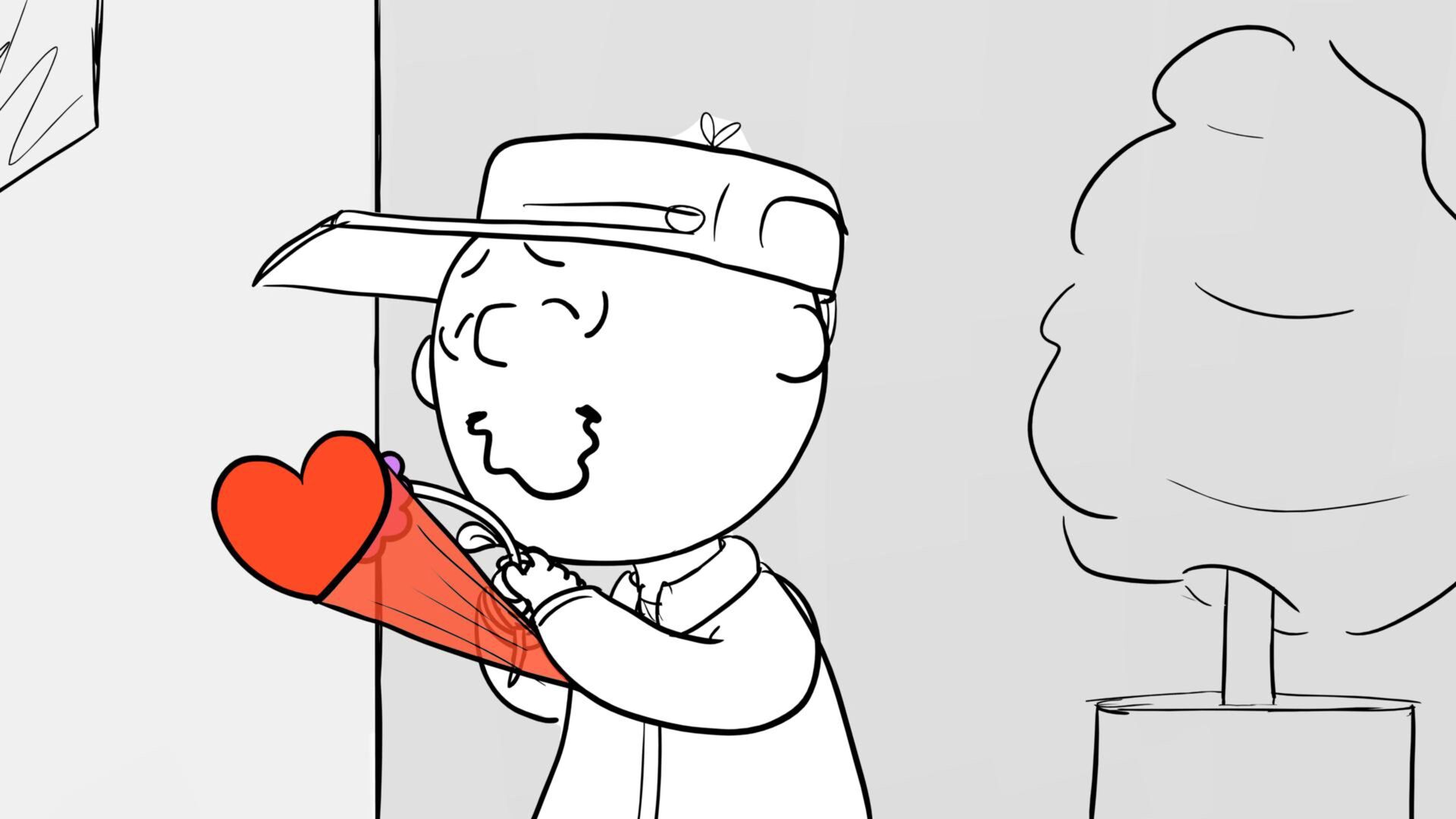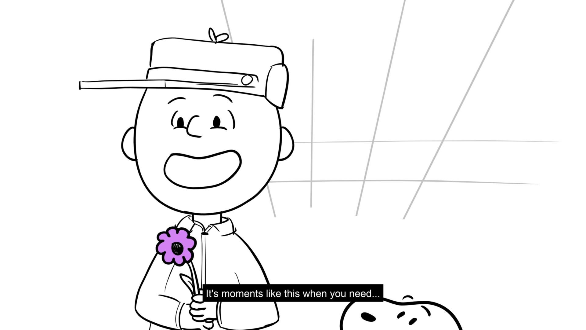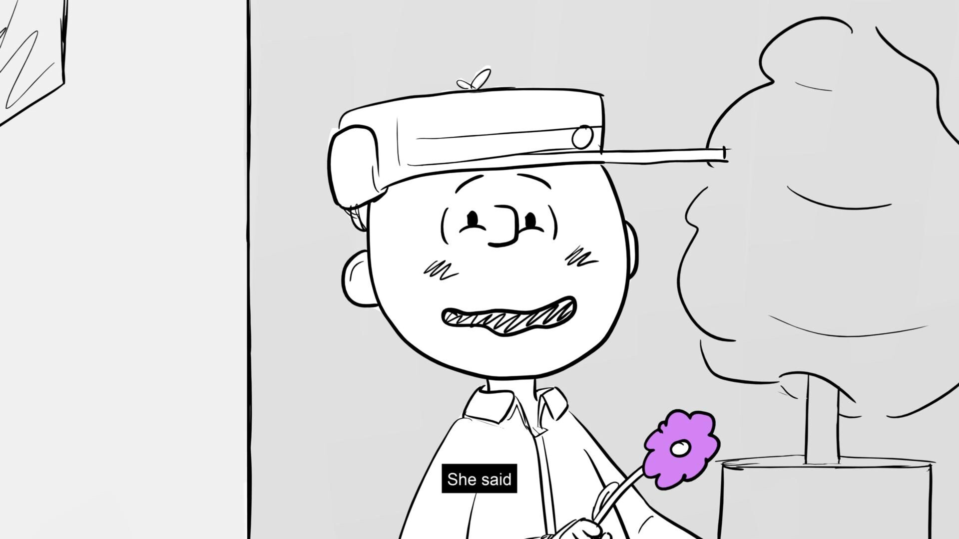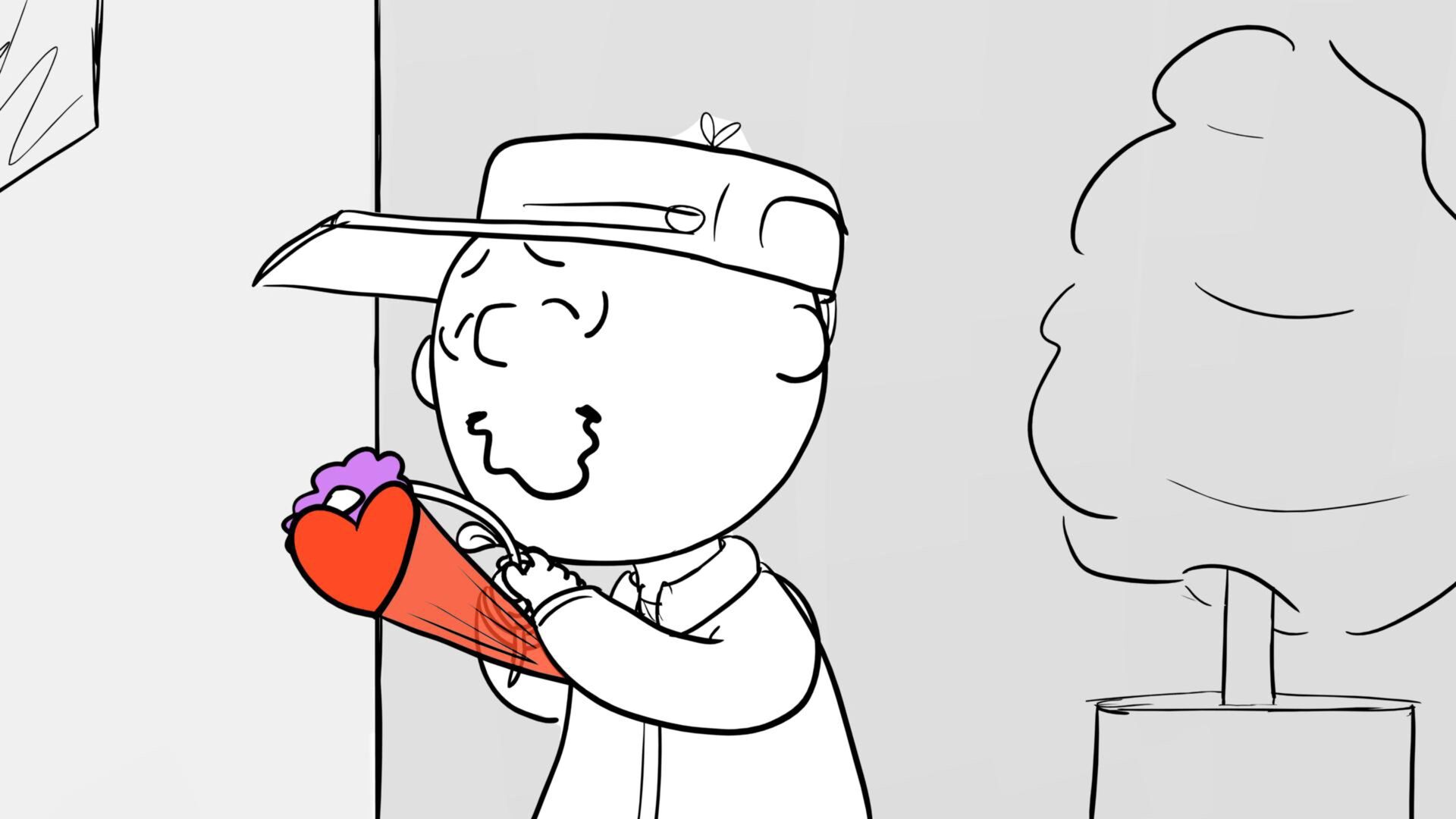 Charlie Brown anxiously plans on giving the little Red-Haired girl a purple flower with the help of his friend Snoopy.